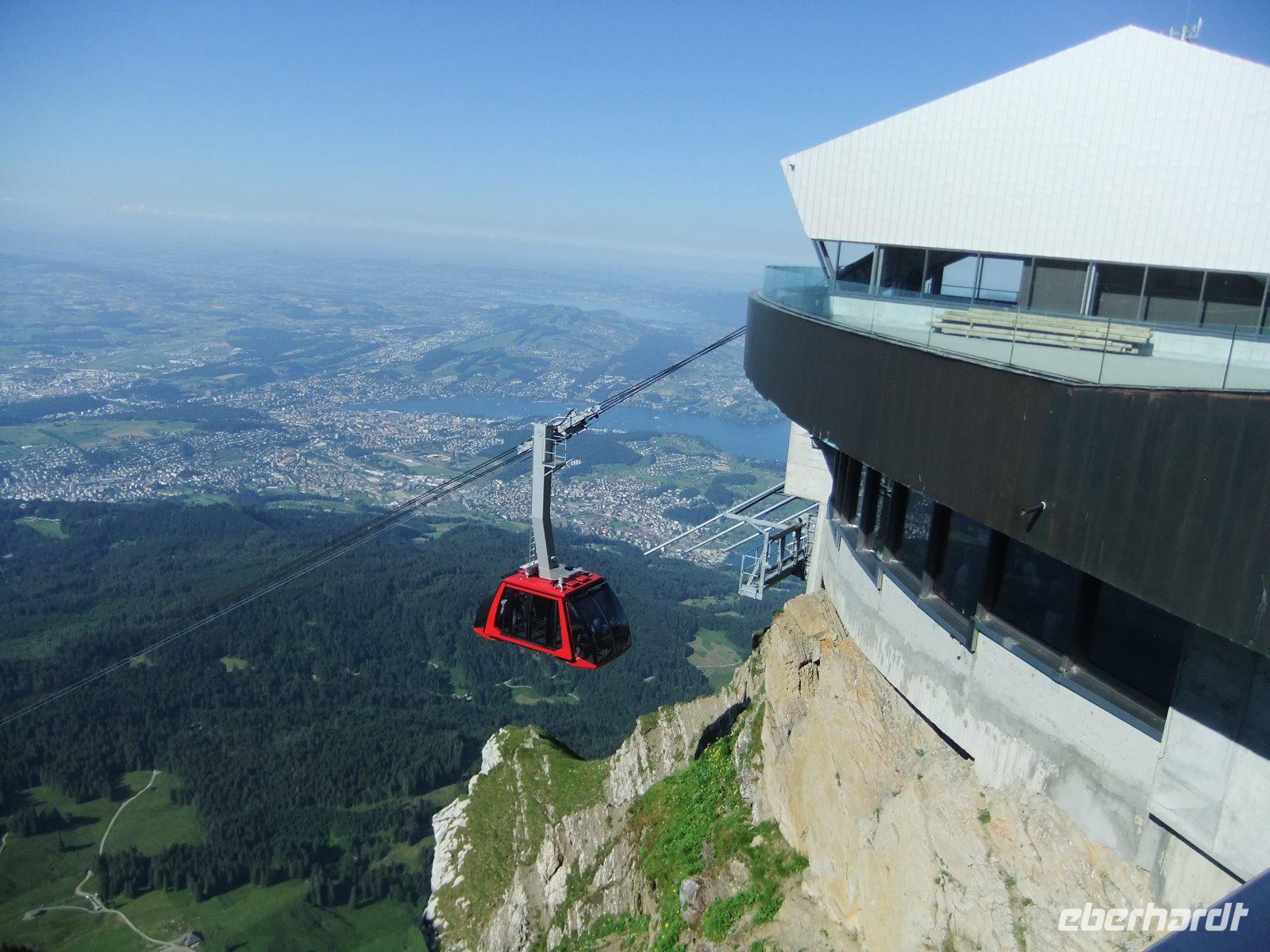 So schön, wie der gestrige Tag endete, beginnt auch der heutige. Die meisten Gäste haben sich den Wecker gestellt, um bereits 5.56 Uhr wieder auf dem Esel zu stehen und die aufgehende Sonne zu begrüßen. Alle genießen den Morgen in den Bergen und es fällt schwer, sich nach dem Frühstück von diesem Panoramablick zu trennen. Doch wir müssen weiter, und so fahren wir mit der neuen Luftseilbahn hinunter zur Station Fräkmüntegg und von hier weiter mit den 4er-Kabinenbahnen nach Kriens, wo Mike schon wartet und uns nach Luzern bringt.