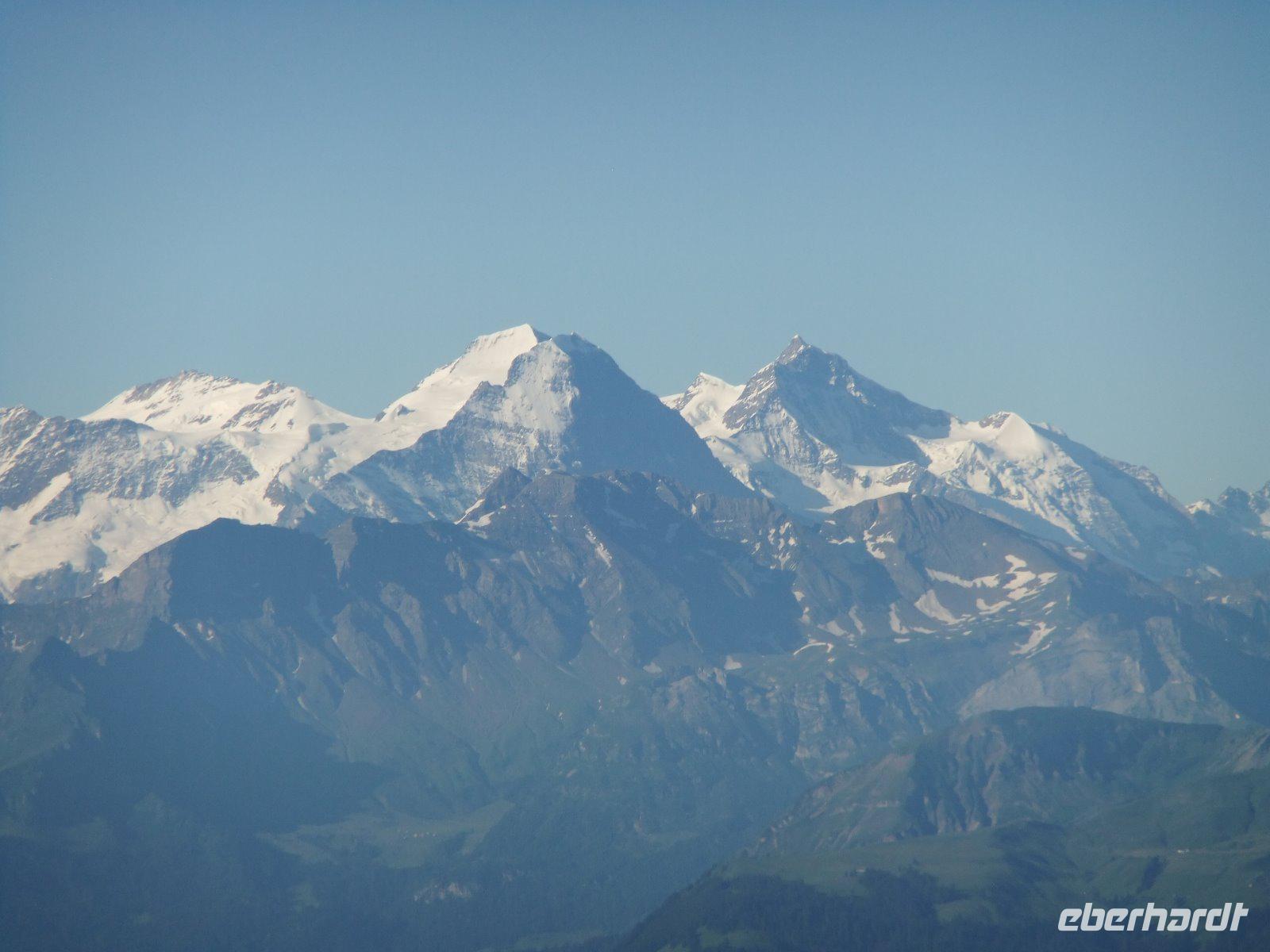 Unser heutiges Ziel ist Thun. Deshalb fahren wir ans andere Ende von Interlaken, wo der Thuner See beginnt. Es geht am Südufer entlang und bald fällt uns ein kegelförmiger Berg auf: der Niesen. Im Zusammenhang mit ihm wird oft folgende Wetterregel zitiert: Hat der Niesen einen Hut, wird das Wetter schön und gut. Hat der Niesen einen Kragen, darfst du es auch noch wagen. Hat er aber Mantel um und Degen, gibt es Sturmwind und Regen. Gegenüber sehen wir am Hang den kleinen Ort Beatenberg liegen, darüber erhebt sich das Niederhorn.