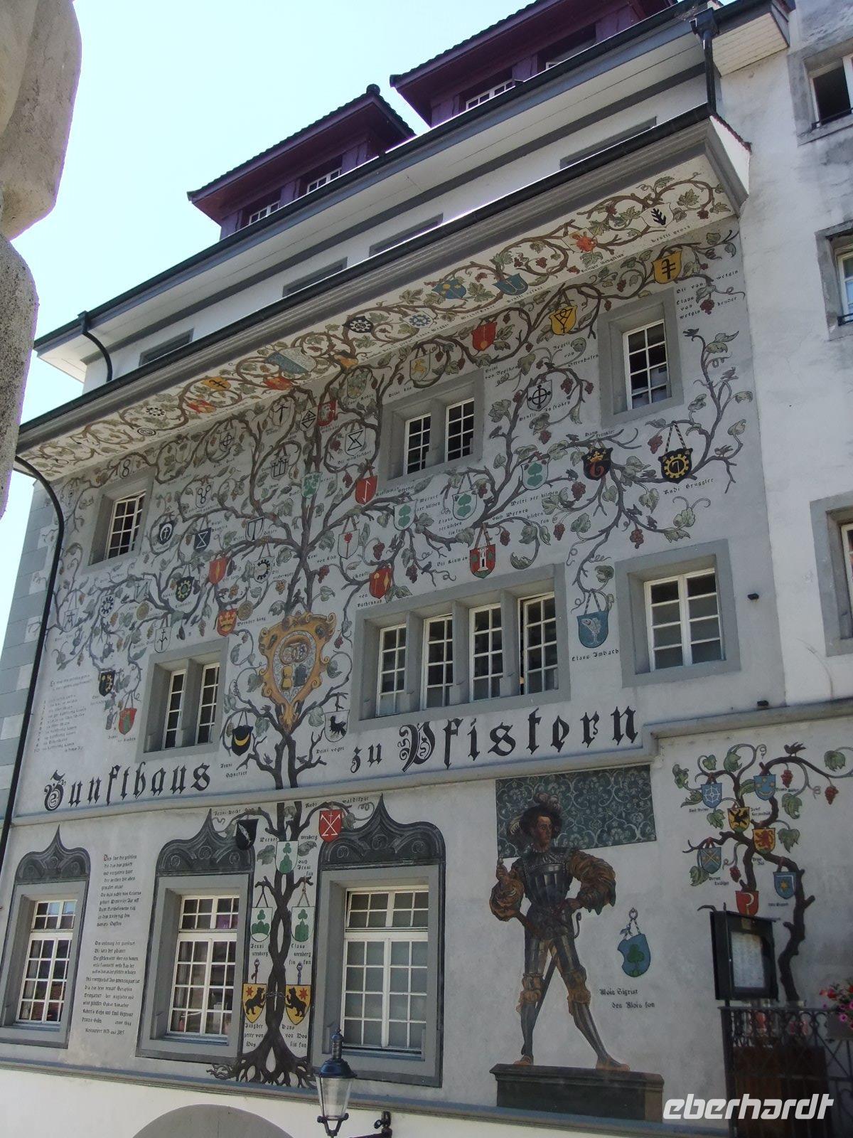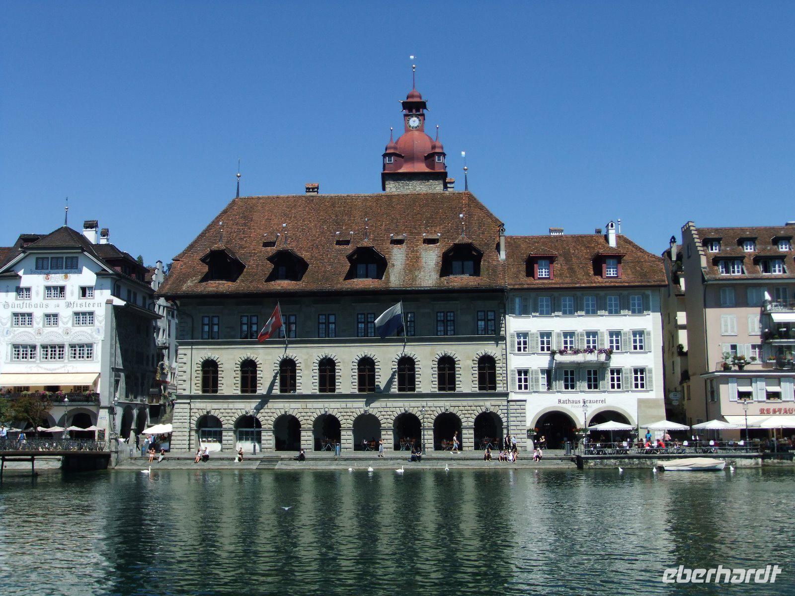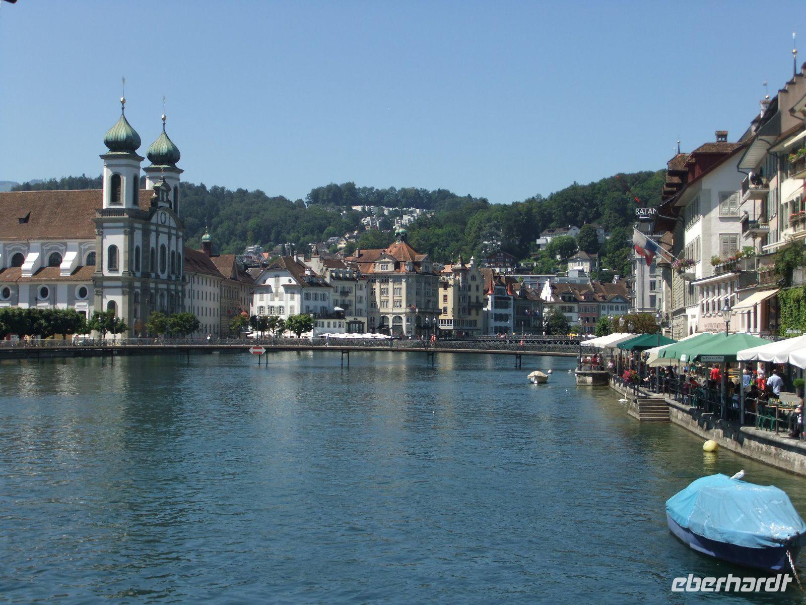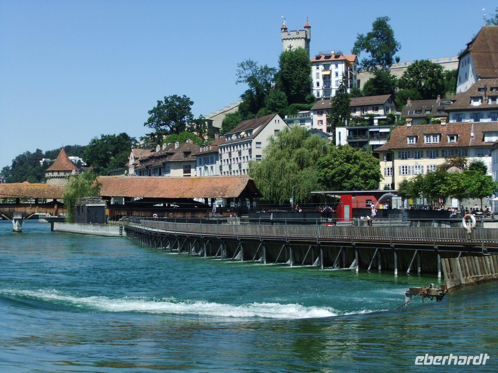 Nachdem wir einige Fotos am Ufer des Vierwaldstätter Sees gemacht haben, treffen wir uns mit Stadtführerin Christina. Sie zeigt uns als erstes den „sterbenden Löwen von Luzern". Er wurde zum Andenken an den Heldentod der 1792 in Paris gefallenen Schweizer in eine 20 Meter hohe Sandsteinwand gehauen. Dann erkunden wir Luzern zu Fuß. Natürlich beginnen wir mit der weltbekannten Kapellbrücke, ist sie doch das Wahrzeichen der Stadt und die älteste gedeckte Holzbrücke der Welt. Wir überqueren auf ihr die Reuss und kommen zur Jesuitenkirche. Von hier hat man auch einen schönen Blick zum gegenüberliegenden Rathaus. Weiter geht es zum „Nadelwehr". Dabei handelt es sich um eine Einrichtung zur Regelung des Wasserabflussmenge und damit des Wasserstandes des Vierwaldstätter Sees. Über die Spreuerbrücke kommen wir in die Altstadt mit malerischen Gassen und freskengeschmückten Häusern. Über uns erhebt sich die immerhin noch 870 Meter lange Stadtmauer mit mehreren Türmen. Am Mühlenplatz, Weinplatz und Kornmarkt legen wir Stopps ein, dann endet unsere Führung auf dem Kapellplatz. Die verbleibende Zeit nutzen die Gäste noch zum Besuch der Hofkirche, einen Bummel entlang des Vierwaldstätter Sees oder zur Einkehr in eines der vielen Restaurants am Reussufer.