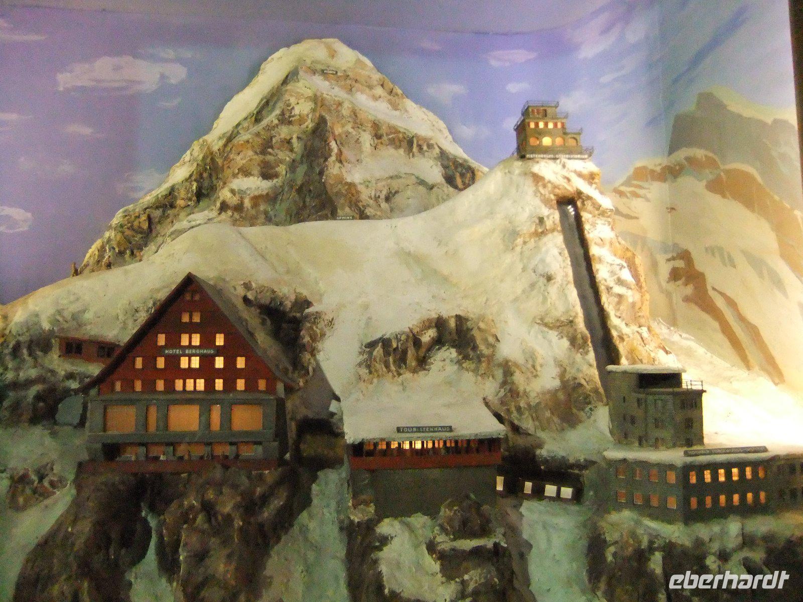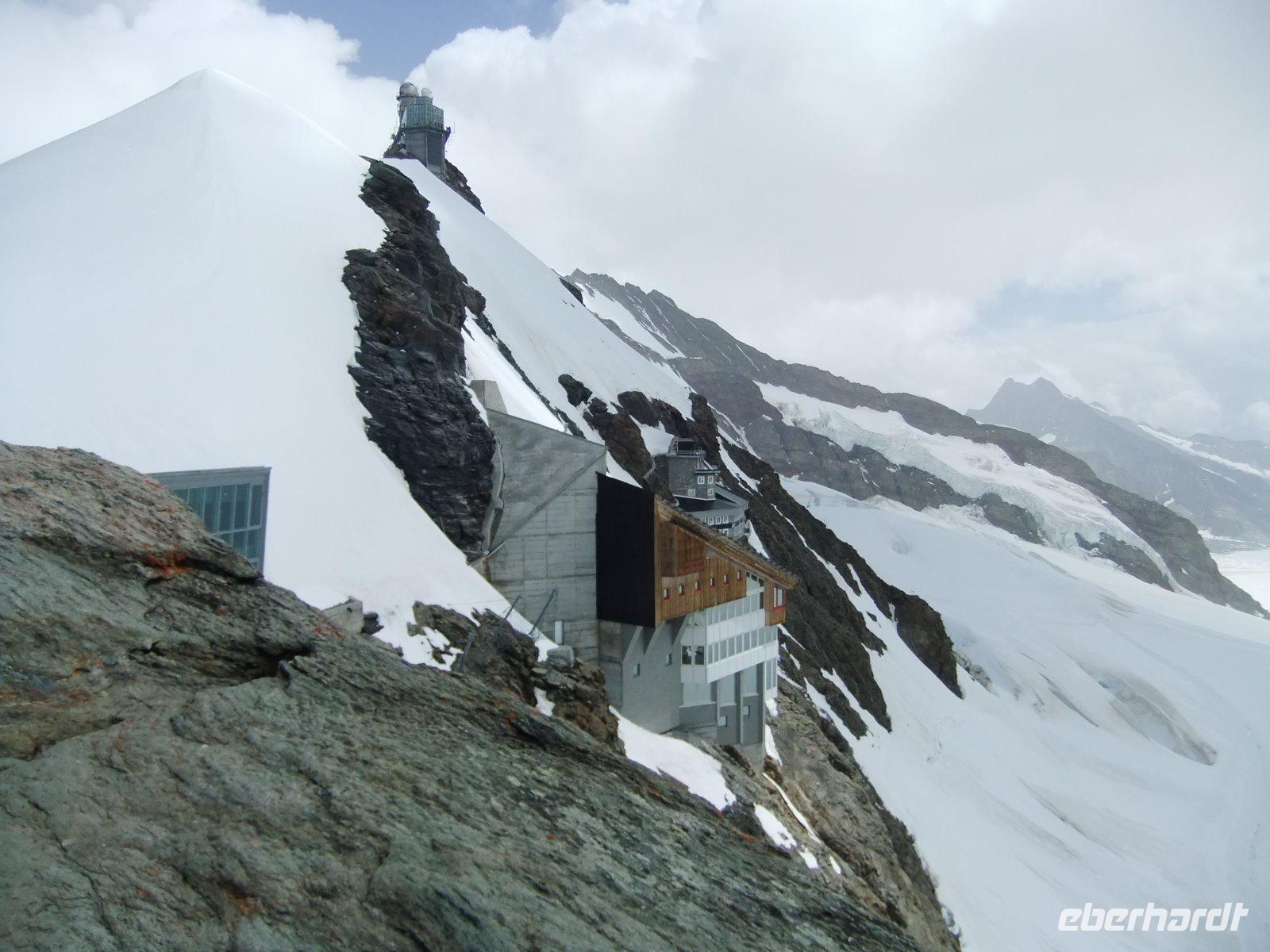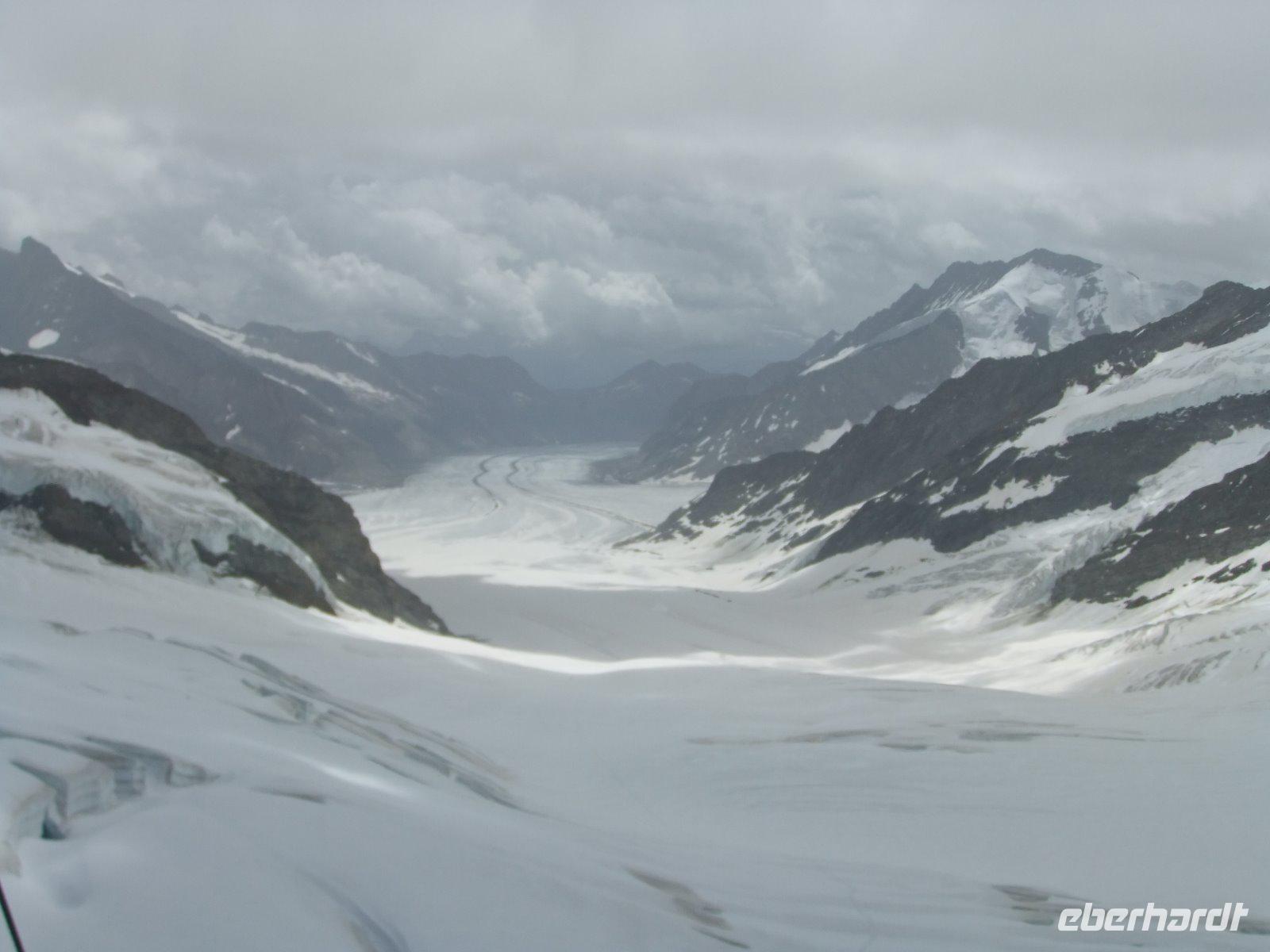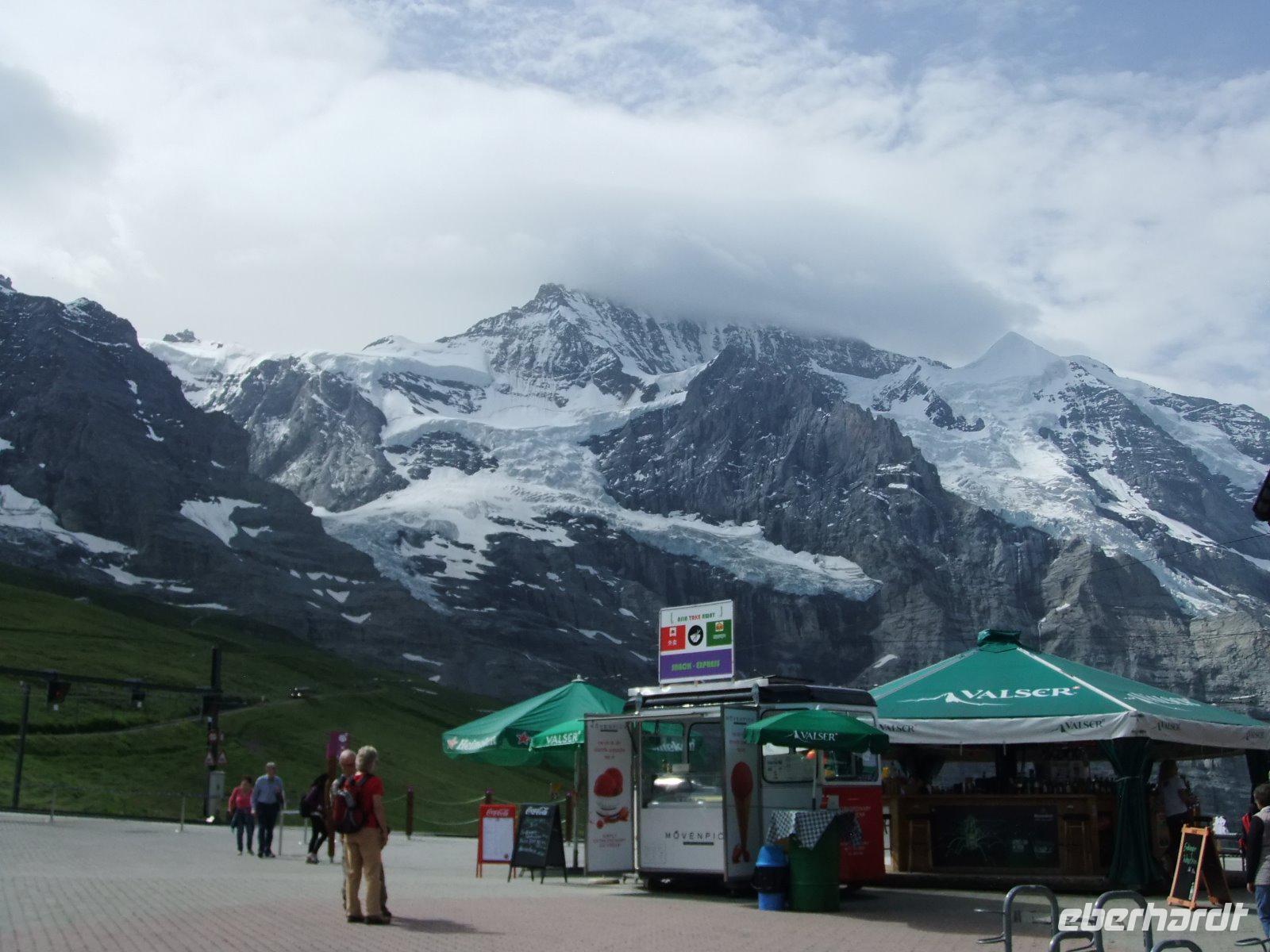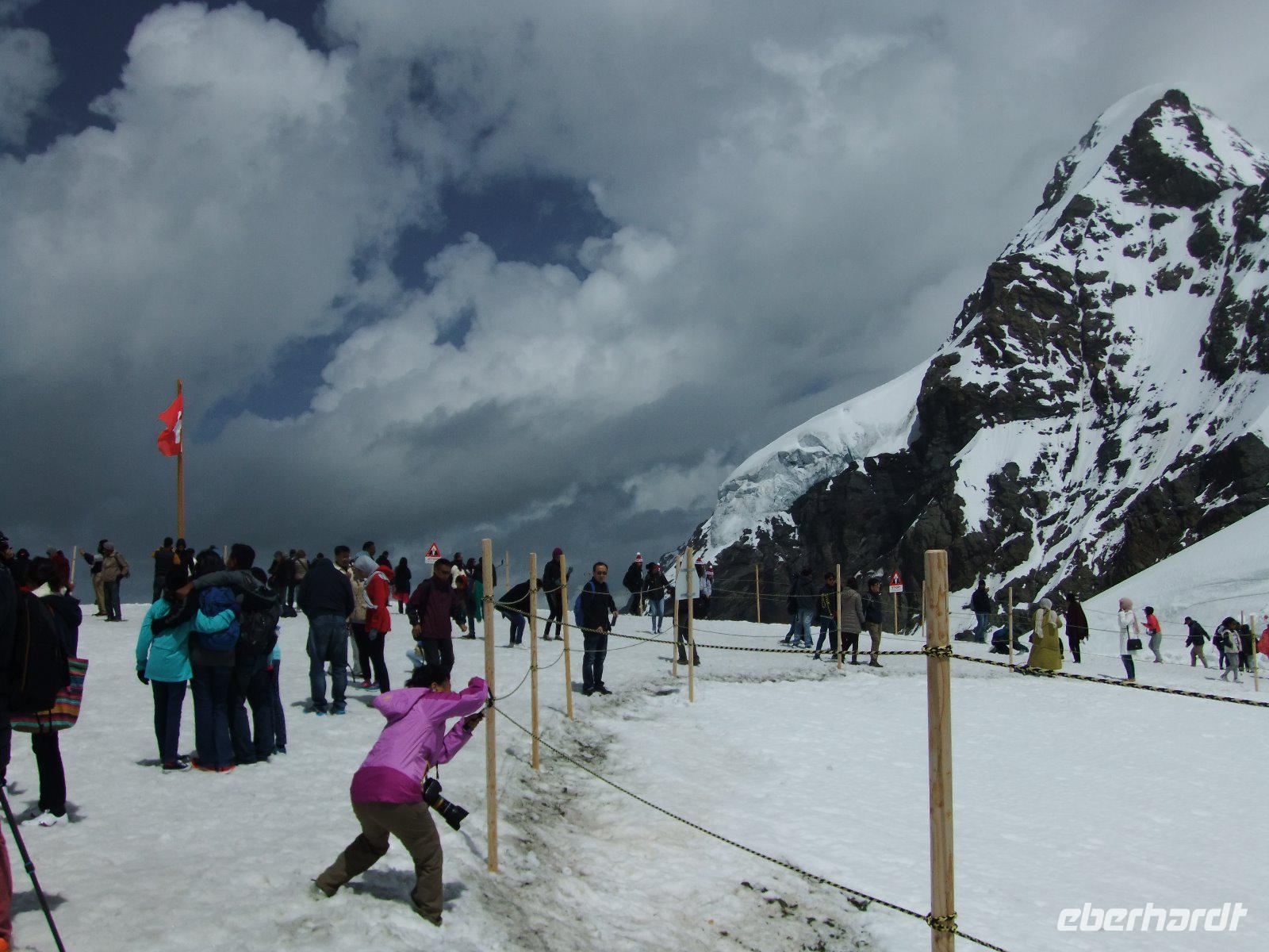 Bis jetzt war der Wettergott immer auf unsere Seite. Auch heute hoffen wir wieder auf seine Unterstützung, denn wir wollen ganz nach oben. Nach dem Frühstück gehen wir zum Bahnhof Interlaken-Ost. Von hier fahren wir nach Grindelwald, steigen dort in die Zahnradbahn zur Kleinen Scheidegg um. Das Dreigestirn Eiger, Mönch und Jungfrau präsentiert sich nun vor uns. Sehr gut einsehbar ist besonders die Eigernordwand. Weiter geht es mit der Jungfraubahn. An den Stationen Eigerwand und Eismeer legen wir Fotostopps ein. Nach 50 Minuten erreichen wir den mit 3454 m höchstgelegenen Bahnhof Europas. Von der Bahnhofshalle gelangen wir direkt ins Hauptgebäude, wo wir dem Symbol „Tour" folgen können. Die erste Attraktion ist das 360°-Kinoerlebnis „Jungfrau-Panorama". An der Station „Aletschgletscher" spazieren wir durch den Schnee. Aus dem Liegestuhl können wir beobachten, wie vor allem asiatische Touristen eine Rutschpartie im Gummireifen machen und Mutige am 250 Meter langen Stahlseil über die Gletscherwelt fliegen. In 27 Sekunden erreichen wir dann mit dem schnellsten Lift er Schweiz das Sphinx-Observatorium, das gleichzeitig das Wahrzeichen des Jungfraujochs ist. Die Aussichtsterrasse bietet eine wunderbare Sicht auf den Aletschgletscher und wir sind dem Mönch ganz nah. Weiter geht es zum Erlebnisrundgang „Alpine Sensation". Wir bestaunen das „Wunderland Schweiz in der Schneekugel", schauen auf die Anfänge des Tourismus in der Jungfrau-Region und in die Geschichte der Jungfraubahn. Dann wird es kalt, denn wir befinden uns im Eispalast. Hier treffen wir auf Pinguine und Eisbären. Unsere nächste Station ist das Gletscherplateau, wo seit der Einweihung der Jungfraubahn die Schweizer Fahne weht. Wir stehen zu Füßen der Jungfrau und auch von hier haben wir noch einmal einen atemberaubenden Blick auf den Aletschgletscher. Zum Schluss tauchen wir mit Lindt ein in die süße Welt der Schweizer Schokolade.