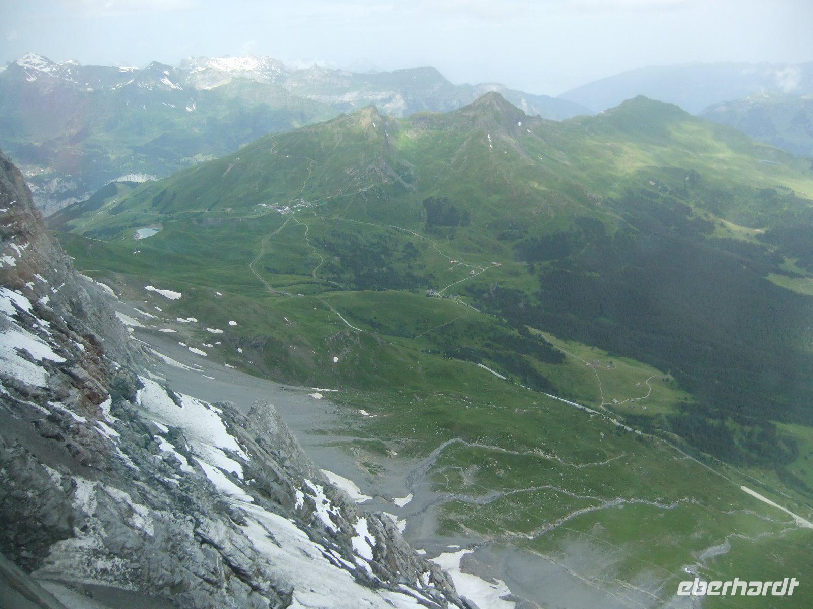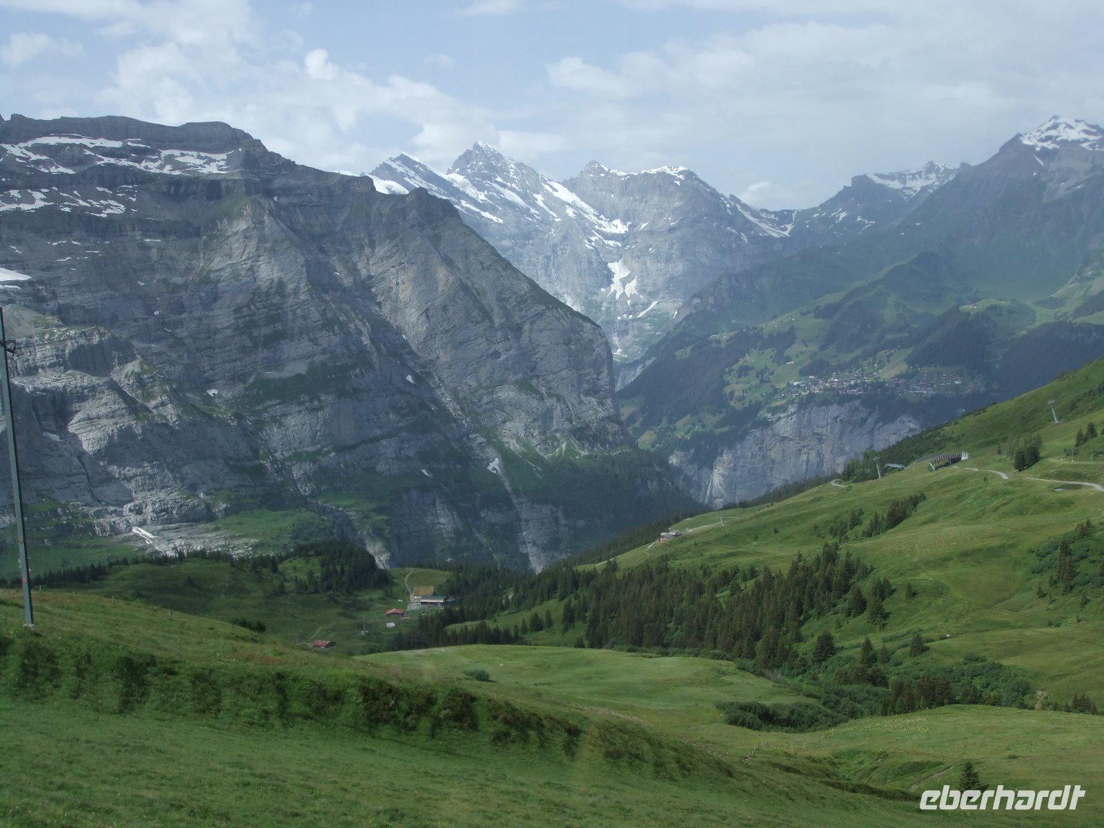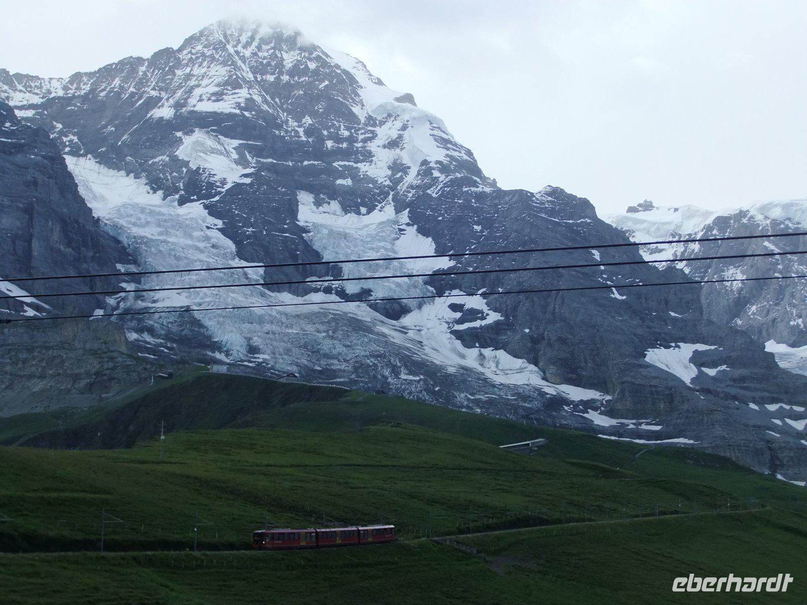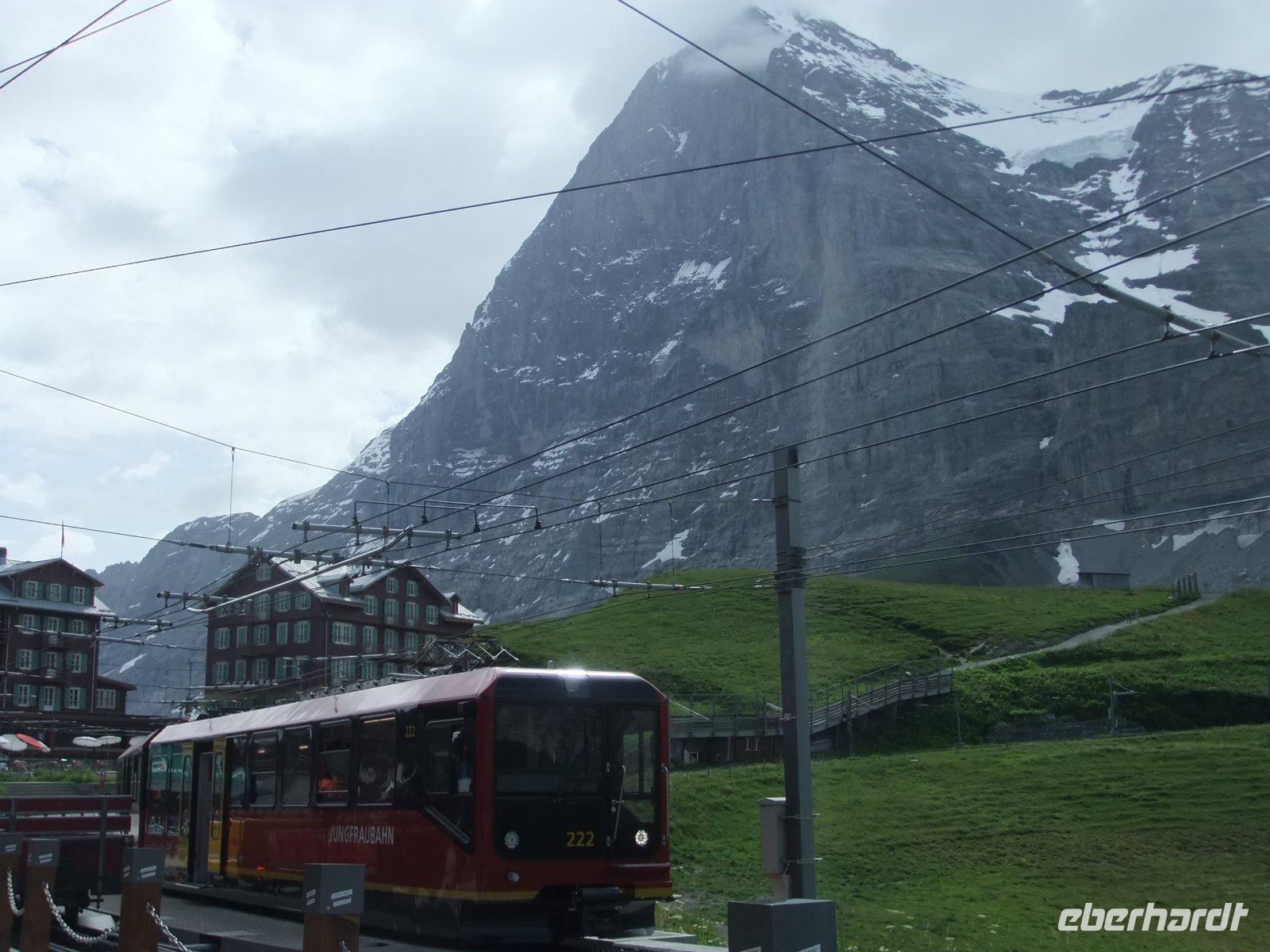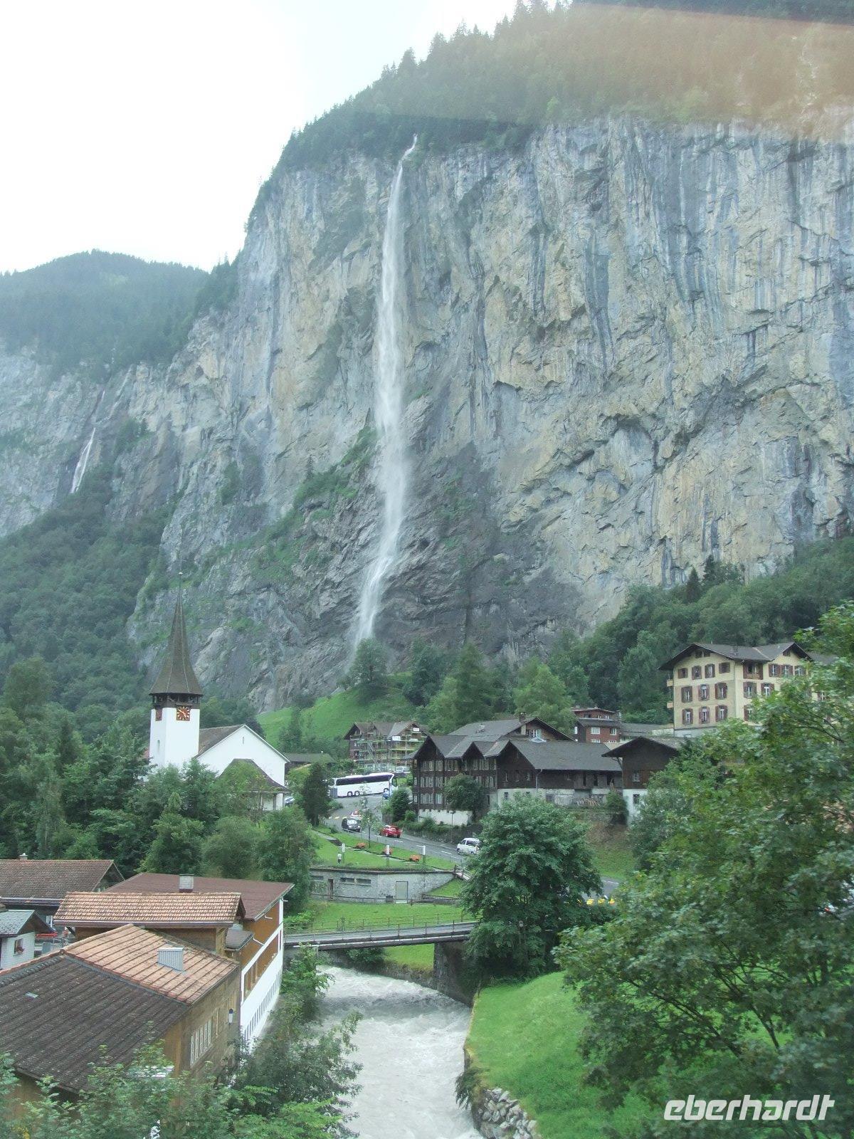Schnell ist die Zeit auf dem Jungfraujoch vergangen. Die Jungfraubahn bringt uns wieder zur Station Kleine Scheidegg. Von hier aus geht es diesmal aber nicht nach Grindelwald, sondern mit der Wengernalpbahn über Wengen nach Lauterbrunnen. Hier sehen wir am Ortsrand den Staubbachfall, der mit 287 Metern der zweithöchste Wasserfall der Schweiz ist. Der letzte Abschnitt unseres heutigen Ausfluges führt uns entlang der tosenden Lütschine wieder Richtung Interlaken.