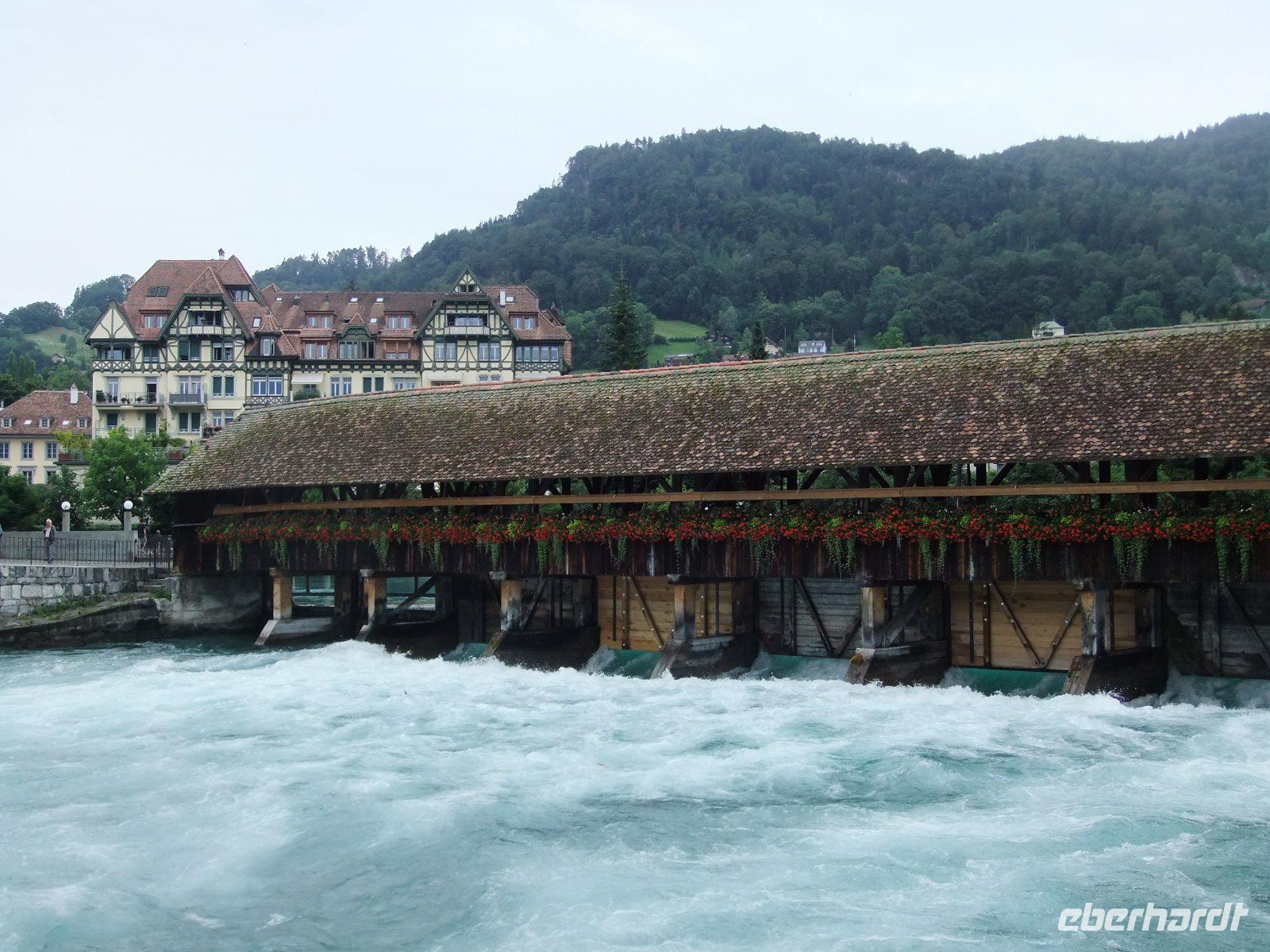 Am Westufer des Thuner Sees liegt Thun zu beiden Seiten der Aare. Im Rahmen einer Stadtführung erkunden wir das „Tor zum Berner Oberland". Über die Obere Schleuse erreichen wir die Bällitz, eine Insel in der Aare, gehen weiter zum Brahmsquai, entdecken, dass in Thun das Geld „auf der Straße liegt", und spazieren durch die Hauptgasse, wo früher die Zünfte ihren Sitz hatten. Über den „Weg durch den Himmel" gelangen wir zum Schloss, das hoch über der Stadt thront. Der Schlossturm ist 32 Meter hoch, genauso tief ist der Schlossbrunnen. Wir haben von hier oben einen schönen Blick auf Thun. Für den Abstieg wählen wir die Teufelstreppe. So sind wir bald auf dem Rathausplatz, spazieren zum Mühleplatz, wo sich im Sommer das Riesenrad dreht, und beenden am Waisenhausplatz unsere Führung. Nach etwas freier Zeit treffen wir uns am Schiffskanal zu Wiener und Bockwurst wieder. Am engen Nordufer geht es nach Interlaken zurück. Die meisten Gäste bummeln am Nachmittag noch zur Höhe-Matte oder entlang der Aare.