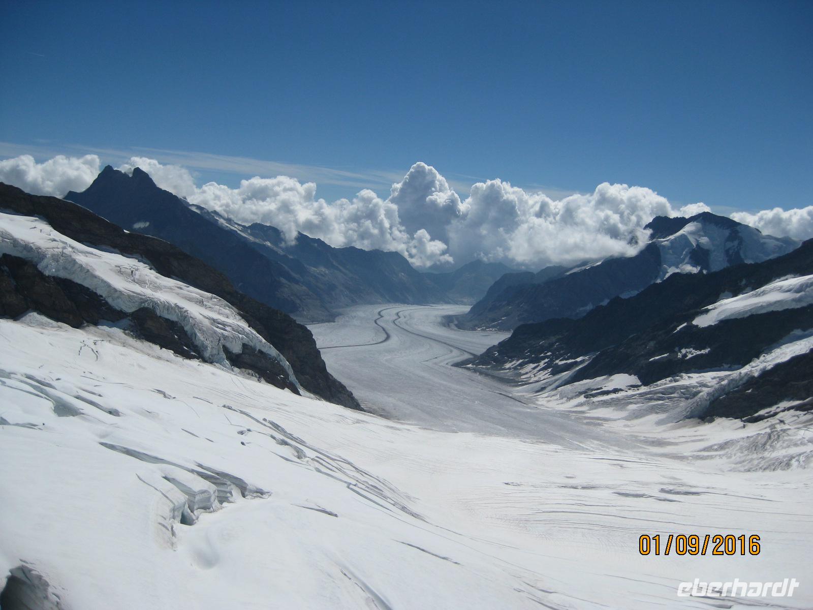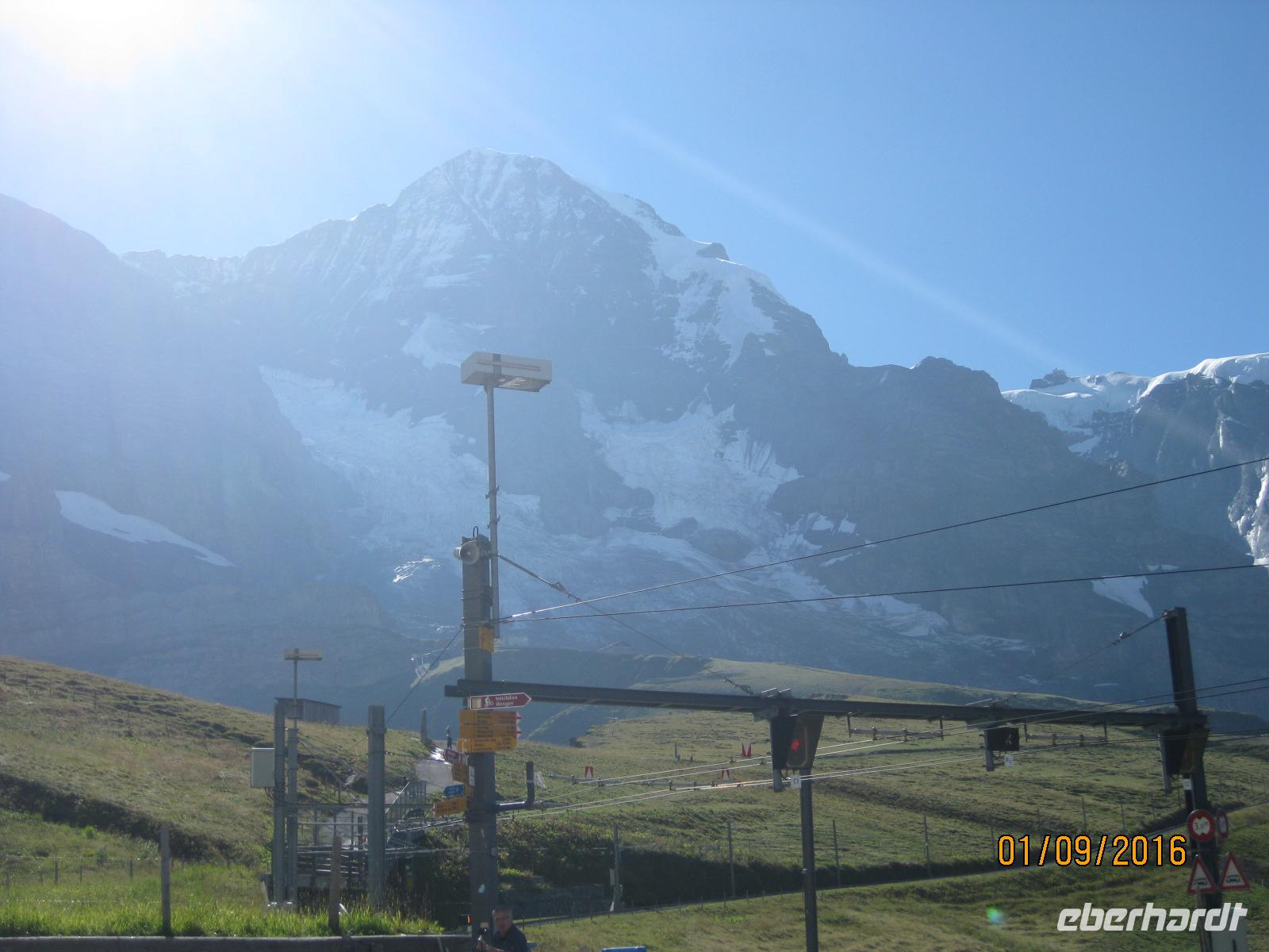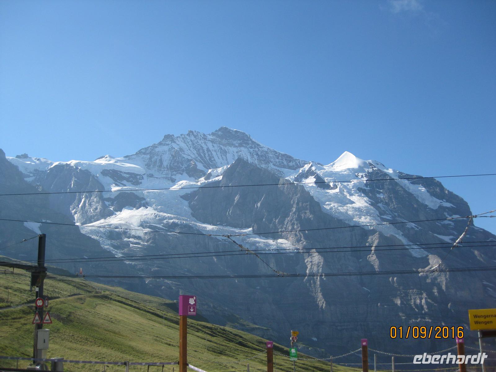 Mönch, Eiger, Jungfrau - heute ruft der Berg und wir können es kaum noch erwarten! Das Daumendrücken hat dabei wieder geholfen. Strahlender Sonnenschein begleitet uns auch heute. Mit dem Zug fahren wir zunächst von Interlaken nach Grindelwald. Weiter mit der Zahnradbahn zur Kleinen Scheidegg und anschließend geht es mit der Jungfraubahn durch den Eiger zur höchstgelegenen Bahnstation Europas, dem Jungfraujoch in 3.454 Metern Höhe. Bereits die Fahrt mit der Berner Oberland Bahn, Wengernalpbahn sowie der Jungfraubahn ist ein fantastisches Erlebnis, welches wir in vollen Zügen genießen. Besonders erlebnisreich ist der fantastsiche Ausblick vom Jungfraujoch über die Aletschregion. Der Aletschgletscher ist heute noch der größte Gletscher der Schweiz und misst 23 Kilometer. Zudem erwartet uns ein Erlebnisrundgang, welcher die Geschichte über die Bahn mit ihrem Erfinder Adolf Guyer-Zeller erzählt sowie einen Eispalast. Zurück führt unsere Route über die Kleine Scheidegg nach Lauterbrunnen. Von dort gelangen wir erneut mit der Berner Oberland Bahn zurück nach Interlaken.