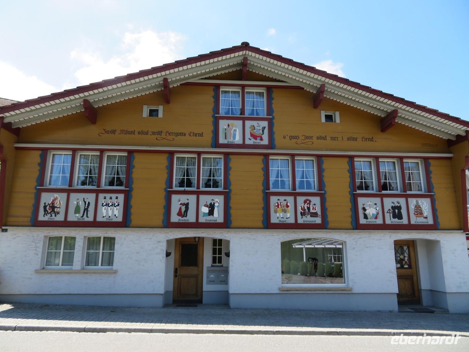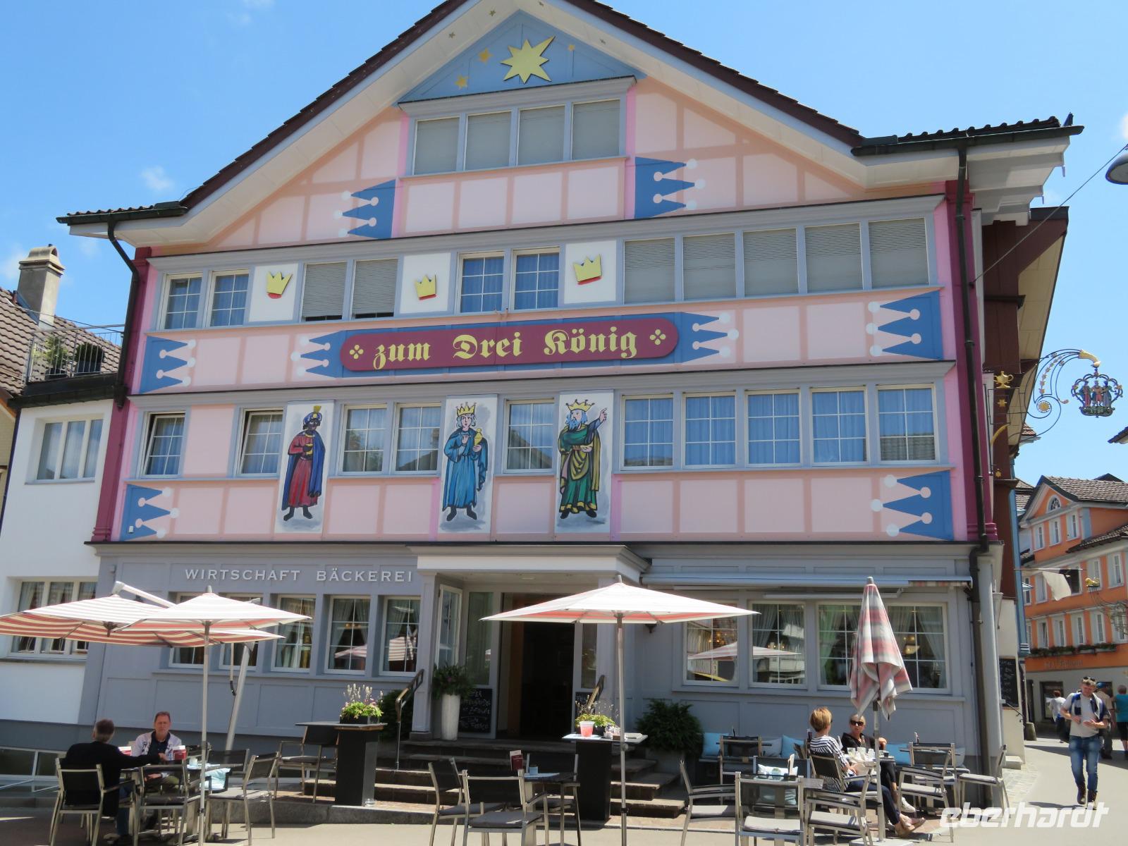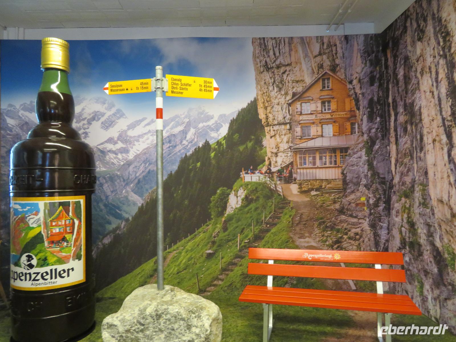 Bereits beim Aufstehen sehen wir, dass sich der Säntis in voller Schönheit bei Sonnenschein zeigt. Uns wecken wieder die Glocken der auf der Schwägalp weidenden Kühe. Wir fahren mit der ersten Seilbahn zeitig auf den Berg. Uns erwartet noch eine besondere Überraschung: Wir dürfen das neue Panorama-Restaurant einweihen. Es ist wunderschön mit viel Holz gestaltet und bietet eine herrliche Aussicht. Wir stärken uns an dem reichhaltigen Frühstücksbuffet, welches keine Wünsche offen lässt. Anschließend erwartet eine Mitarbeiter der Säntisbahn, zu einer sehr interessanten Führung durch die Anlagen des Säntis. Wir sehen in einem sehr interessanten Film, unter welch schwerer und mühevoller Arbeit die Säntis-Schwebebahn gebaut wurde. Anschließend dürfen wir einen Blick in den 123 Meter hohen Sendeturm der Swisscom werfen. Wir können die sehr schöne Aussicht bei strahlendem Sonnenschein genießen. Wir sehen die Berge der Zentralschweiz mit Rigi und Pilatus, die Berner Alpen mit Eiger, Mönch und Jungfrau und weiter die Glaner und die Bündner Alpen. Die Seilbahn bringt uns wieder zurück auf die Schwägalp. Nach einer kurzen Pause starteten wir nach Appenzell. Im Hauptort des Halbkantons Appenzell Innerrhoden. Zunächst besuchen wir die Appenzeller Alpenbitter Brennerei. Wir erfahren, wie der berühmte Alpenzeller Magenbitter in einem aufwendigen Verfahren aus 42 Kräutern hergestellt wird. Anschließend unternehmen wir einen kleinen Rundgang. Wir sehen die vielen wunderschön mit Bauernmalerei bemalten bunten Häuser am Landsgemeindeplatz und in der Hauptgasse. Auf dem Landsgemeindeplatz werden auch heute jedes Jahr am letzten Sonntag im April die Landsgemeinden abgehalten. Über kommunale Beschlüsse entscheiden die Einwohner des Kantons per Handerheben. Es bleibt Zeit, um gemütlich durch den kleinen Ort zu spazieren.