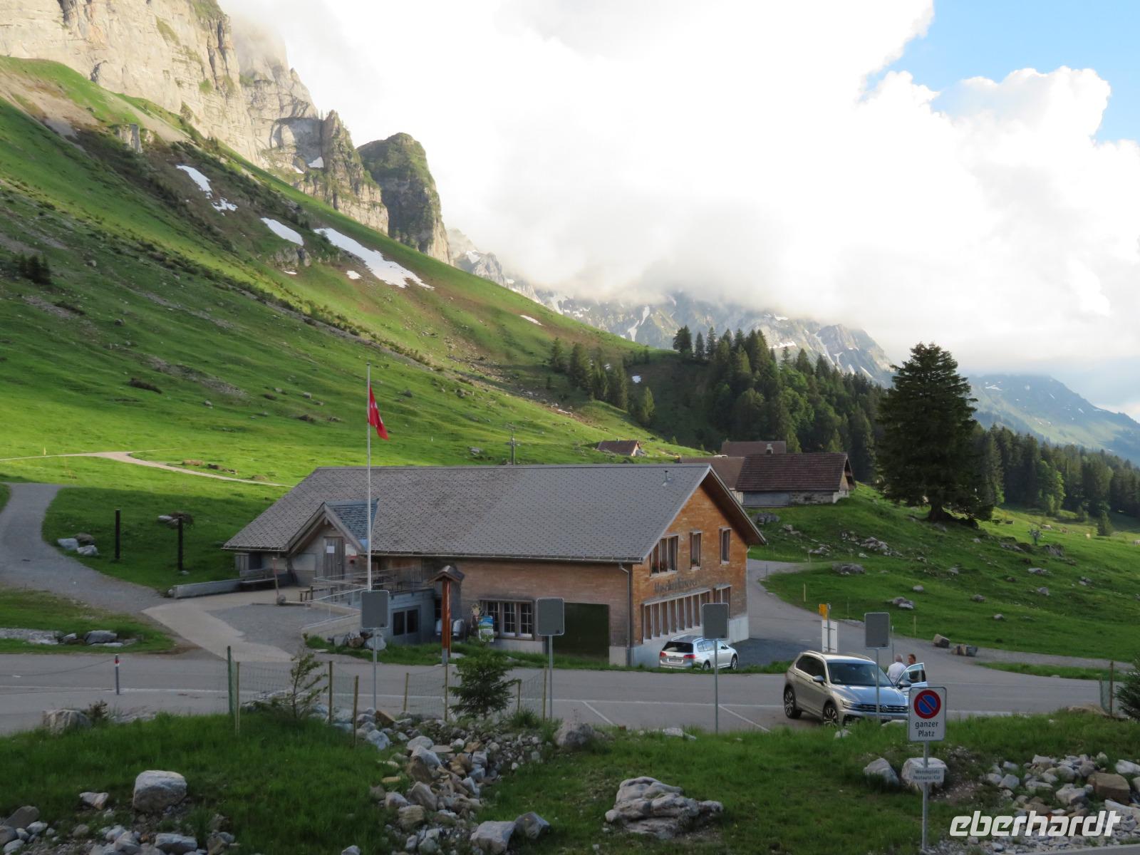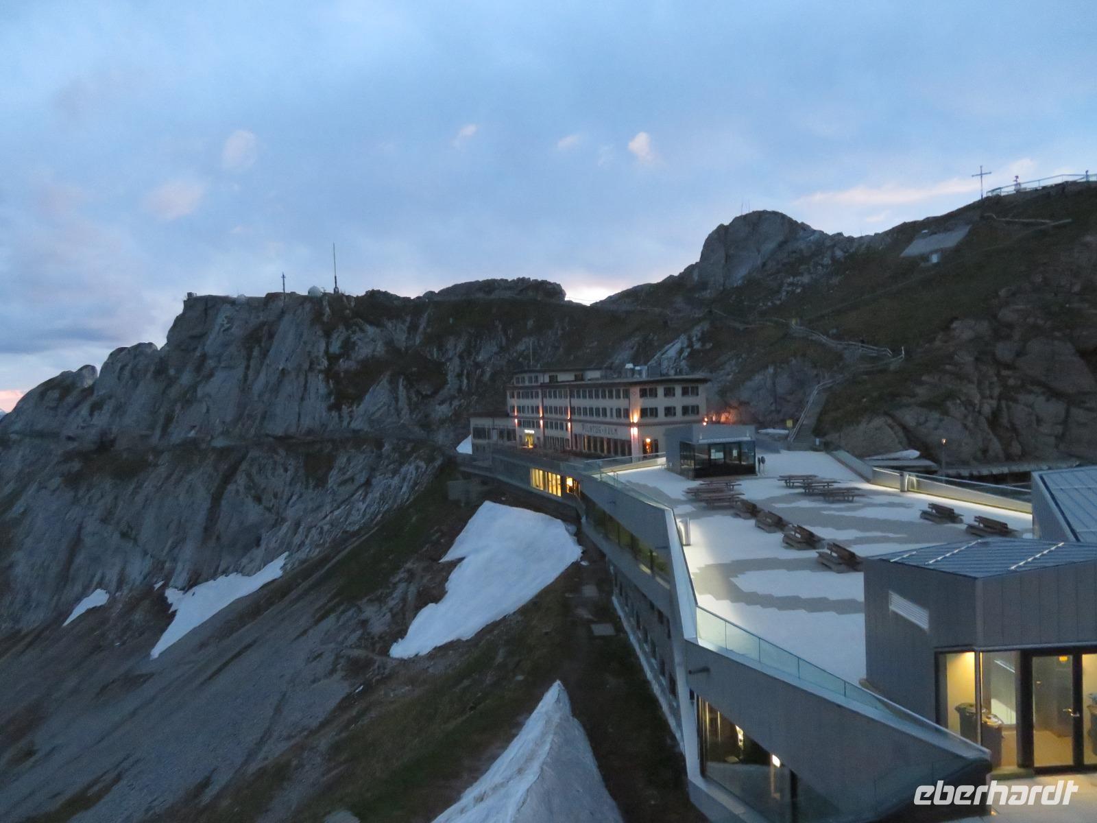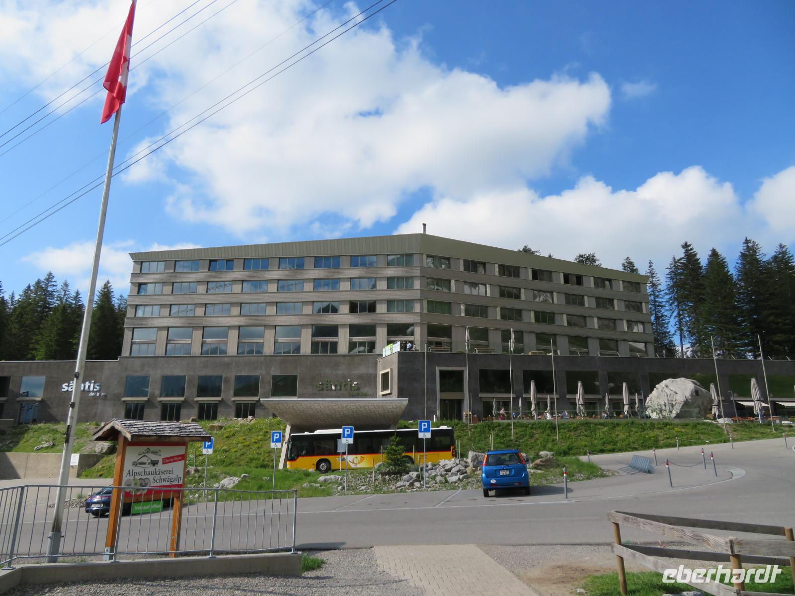 Pünktlich beginnt unsere Reise in die Schweiz in Dresden. Wir kommen einigermaßen zügig voran. Die Route führt uns vorbei am Bodensee durch Bregenz mit Blick auf die Seebühne. Durch das Appenzeller Land fahren wir am späten Nachmittag hinauf zur Schwägalp. Der Säntis steckt noch in Wolken. Wir wurden herzlich im Säntis-das Hotel begrüßt. Nachdem wir unsere schönen Zimmer bezogen hatten, genießen wir ein typisches Appenzeller Menü. Nach dem Abendessen unternehmen einige Gäste einen kleinen Spaziergang in der schönen Umgebung des Hotels. Auch der Säntis zeigt sich uns nun.