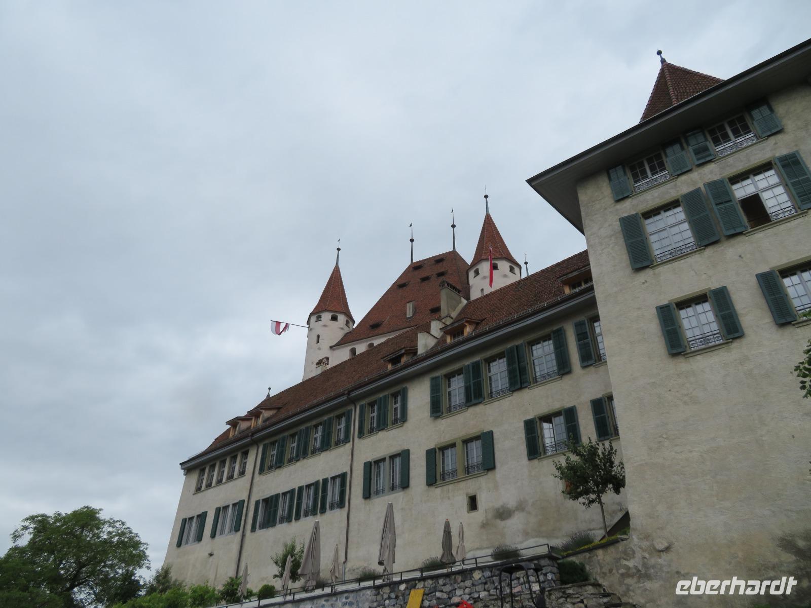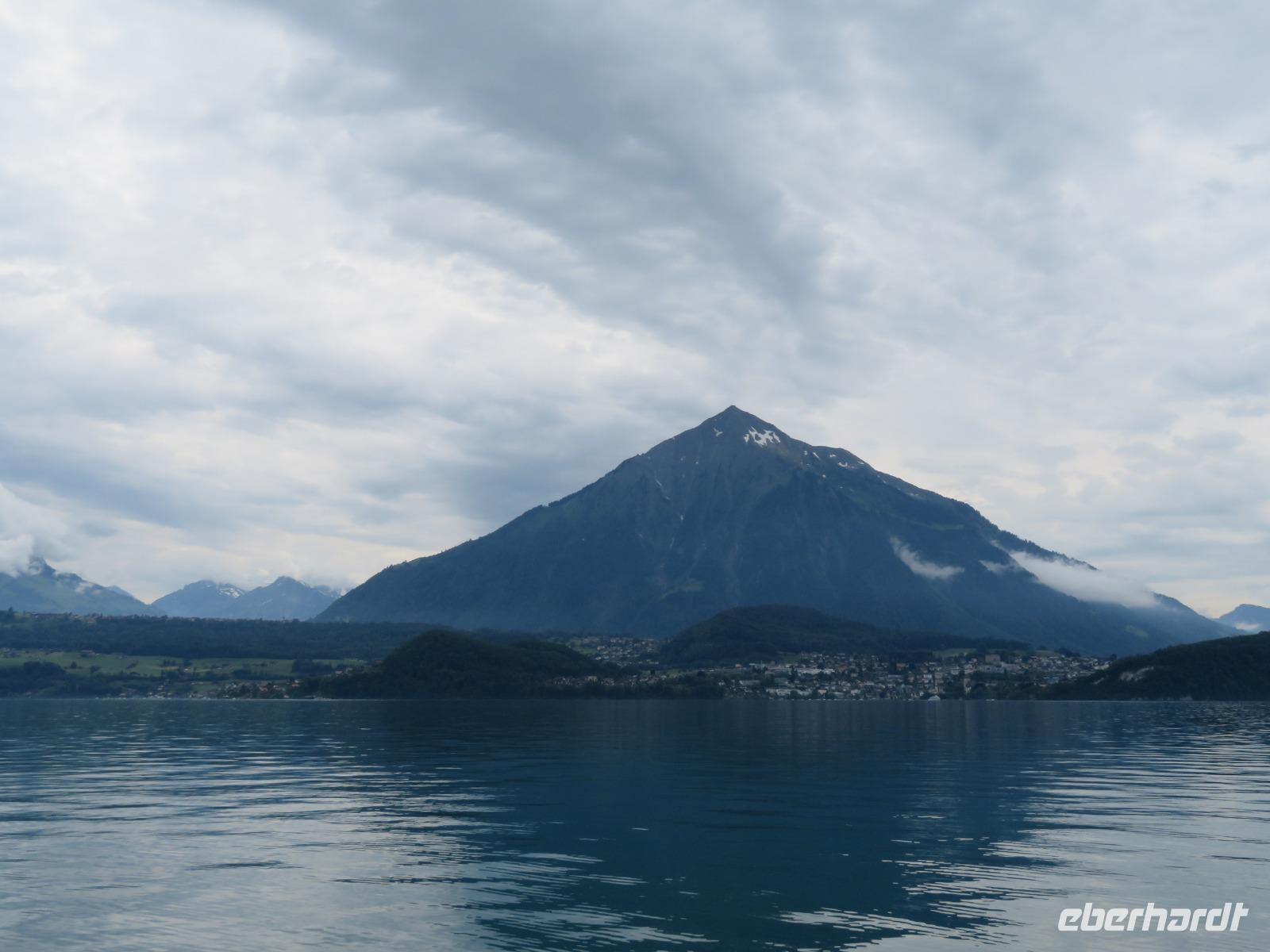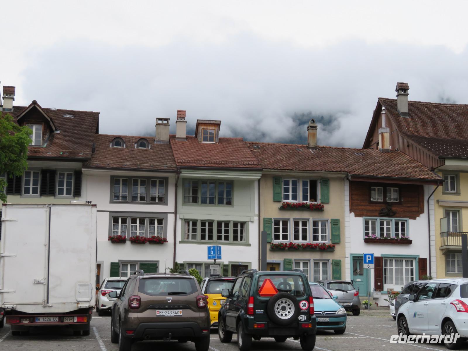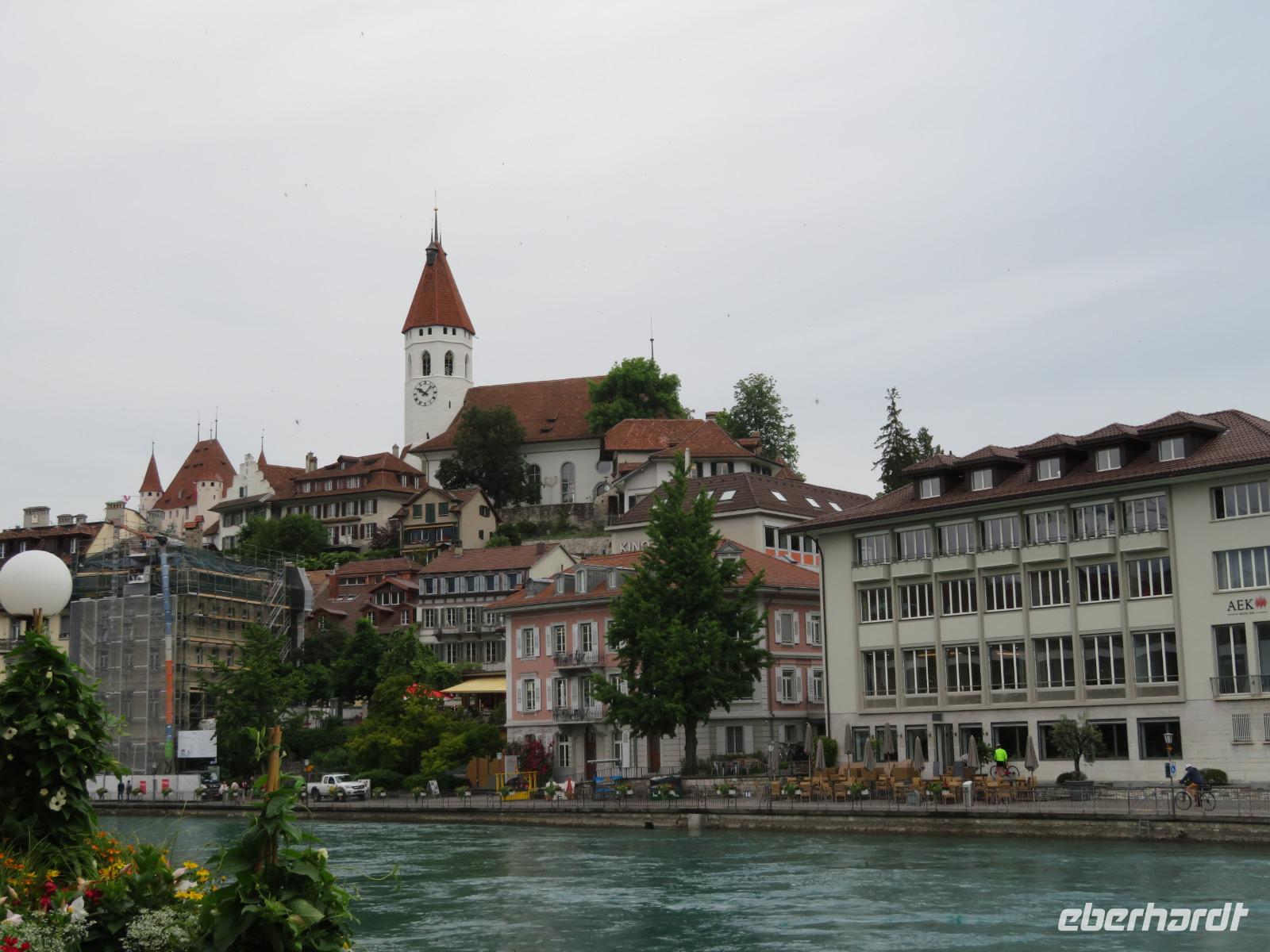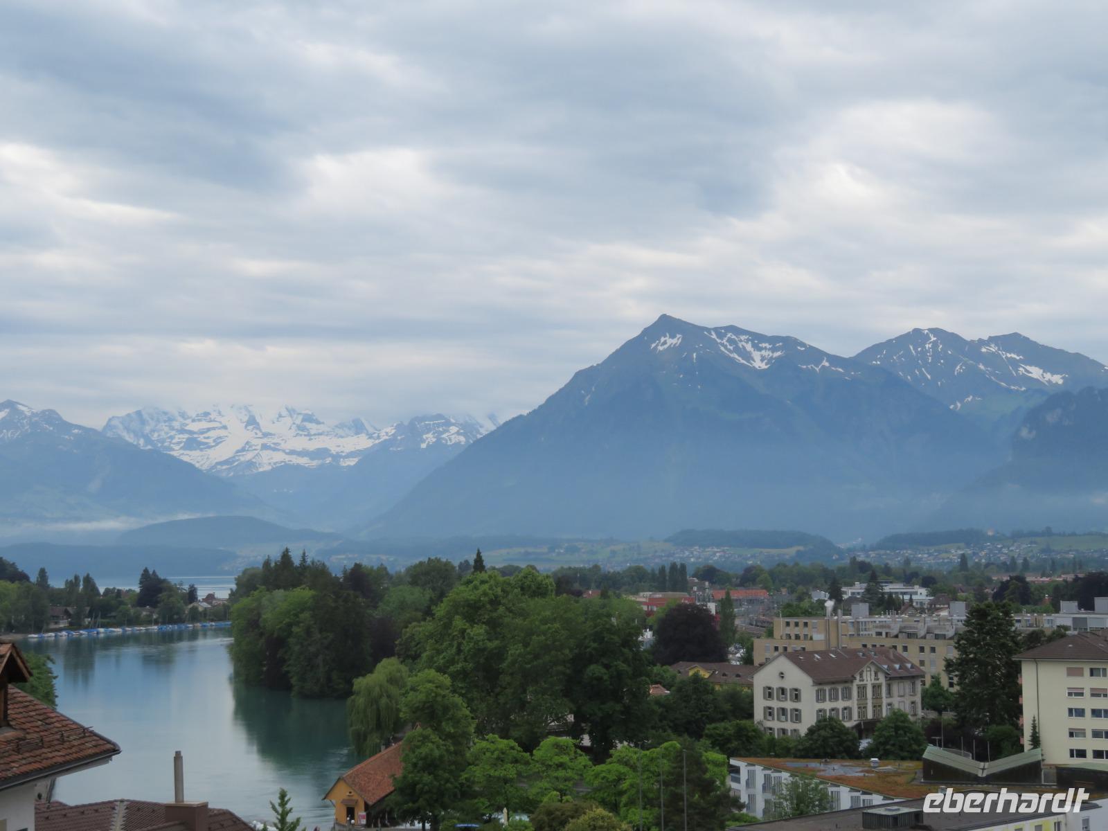 Heute zeigt sich das Wetter etwas durchwachsen. Nach dem Frühstück fahren wir über die Autobahn nach Thun. Mit unserer Stadtführerin Patricia unternehmen wir einen sehr interessanten Rundgang durch die Stadt. Wir sehen die Wehre in der Aare, die den Wasserstand des Thunersees regeln und die momentan fast offen sind, da die Schneeschmelze immer noch im vollen Gang ist und sehr viel Wasser in der Aare ankommt. Staunen können wir über eine wirkliche „Festgeld-Anlage" vor einer Bank AEK. Ein Künstler hat bei der Renovierung der Bank in einem Asphaltstück vor dem Eingang 1826 Frankenstücke mit unterschiedlichen Nennwerten im Gesmatwert 1826 Franken eingelassen. Er verweist damit auf das Gründungsjahr der Bank. Die Münzen sind so fest eingelassen, dass es unmöglich ist, sie wieder herauszulösen. Wir steigen zum Schlossberg hinauf und besuchen die Evangelische Stadtkirche und den Schlosshof. Von der Terrasse eröffnet sich uns ein schöner Blick über die Stadt. In der Hauptgasse sehen wir die alten Stadthäuser und auf dem Rathausplatz erfahren wir die Geschichte des Rathauses, der Zunfthäuser der Mertzger und Pfister, wie die Bäcker früher hießen. Am Mühlenplatz hören wir die Geschichte der Mühle und des Platze. Nun haben wir noch Zeit, um durch die Stadt zu schlendern. Am Mittag fahren wir entlang des Nordufers des Thunersees nach Interlaken zurück. Dabei zeigen sich uns einige Berge, wie der Niesen oder das Stockhorn. Es ist ein grandioser Anblick: der türkisblaue See und dahinter die herrlichen, schneebedeckten Berge. Den Nachmittag verbringen wir ganz individuell in Interlaken.