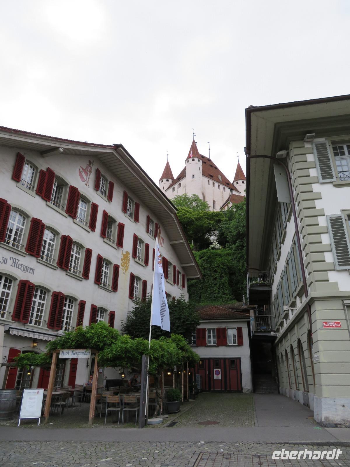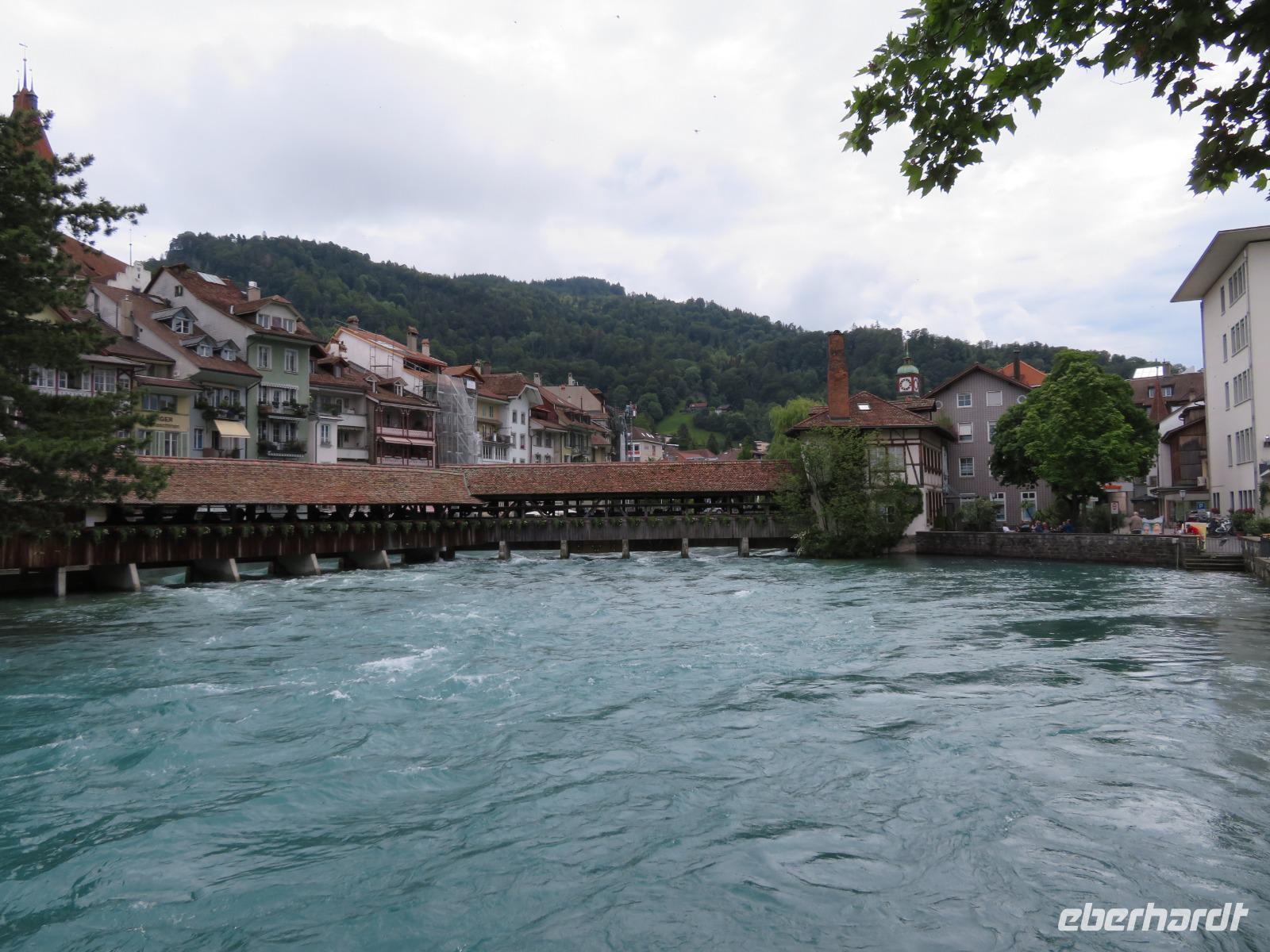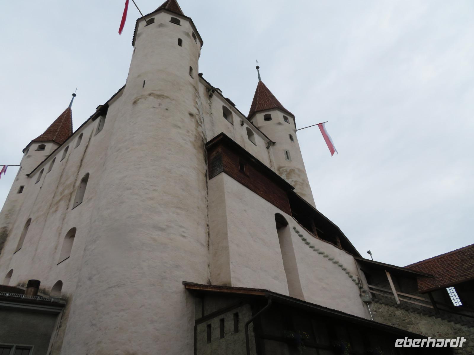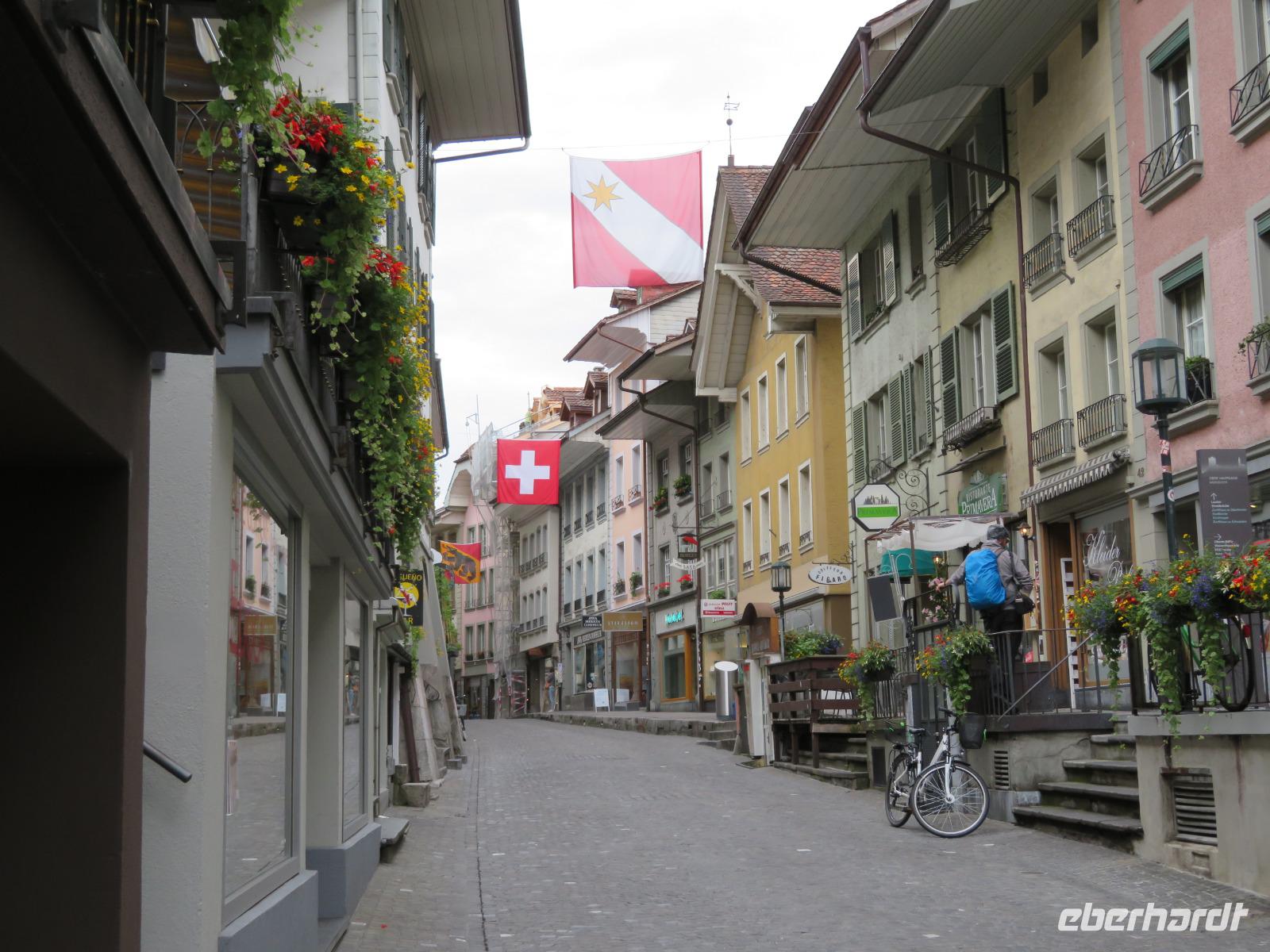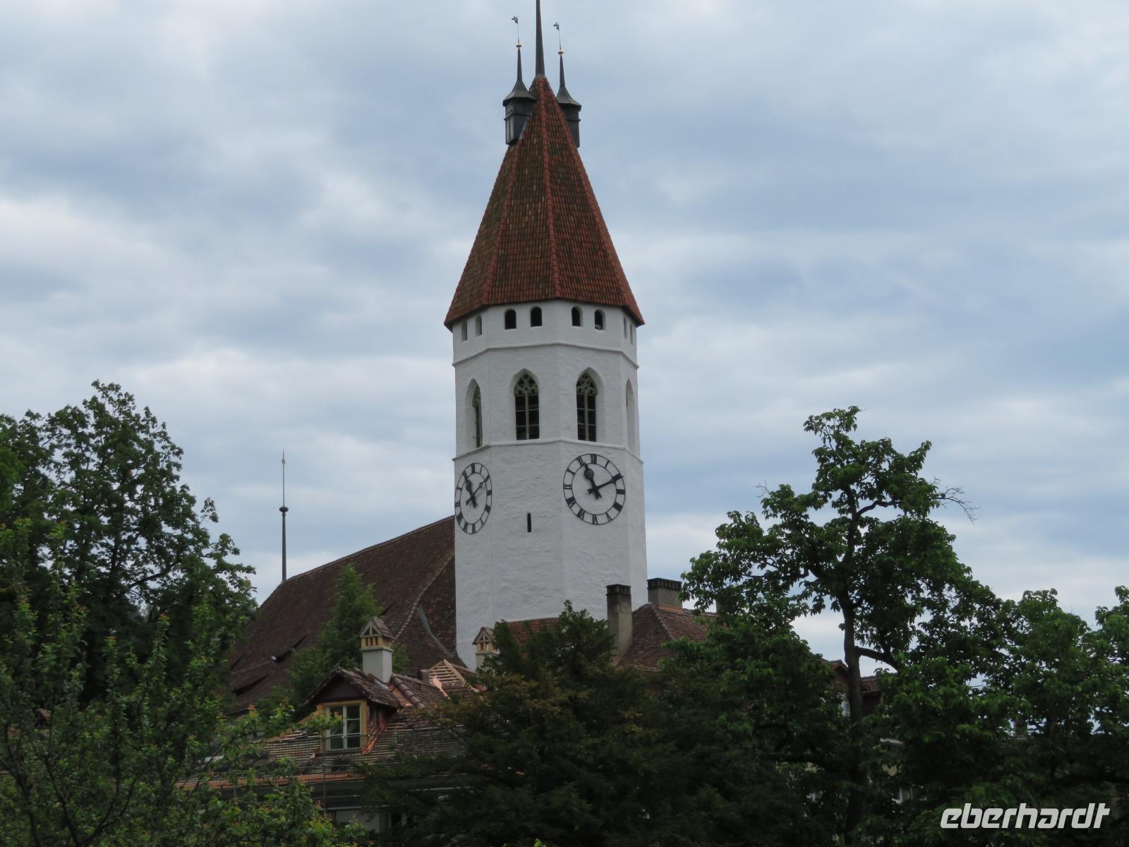 Heute zeigt sich das Wetter etwas durchwachsen. Nach dem Frühstück fahren wir über die Autobahn nach Thun. Mit unserer Stadtführerin Patricia unternehmen wir einen sehr interessanten Rundgang durch die Stadt. Wir sehen die Wehre in der Aare, die den Wasserstand des Thunersees regeln und die momentan fast offen sind, da die Schneeschmelze immer noch im vollen Gang ist und sehr viel Wasser in der Aare ankommt. Staunen können wir über eine wirkliche „Festgeld-Anlage" vor einer Bank AEK. Ein Künstler hat bei der Renovierung der Bank in einem Asphaltstück vor dem Eingang 1826 Frankenstücke mit unterschiedlichen Nennwerten im Gesmatwert 1826 Franken eingelassen. Er verweist damit auf das Gründungsjahr der Bank. Die Münzen sind so fest eingelassen, dass es unmöglich ist, sie wieder herauszulösen. Wir steigen zum Schlossberg hinauf und besuchen die Evangelische Stadtkirche und den Schlosshof. Von der Terrasse eröffnet sich uns ein schöner Blick über die Stadt. In der Hauptgasse sehen wir die alten Stadthäuser und auf dem Rathausplatz erfahren wir die Geschichte des Rathauses, der Zunfthäuser der Mertzger und Pfister, wie die Bäcker früher hießen. Am Mühlenplatz hören wir die Geschichte der Mühle und des Platze. Nun haben wir noch Zeit, um durch die Stadt zu schlendern. Am Mittag fahren wir entlang des Nordufers des Thunersees nach Interlaken zurück. Dabei zeigen sich uns einige Berge, wie der Niesen oder das Stockhorn. Es ist ein grandioser Anblick: der türkisblaue See und dahinter die herrlichen, schneebedeckten Berge. Den Nachmittag verbringen wir ganz individuell in Interlaken.