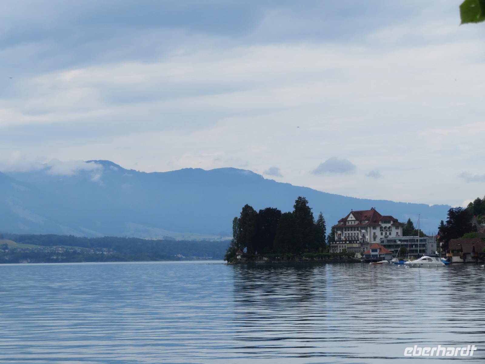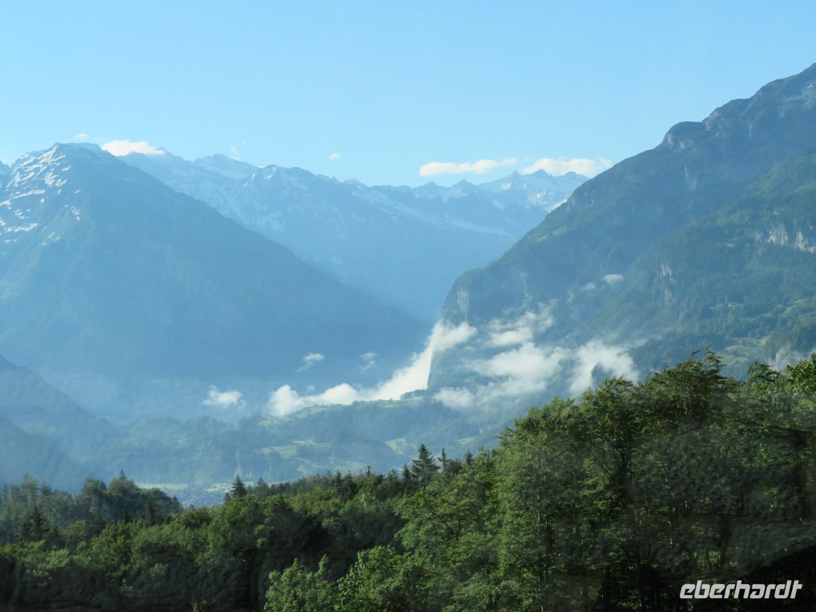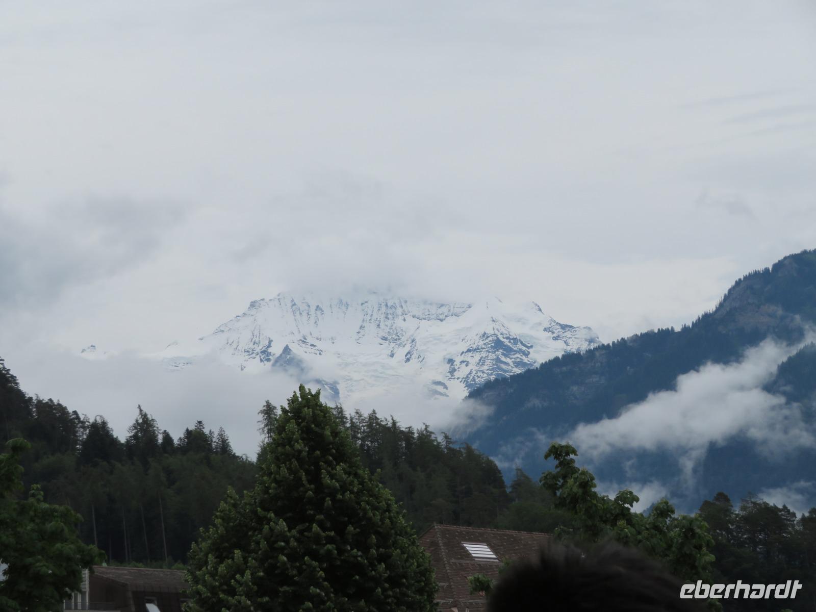Den heutigen Tag gestalten alle nach ihren Wünschen. Das Wetter zeigt sich von seiner durchwachsenen Seite. Am Vormittag verabreden sich einige Gäste mit mir zur gemeinsamen Fahrt mit der Bödeli-Bahn einem kleinen Zug, der durch Interlaken fährt. Wir fahren zunächst durch den Ort und nach Unterseen. Dann geht es in den Jungfrau-Park. Hier sehen wir einen wunderschönen Film über das Berner Oberland. Die herrliche Landschaft wird im Lauf der vier Jahreszeiten gezeigt und sowohl auf eine normale Leinwand, aber auch auf eine Leinwand unter unseren Sitzen projiziert. So haben wir das Gefühl, wir fliegen über das Berner Oberland mit seinen landschaftlichen Schönheiten. Uns hat der Film sehr gut gefallen. Am Nachmittag nutzen wir ganz unterschiedlich die Ziet. Einige fahren auf den Harder Kulm, den Hausberg von Interlaken. Die Standseilbahn bringt die Gäste in nur 8 Minuten auf 1.323 Meter Höhe. Die Strecke der Standseilbahn ist auch spektakulär mit bis zu 68% Steigung. Auf dem Hader Kulm bietet sich eine gute Sicht von der Aussichtsplattform über den Thunersee und den Brienzer See und nach Interlaken. Die hohen Berge verstecken sich leider immer wieder in den Wolken, aber ab und zu lugt die Sonne hervor. Einige nutzen die Zeit zum Einkaufen von Mitbringseln und andere erkundeten die Umgebung von Interlaken mit dem Bus oder dem Zug. Ein schöner Tag ging wieder mit einem vorzüglichen Abendmenü zu Ende.