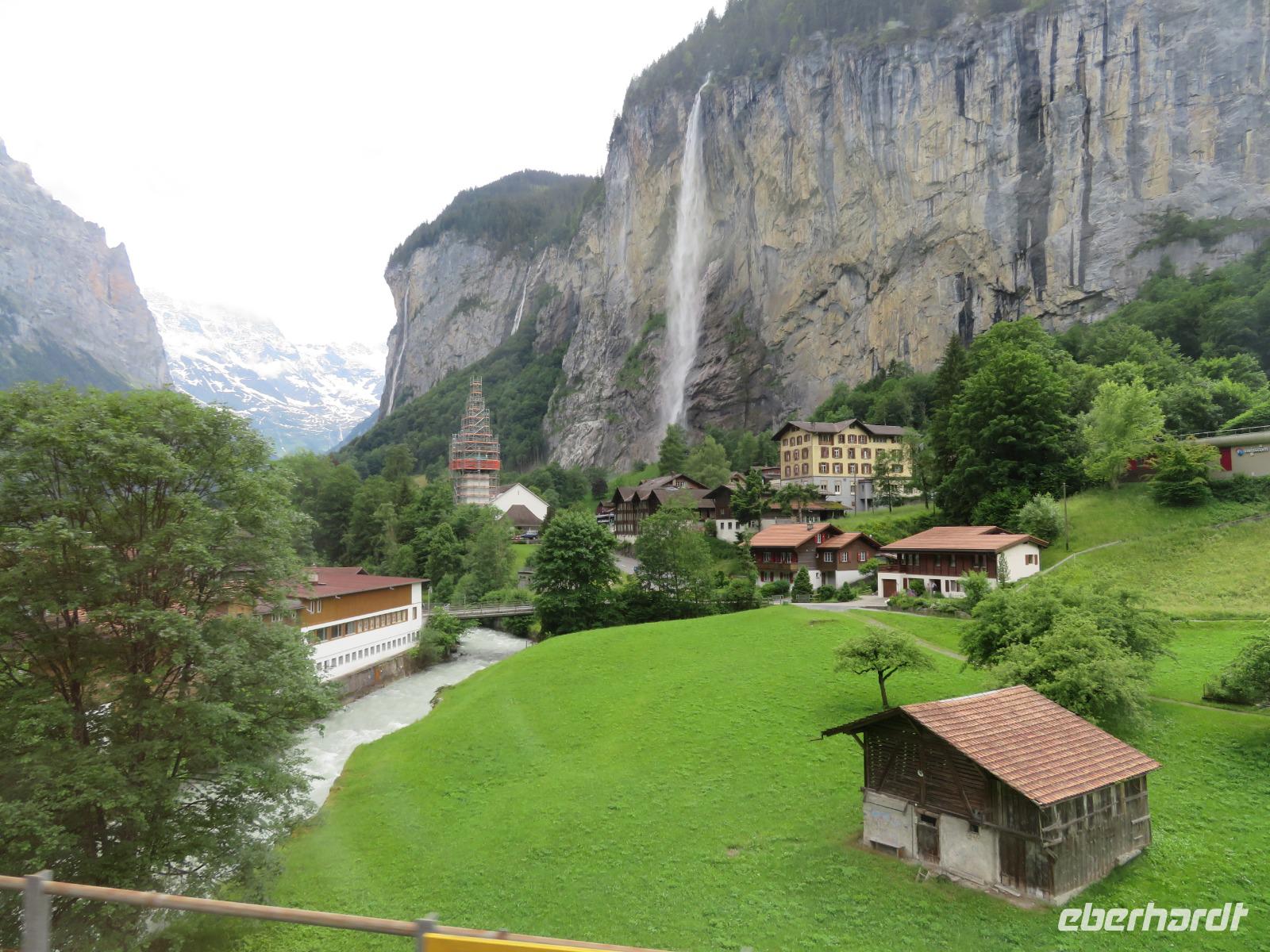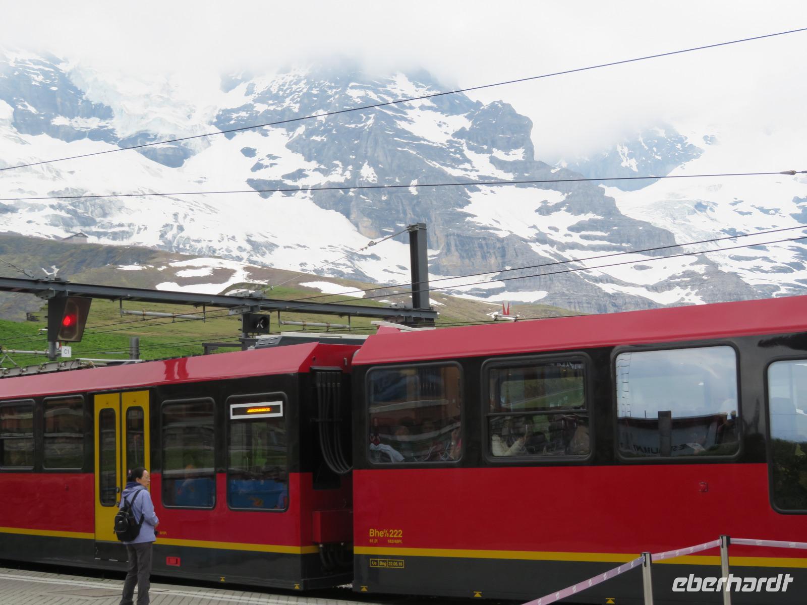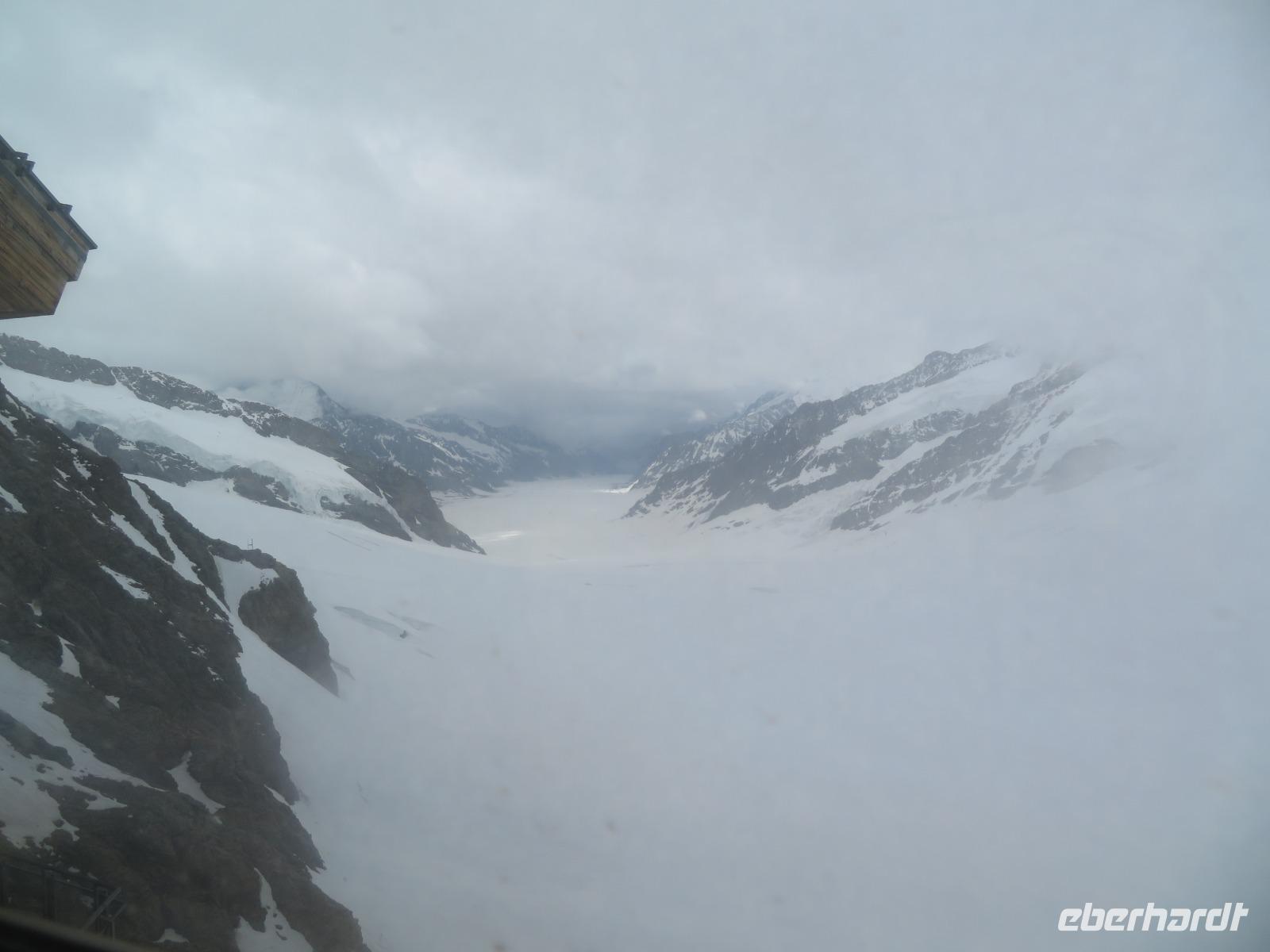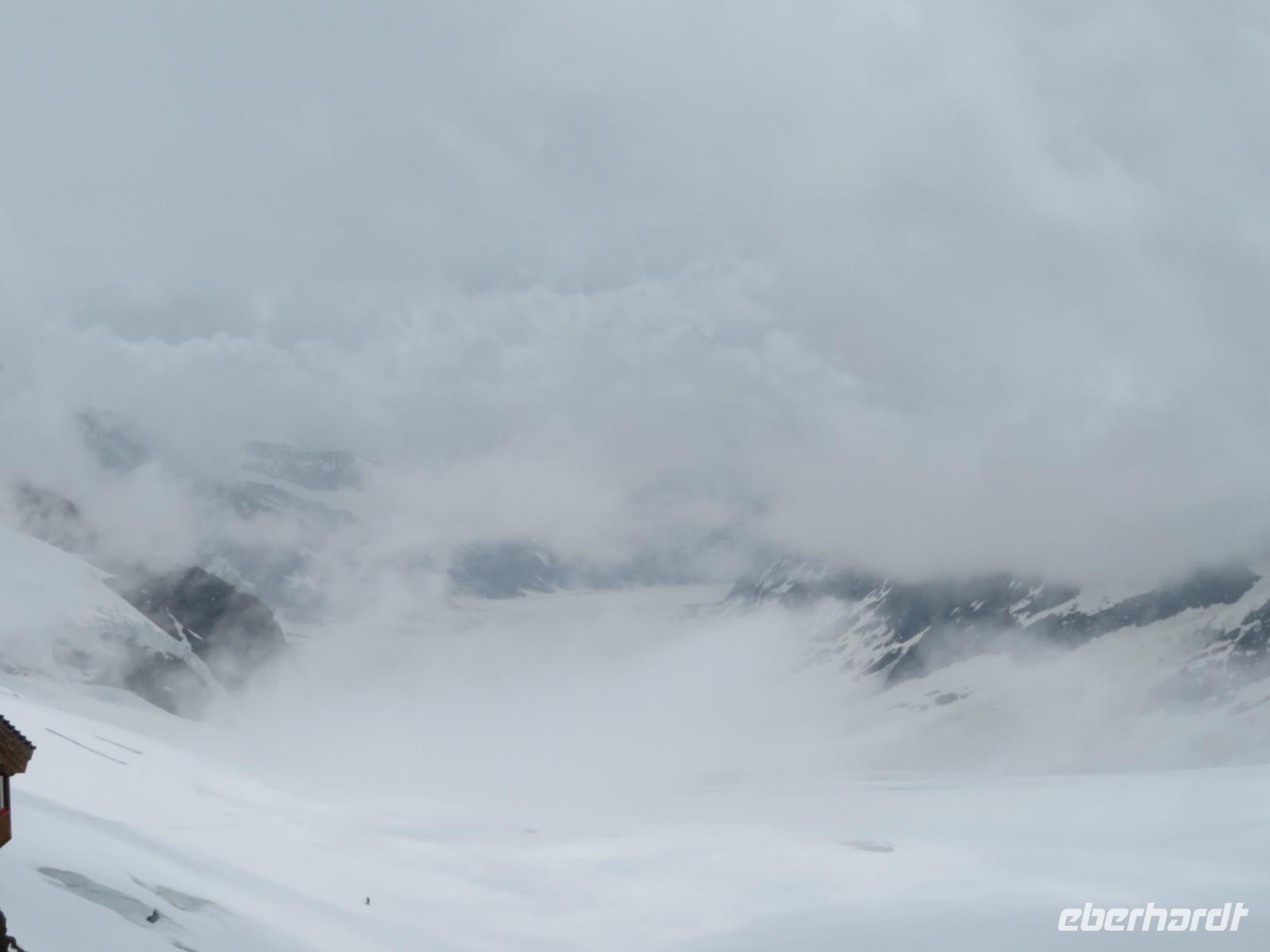 Am heutigen Tag stecken die Berge in dicken Wolken. Das tut aber unserer guten Laune keinen Abbruch und wir sind gespannt auf das Erlebnis auf dem Jungfraujoch. Mit dem Zug fahren wir zunächst nach Grindelwald. Weiter geht es mit der Wengeralp-Bahn zur Kleinen Scheidegg. Schon während der Fahrt sehen wir die dicken Wolken in der Bergwelt des Berner Oberlandes. Angekommen auf der Kleinen Scheidegg können wir nur einen kleinen Teil der Eigernordwand sehen. Nach einem kurzen Aufenthalt fahren wir mit der Jungfraubahn durch den Eiger und den Mönch. Am Eismeer, einem riesigen Gletscherabbruch, legt die Bahn einen kurzen Stopp ein. Doch leider ist auch hier der Gletscher nur zu erahnen. Auf dem Jungfraujoch haben wir genug Zeit während des Rundganges die einmaligen Erlebnisse zu genießen. Auf dem höchsten Aussichtspunkt, der Sphinx erwartetet uns Schneefall und leider keine Sicht. Es gibt jedoch noch viel mehr zu entdecken. Im Berg gehen wir durch die Galerie, die sich mit der Geschichte der Jungfraubahn befasst. Im Eispalast befinden wir uns mitten im Gletschereis ca. 40 Meter unter dem Eis und können schöne Eisplastiken bewundern. Außerdem sehen wir eine Schicht Sägespäne, welche im Jahr 1947 auf den Gletscher aufgebracht wurde, um ihn vor großer Hitze zu schützen. Diese Späne kommen nun im Eispalast wieder zum Vorschein. Auf das Plateau und auf dem Aletschgletscher stehen wir im ewigen Schnee. Wir können nun auch etwas über den Gletscher sehen und der Mönch zeigt sich uns. Nach einem schönen Aufenthalt verlassen wir das Jungfraujoch mit der Bahn wieder Richtung Kleine Scheidegg. Hier wechseln wir nochmals die Bahn und fahren nach Lauterbrunnen. Wir sehen den Männlichen, Wengen und die Loophörner. Ganz beeindruckend sind die vielen Wasserfälle im Lauterbrunnental. Der Staubachfall mit deiner über 300 Meter Fallhöhe ist in seiner vollen Wucht zu sehen. Unmengen von Wasser stürzen auf Grund der immer noch anhaltenden Schneeschmelze in die Tiefe. Von Lauterbrunnen aus bringt uns der Zug der Berner Oberland-Bahn zurück nach Interlaken.