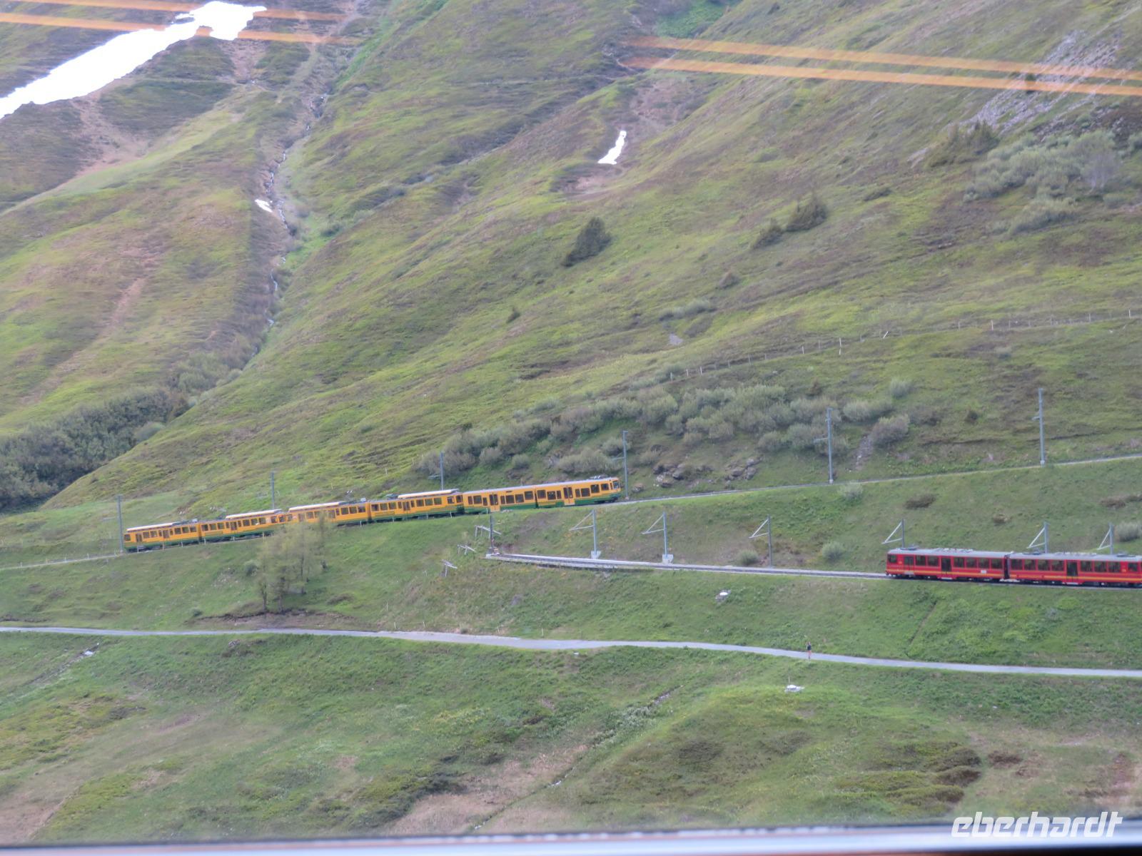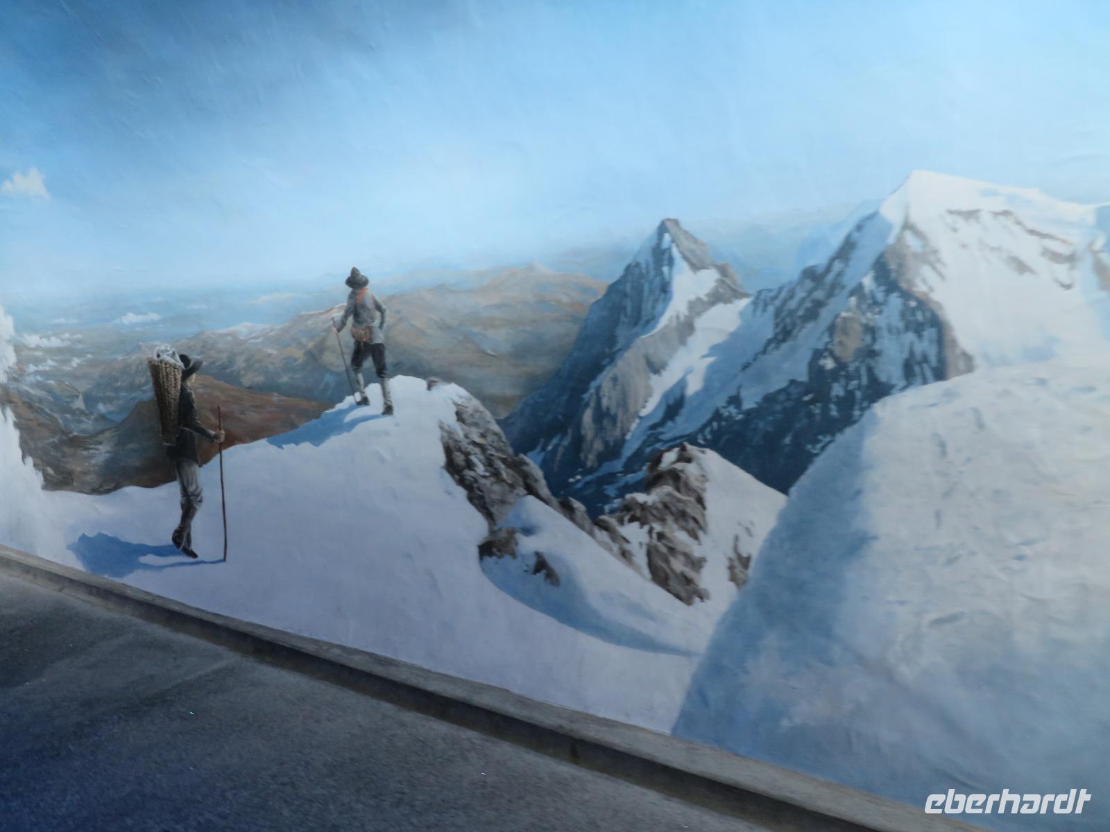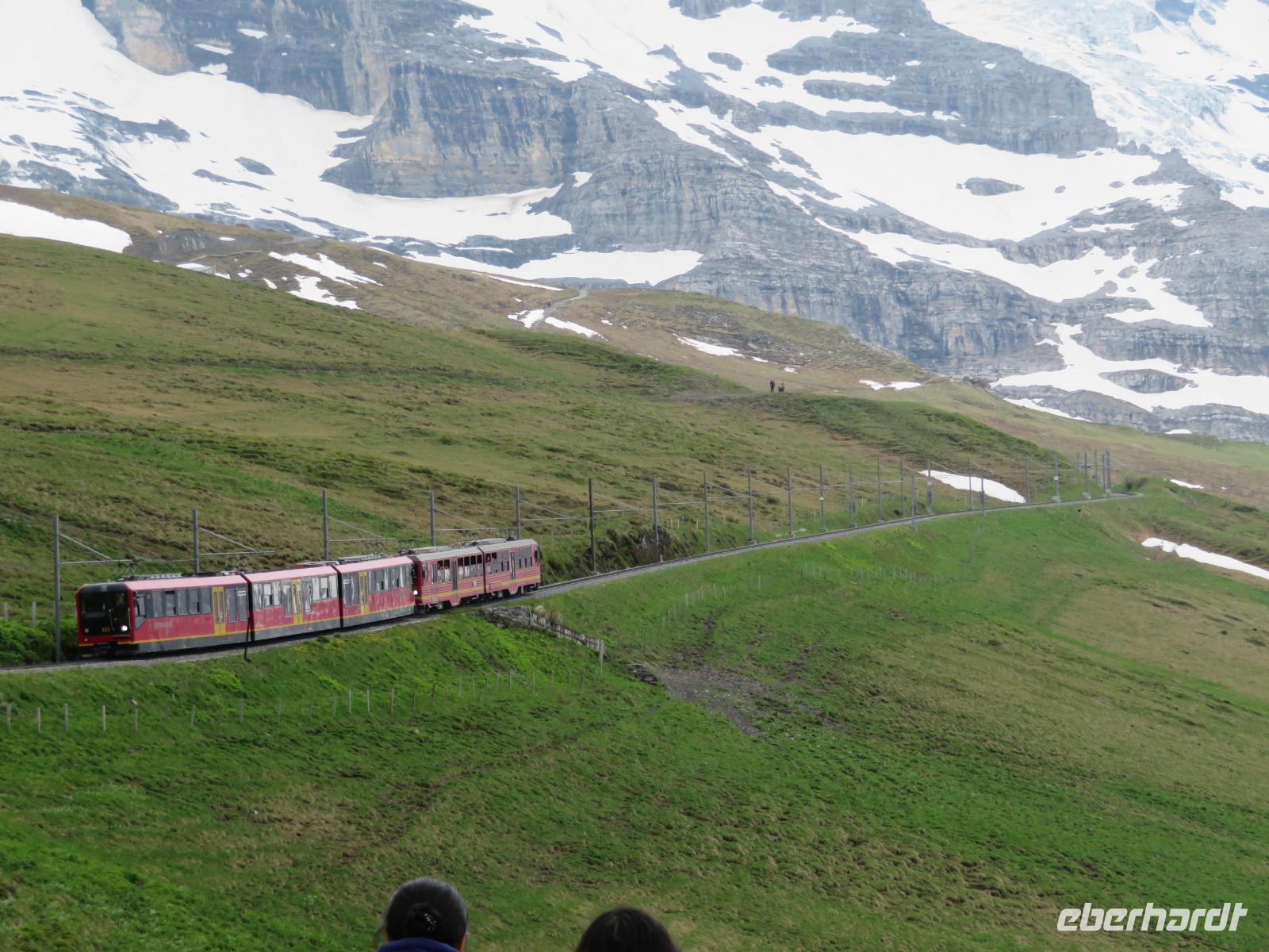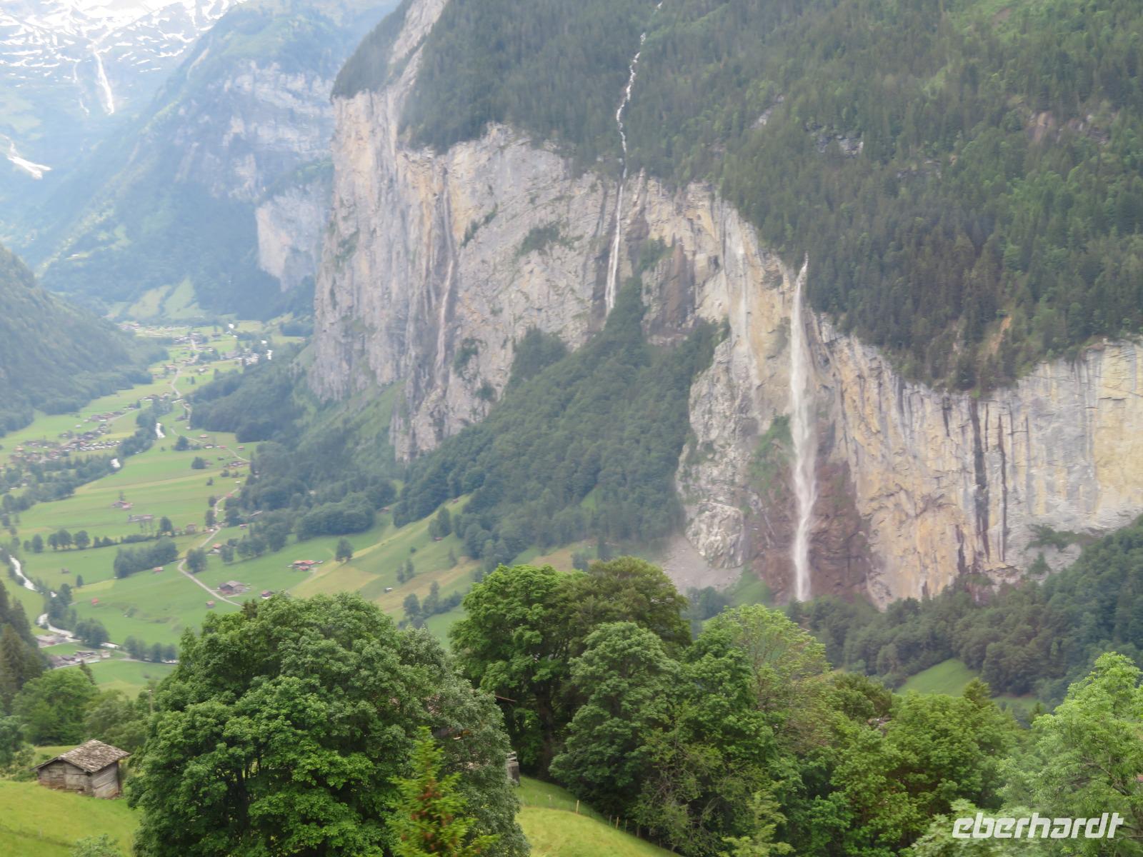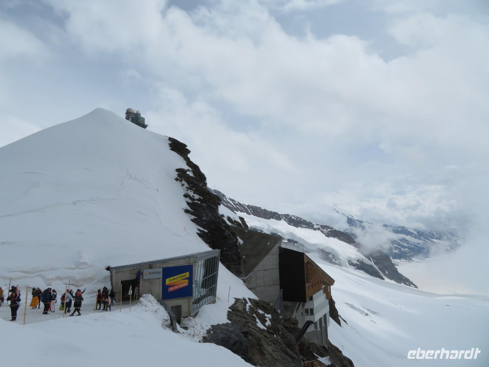 Am heutigen Tag stecken die Berge in dicken Wolken. Das tut aber unserer guten Laune keinen Abbruch und wir sind gespannt auf das Erlebnis auf dem Jungfraujoch. Mit dem Zug fahren wir zunächst nach Grindelwald. Weiter geht es mit der Wengeralp-Bahn zur Kleinen Scheidegg. Schon während der Fahrt sehen wir die dicken Wolken in der Bergwelt des Berner Oberlandes. Angekommen auf der Kleinen Scheidegg können wir nur einen kleinen Teil der Eigernordwand sehen. Nach einem kurzen Aufenthalt fahren wir mit der Jungfraubahn durch den Eiger und den Mönch. Am Eismeer, einem riesigen Gletscherabbruch, legt die Bahn einen kurzen Stopp ein. Doch leider ist auch hier der Gletscher nur zu erahnen. Auf dem Jungfraujoch haben wir genug Zeit während des Rundganges die einmaligen Erlebnisse zu genießen. Auf dem höchsten Aussichtspunkt, der Sphinx erwartetet uns Schneefall und leider keine Sicht. Es gibt jedoch noch viel mehr zu entdecken. Im Berg gehen wir durch die Galerie, die sich mit der Geschichte der Jungfraubahn befasst. Im Eispalast befinden wir uns mitten im Gletschereis ca. 40 Meter unter dem Eis und können schöne Eisplastiken bewundern. Außerdem sehen wir eine Schicht Sägespäne, welche im Jahr 1947 auf den Gletscher aufgebracht wurde, um ihn vor großer Hitze zu schützen. Diese Späne kommen nun im Eispalast wieder zum Vorschein. Auf das Plateau und auf dem Aletschgletscher stehen wir im ewigen Schnee. Wir können nun auch etwas über den Gletscher sehen und der Mönch zeigt sich uns. Nach einem schönen Aufenthalt verlassen wir das Jungfraujoch mit der Bahn wieder Richtung Kleine Scheidegg. Hier wechseln wir nochmals die Bahn und fahren nach Lauterbrunnen. Wir sehen den Männlichen, Wengen und die Loophörner. Ganz beeindruckend sind die vielen Wasserfälle im Lauterbrunnental. Der Staubachfall mit deiner über 300 Meter Fallhöhe ist in seiner vollen Wucht zu sehen. Unmengen von Wasser stürzen auf Grund der immer noch anhaltenden Schneeschmelze in die Tiefe. Von Lauterbrunnen aus bringt uns der Zug der Berner Oberland-Bahn zurück nach Interlaken.