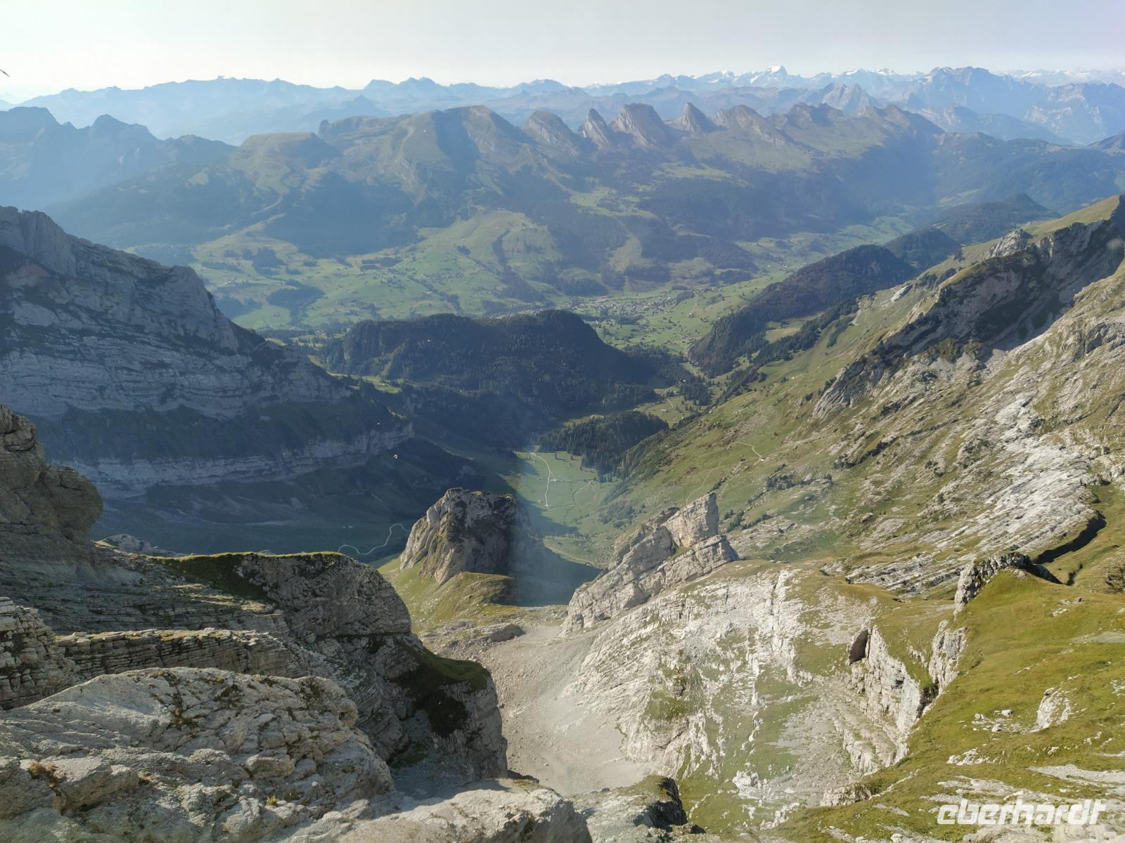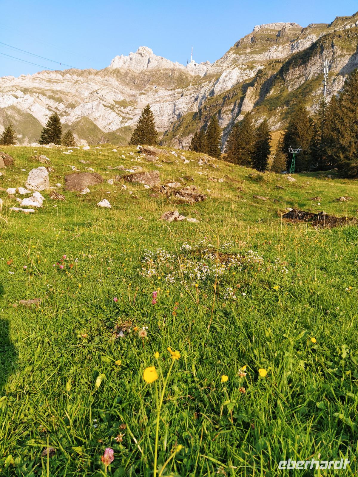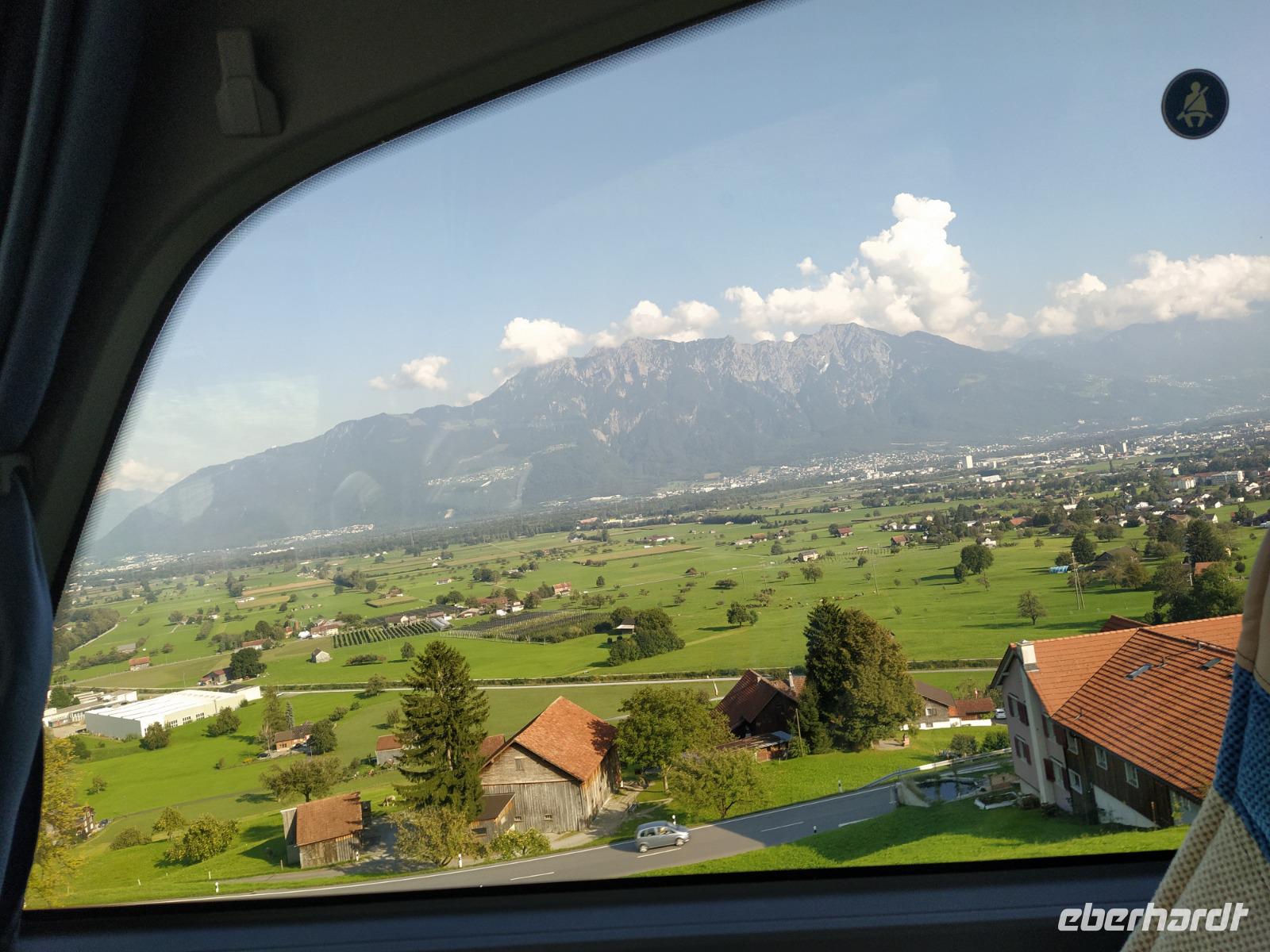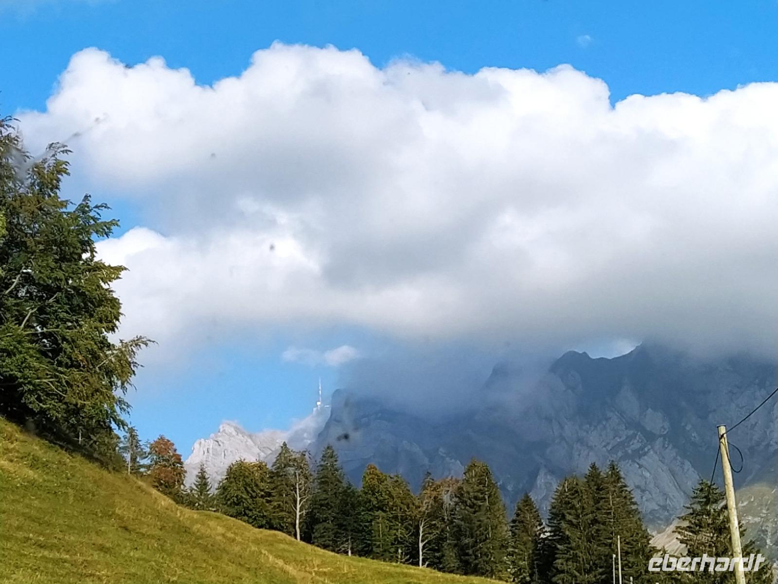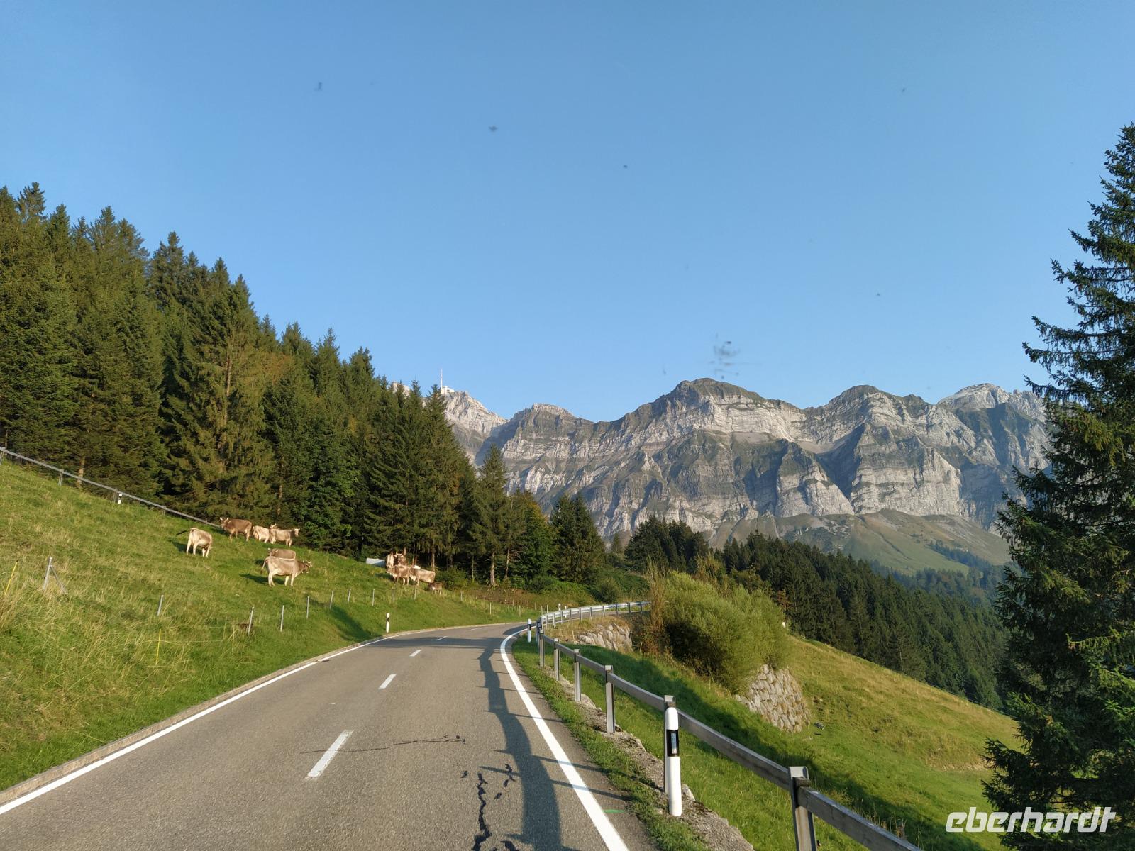 Schon unser erster richtiger Urlaubstag ganz fantastisch: Freier Blick auf den Säntis, Sonnenschein bei 16 Grad am Morgen und bis zum späten Nachmittag sollen es noch 26 Grad werden, und das bei ungetrübten Himmel.