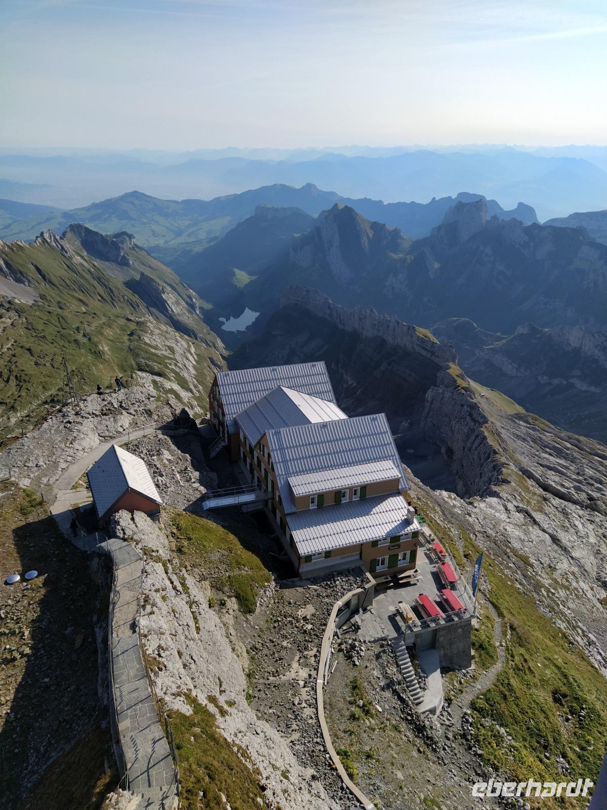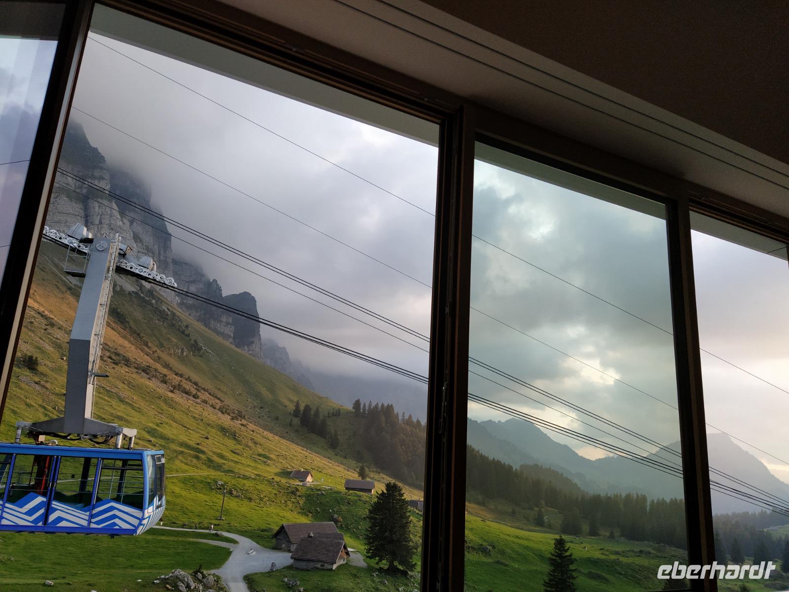 Wer von uns allerdings morgens in seiner Panorama Dusche vor seinem Panoramafenster steht tut gut daran, die Vorhänge trotz des schönen Ausblickes etwas zuziehen, denn das Hotel befindet sich direkt an der Säntis Seilbahn und diese schwebt alle 15-30 Min direkt vor unserem Fenster vorbei.