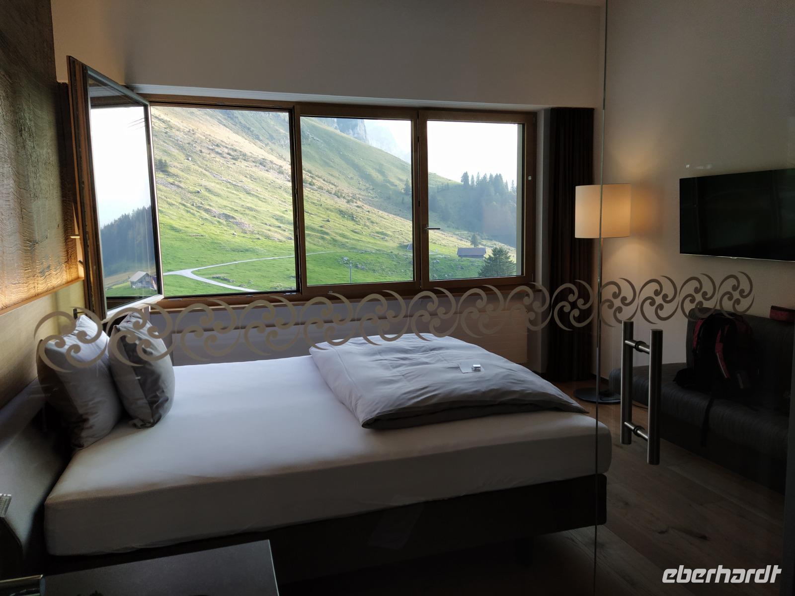 Die fantastischen, fast neuen Zimmer dieses Hotels begeistern uns von Anfang an. Großzügig, geschmackvoll im Design mit viel Holz, Panoramaduschen und Panoramafenster und fast alle Gäste blicken dabei direkt aus dem Bett auf den Säntis und die wunderschöne Landschaft der Schwägalp.