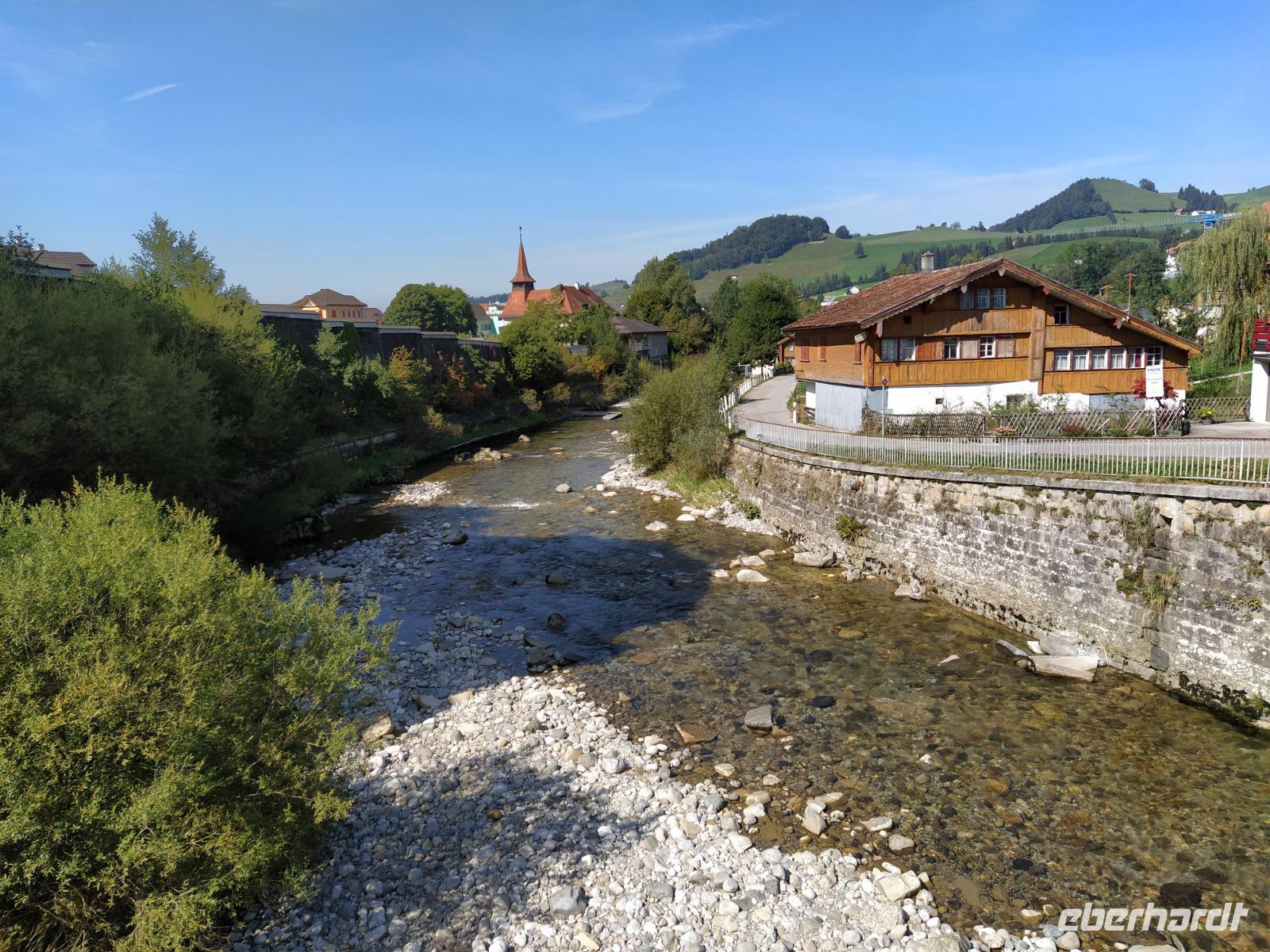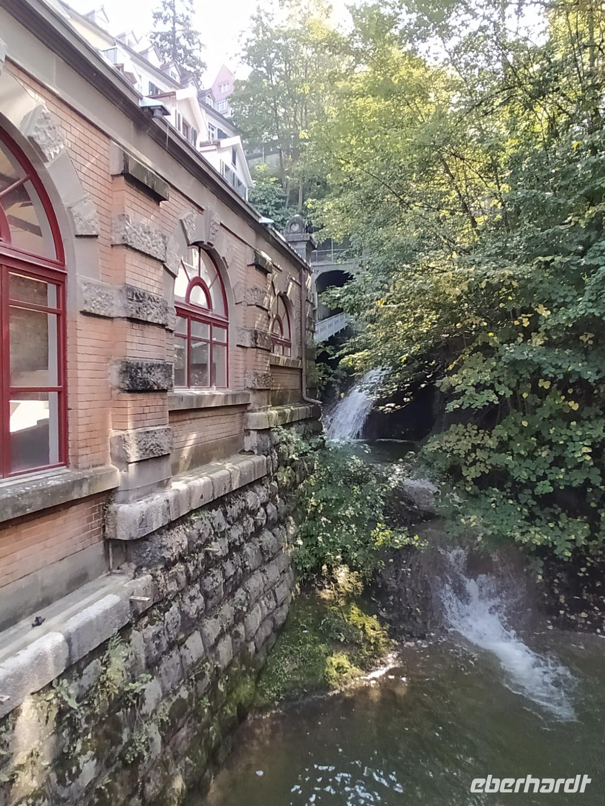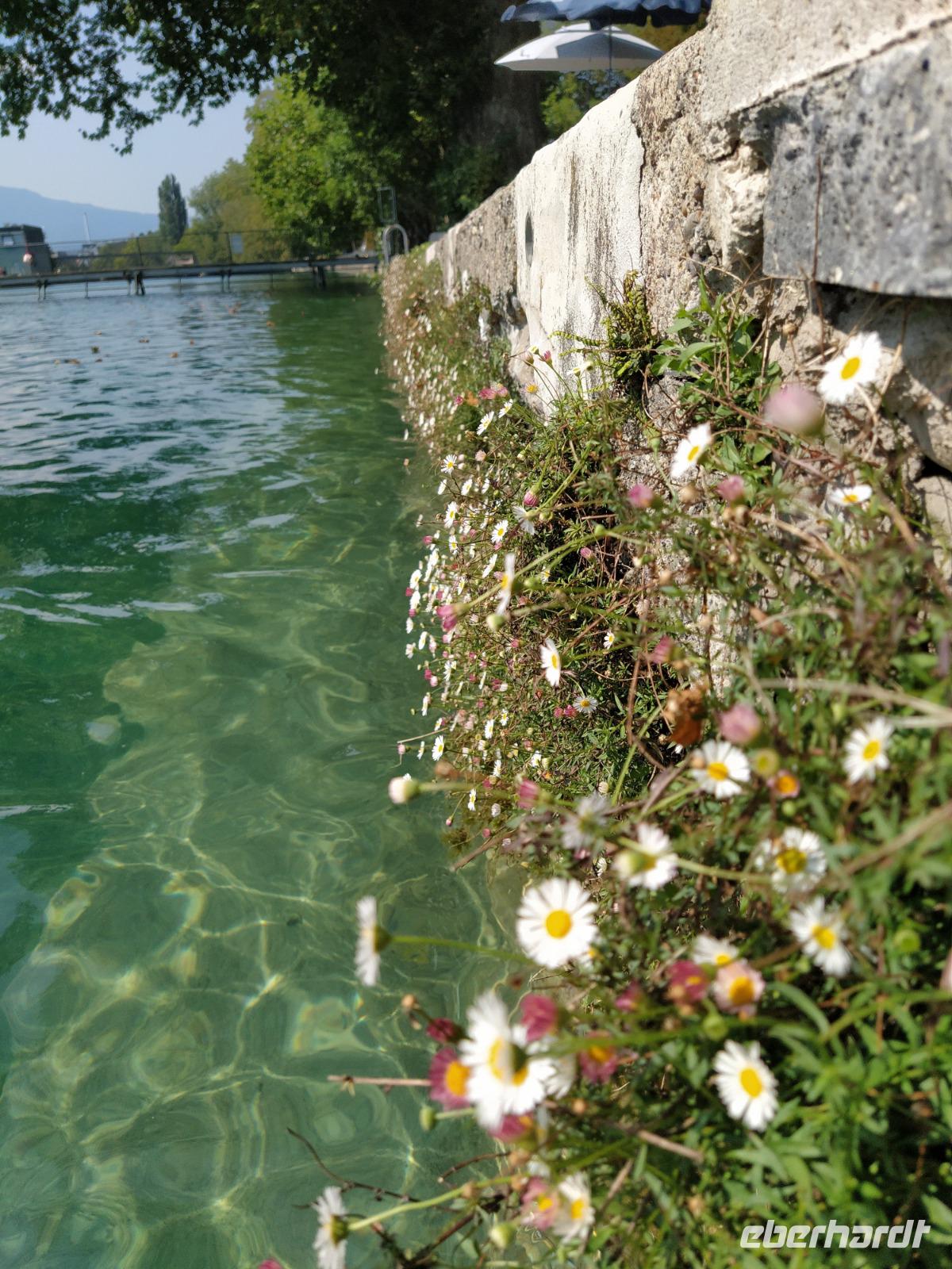 Hier trennen sich unsere Wege und jeder hat nun genügend Zeit noch einmal durch die wunderschöne Altstadt zu Bummeln, seine persönlichen Fotos zu schießen oder eines der Museen zu besuchen, auf dem Schloss in die Türme zu steigen, oder sich in einem der netten Cafés niederzulassen und dem Treiben in der Stadt zuzusehen. Einige von uns treibt es zunächst zurück zu der schönen hölzernen Brücke, wo sich an der Schleuse durch die entstehende Welle eine kleine Anzahl junger Wellenreiter angesammelt hat. Wir beobachten diese gemeinsam und vergeben Punkte je nachdem, ob und wie lange jeder einzelne von ihnen es schafft, sich auf sein Brett zu stellen und auf den Wellen zu reiten. Eine solche Aktivität in glasklarem Wasser mitten in einer 44.000 Einwohner Stadt fasziniert uns. Einige zieht es dann doch eher in die Fußgängerzone wo links und rechts die Geschäfte ihre Waren ausgestellt haben. Ein paar Souvenirs wären noch angesagt oder auch Lebensmittel für zu Hause von spezieller schweizerischer Art und Qualität? All dies ist hier zu finden. Die Zeit vergeht wie im Flug und wir treffen uns an der Bootsanlegestelle wieder.