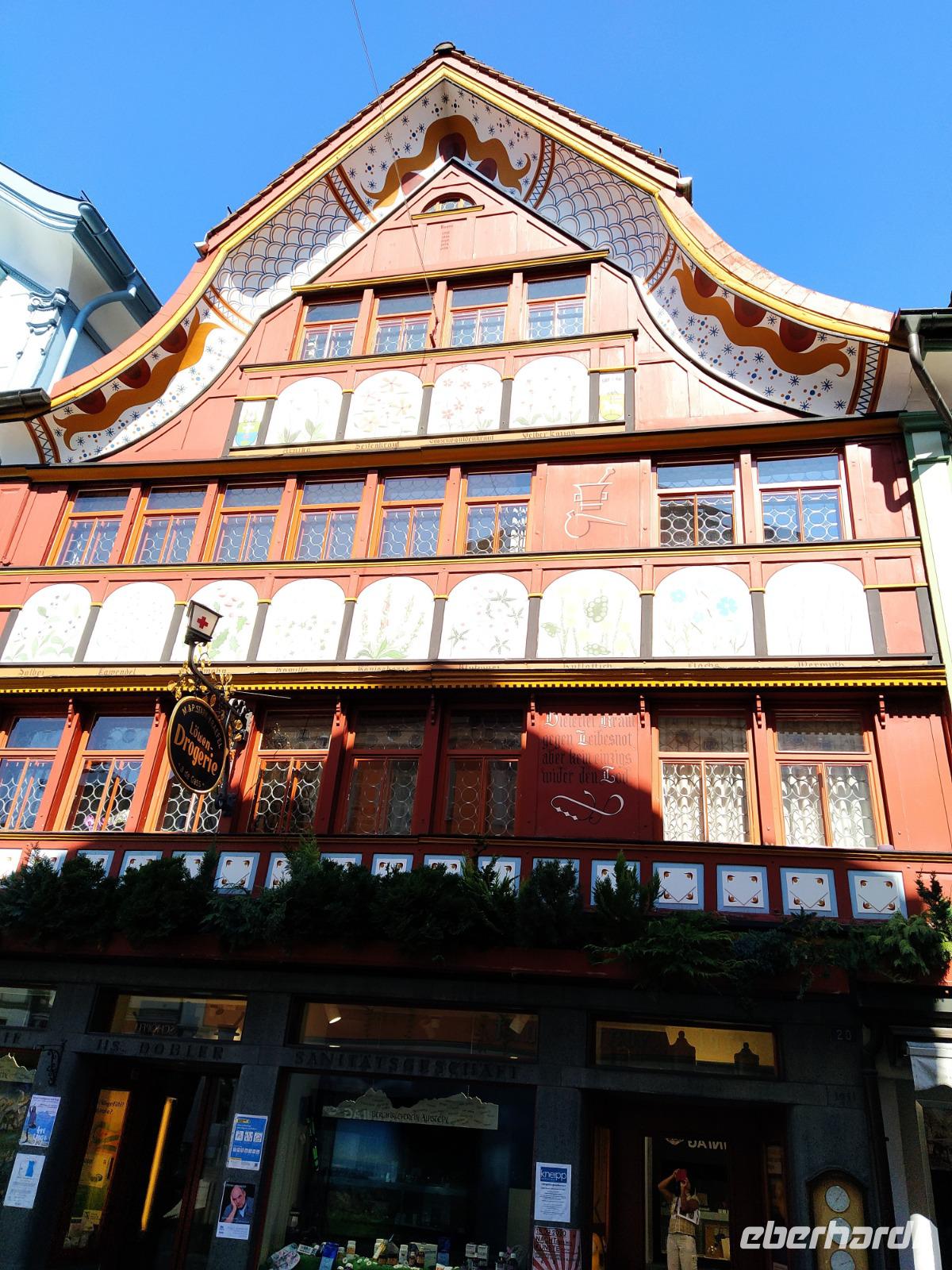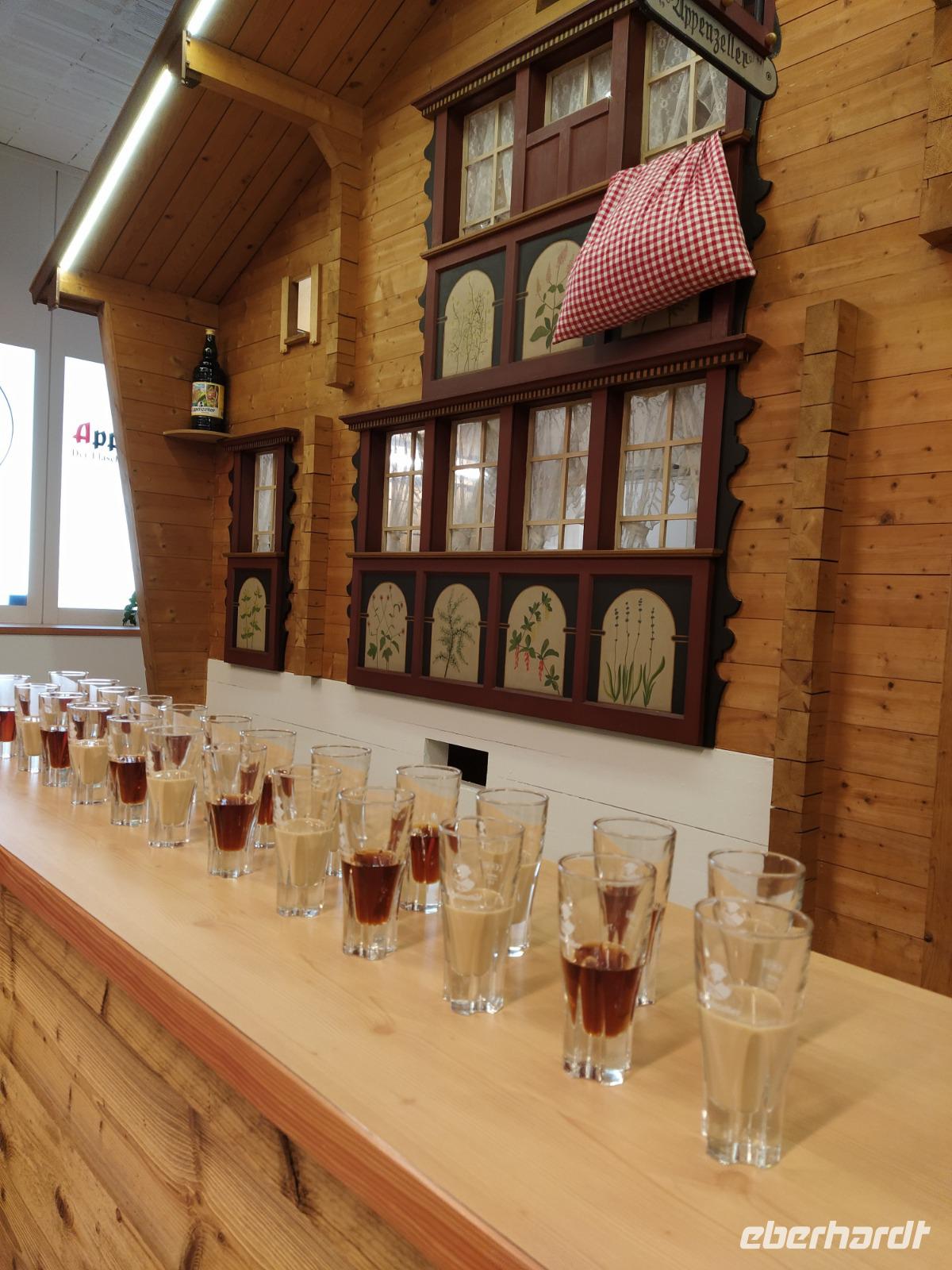 Gut gestärkt starten wir die Besichtigung der Säntis Anlagen und besuchen anschließend die Aussichtsterrassen. Fantastische Blicke bei der immer höher steigenden Sonne und angenehmen Temperaturen erwarten uns. Unsere Pullover haben wir schon nach und nach ausgezogen oder gar umsonst mitgenommen. Nicht verwunderlich, dass sich nach unserer Talfahrt in der kurzen Auszeit alle etwas Luftigeres anziehen, insbesondere leichtes Schuhwerk. Nach kurzer Fahrt erreichen wir Appenzell, wo wir zunächst eine Besichtigung der Alpenbitter AG vornehmen. Hier erfahren wir, wie der berühmte Appenzeller Alpenbitterlikör entsteht. Kräuter mit und ohne Sahne, Ingwer, Schnaps und Eierlikör, Haselnuss Sahne Likör und Orangen Gin... viele viele Degustationen schliessen die interessante Besichtigung ab. Dann starten wir unseren Fußmarsch durch das beschauliche nette Örtchen Appenzell und bestaunen die prachtvollen Bauernmalereien an den Fassaden, Erker, die Schmiedeeisernen Zunftschilder, Beschriftungen und die niedlichen einladenden Shops in der Hauptgasse und den Nebenstraßen. Eine ziemlich heiter-fröhliche Gruppe versammelt sich wieder am Bus, um die Rückfahrt zum Hotel anzutreten.