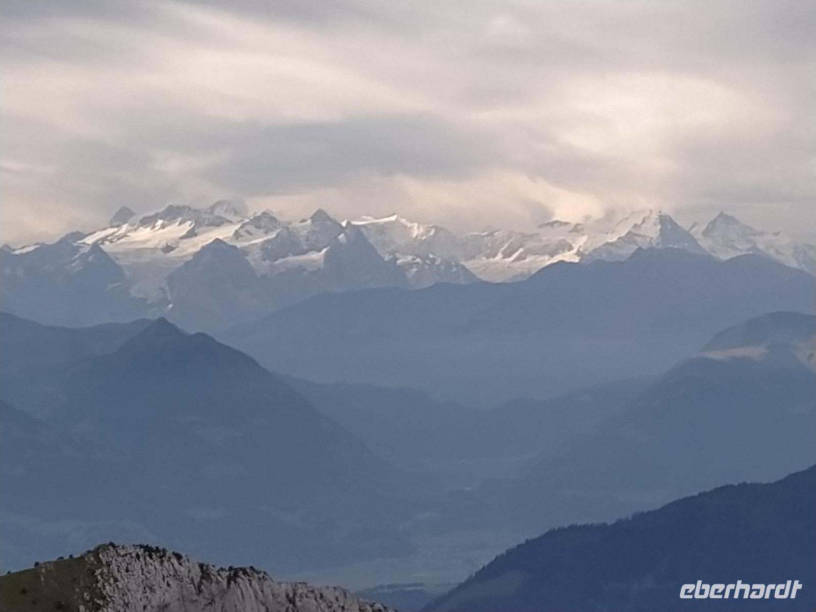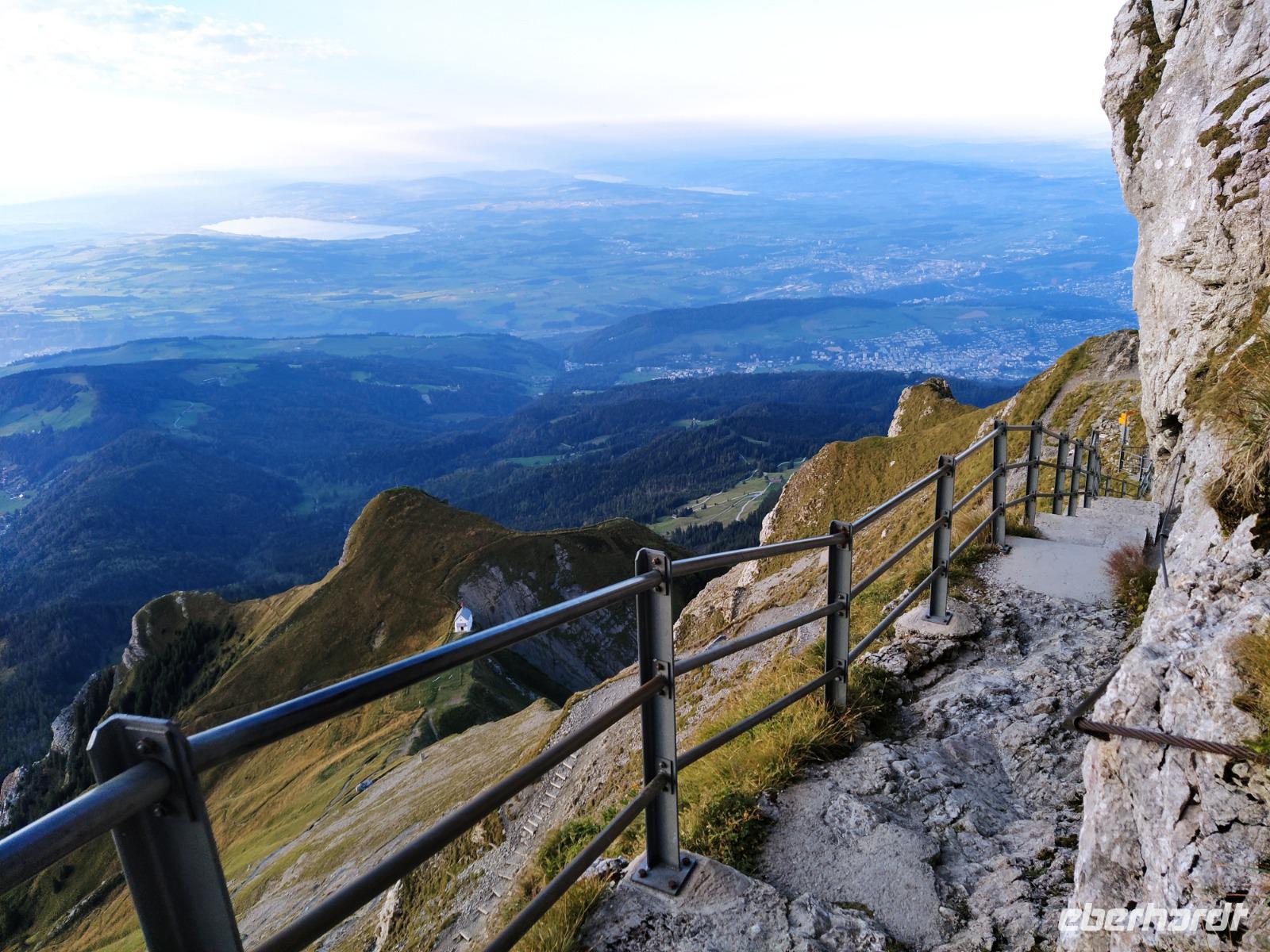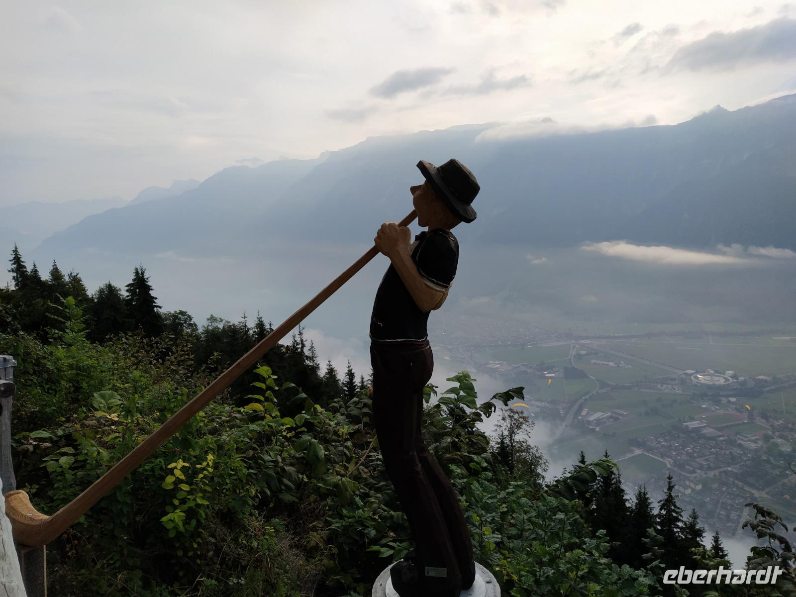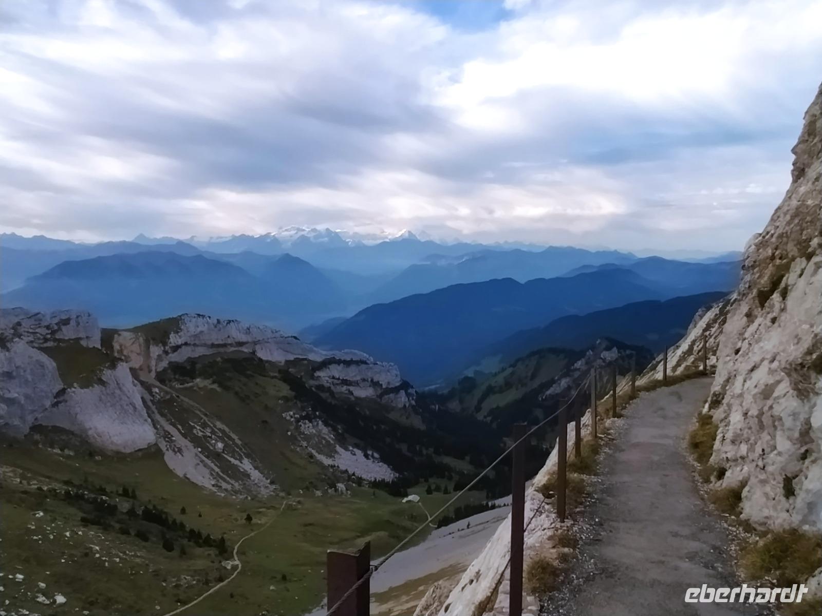 Oben am Harder Kulm gibt es mehrere kürzere und längere Rundwege. Am meisten angezogen fühlen sich die Gäste jedoch von der weit nach vorn ragenden Aussichtsterrasse, wo Touristen aus aller Welt Fotos schießen. Der Blick von dort geht hinaus auf den See und weit hinunter ins Tal, aber auch hinüber zu unserem erst vorgestern besuchten Dreigestirn Jungfrau, Mönch und Eiger. Diese sind heute zwar ein wenig von Wolken verhangen aber dennoch gut erkennbar. Die Luft ist etwas kühler als die Tage davor und wir atmen tief durch.