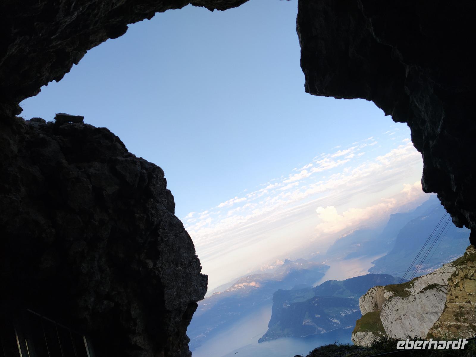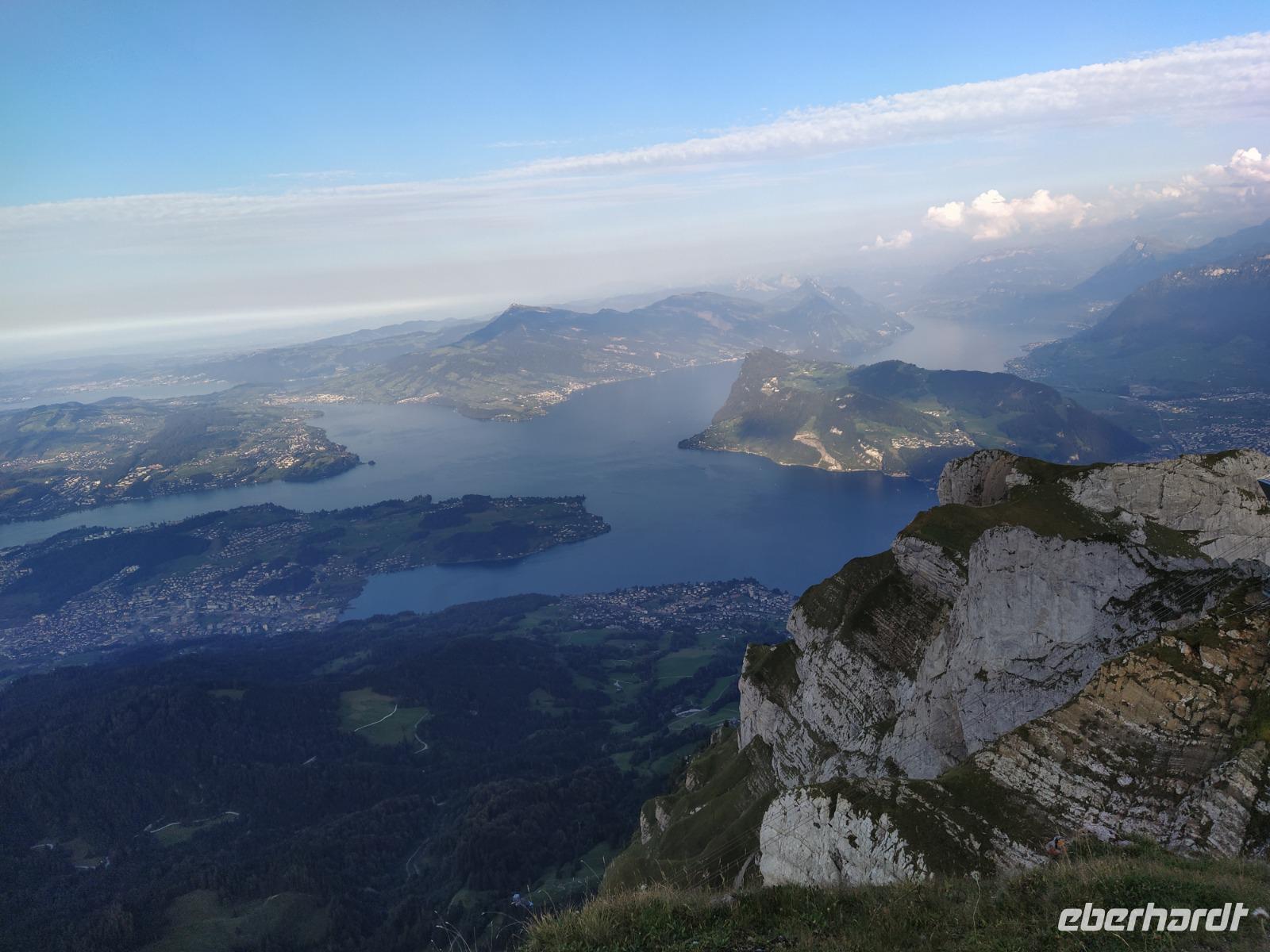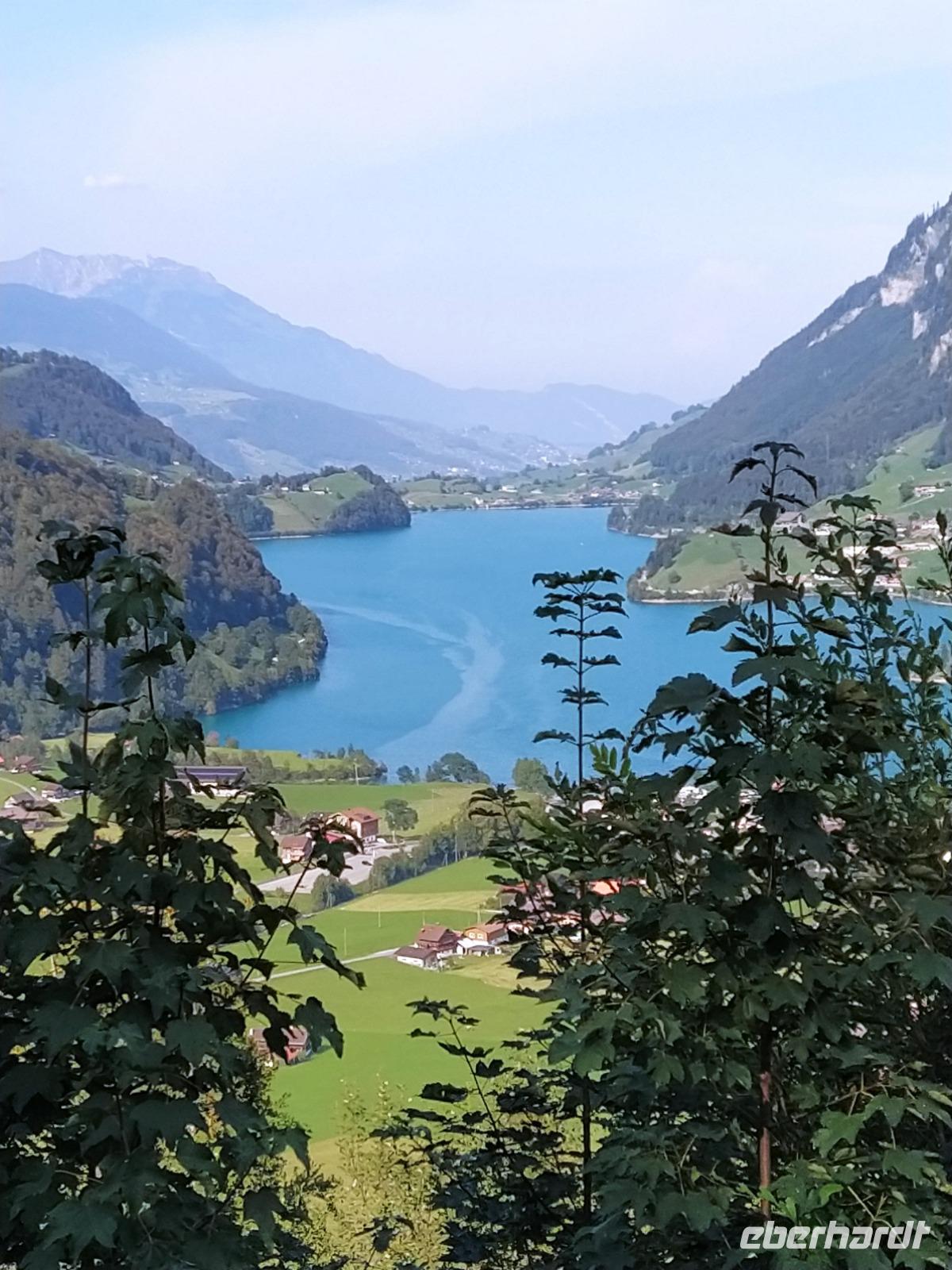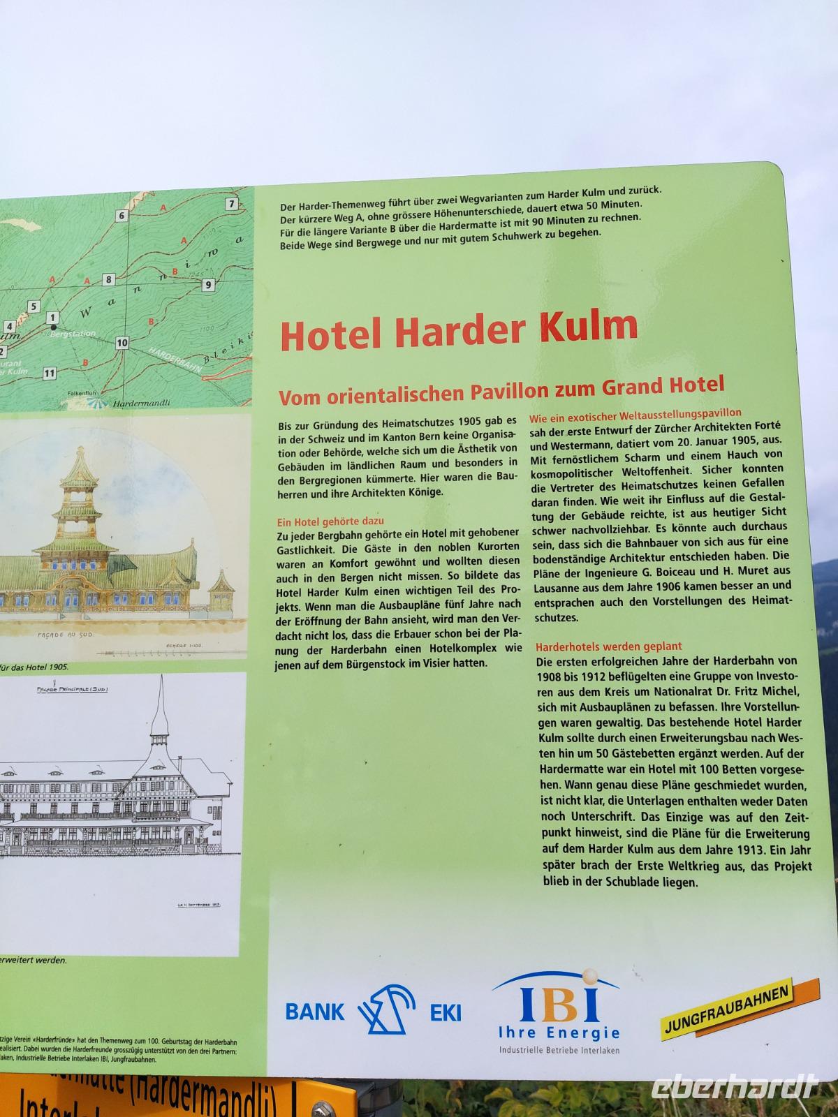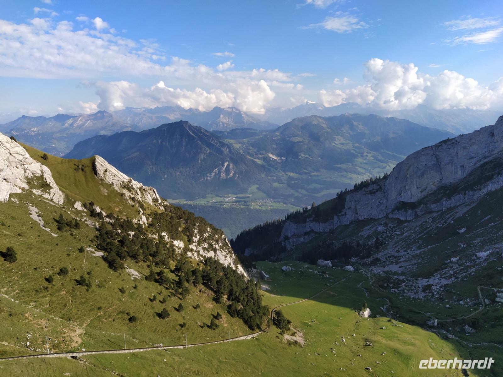 Oben am Harder Kulm gibt es mehrere kürzere und längere Rundwege. Am meisten angezogen fühlen sich die Gäste jedoch von der weit nach vorn ragenden Aussichtsterrasse, wo Touristen aus aller Welt Fotos schießen. Der Blick von dort geht hinaus auf den See und weit hinunter ins Tal, aber auch hinüber zu unserem erst vorgestern besuchten Dreigestirn Jungfrau, Mönch und Eiger. Diese sind heute zwar ein wenig von Wolken verhangen aber dennoch gut erkennbar. Die Luft ist etwas kühler als die Tage davor und wir atmen tief durch.