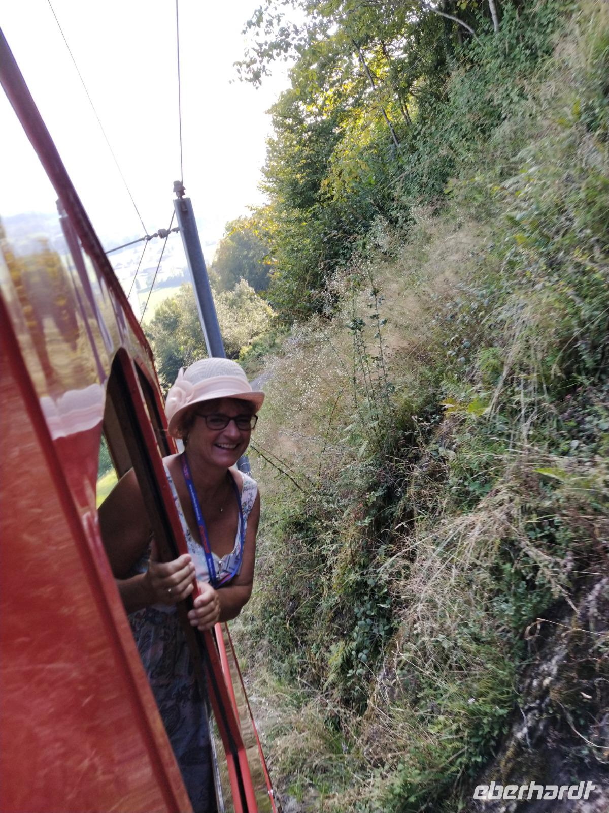 Fast alle Gäste haben sich für den heutigen Tag einen Ausflug zum Harder Kulm vorgenommen. Mit der Standseilbahn dauert die Fahrt nur wenige Minuten auf den 1.322 Meter hohen Hausberg Interlakens, der zur Bergruppe der Emmentaler Alpen gehört. Dort angekommen treffen wir unseren Busfahrer Falk. Er hatte sich vorgenommen, zu Fuß hoch zu gehen, ca. zweieinhalb Stunden brauchte er dafür wie er uns erzählt.