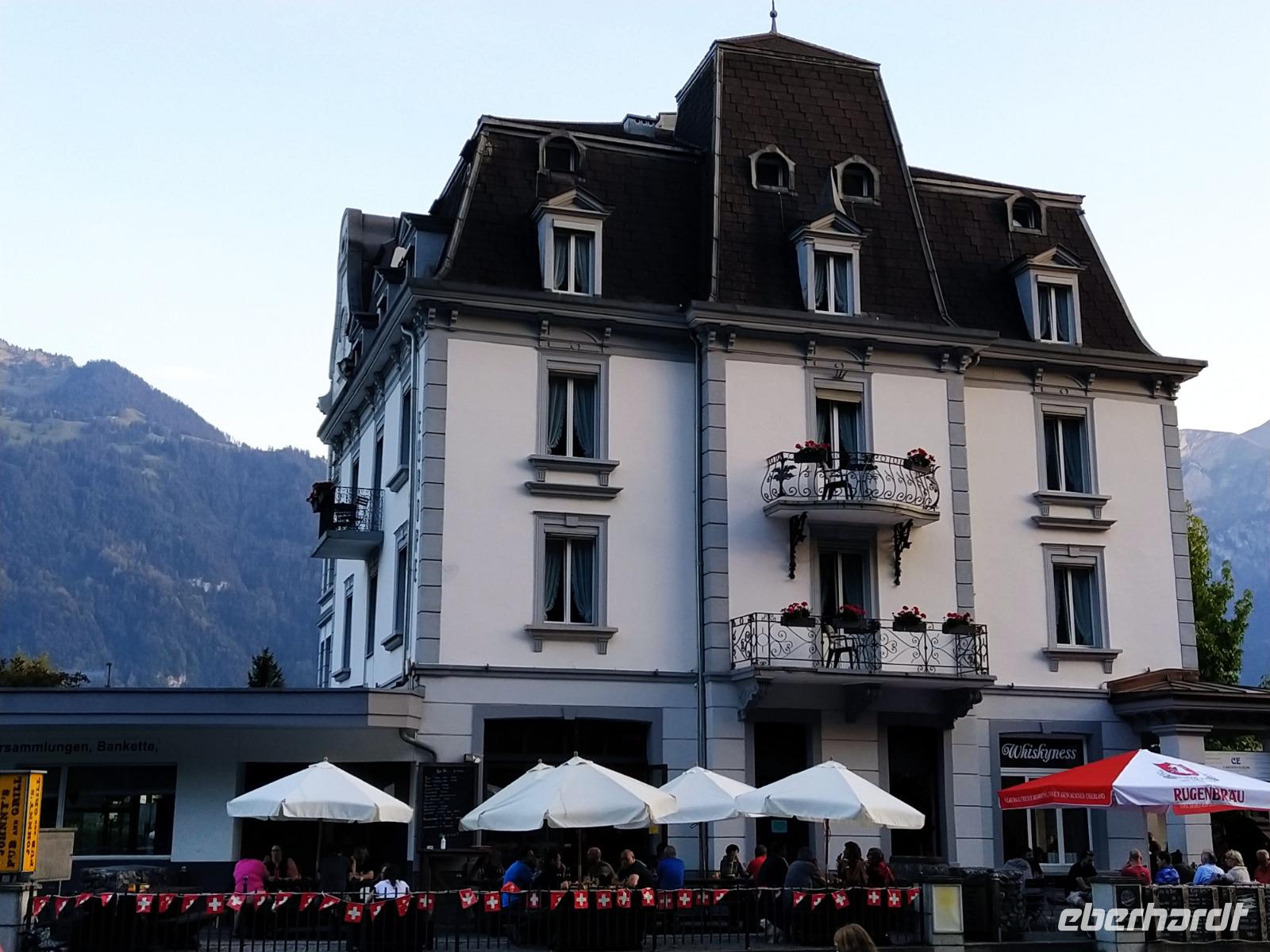 Unsere anschließende Busfahrt zum Hotel in Interlaken genießen wir zufrieden, etwas müde aber zurückgelehnt in den Bus-Sessel und lassen die Landschaft, die Berge und die niedlichen Dörfer am Seeufer an uns vorüber ziehen. Schließlich erreichen wir das wunderschöne Carlton Europe Hotel in Interlaken. Es soll das letzte dieser Reise sein, wo wir noch 4 Nächte verbringen werden. Nach einem kurzen Begrüßungstrink beziehen wir unsere Zimmer und genießen dann ein wunderbares Abendessen vor den Fenstern des schönen Gartens des Hotels.