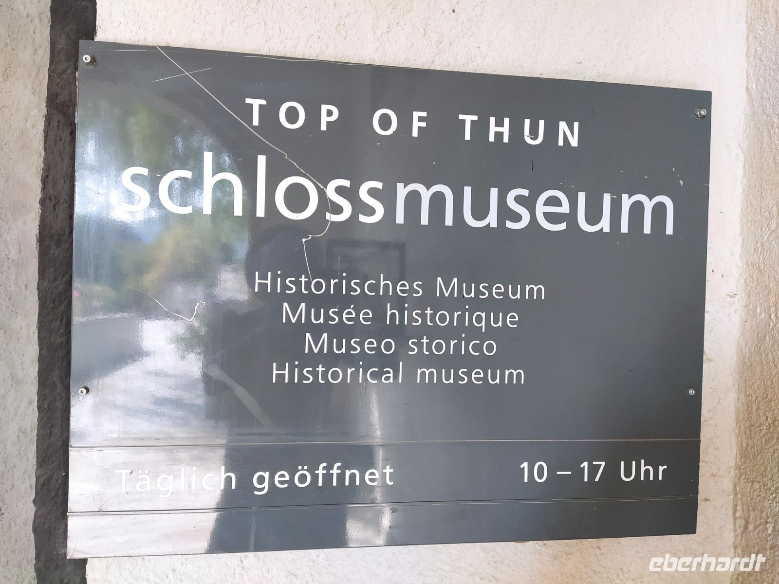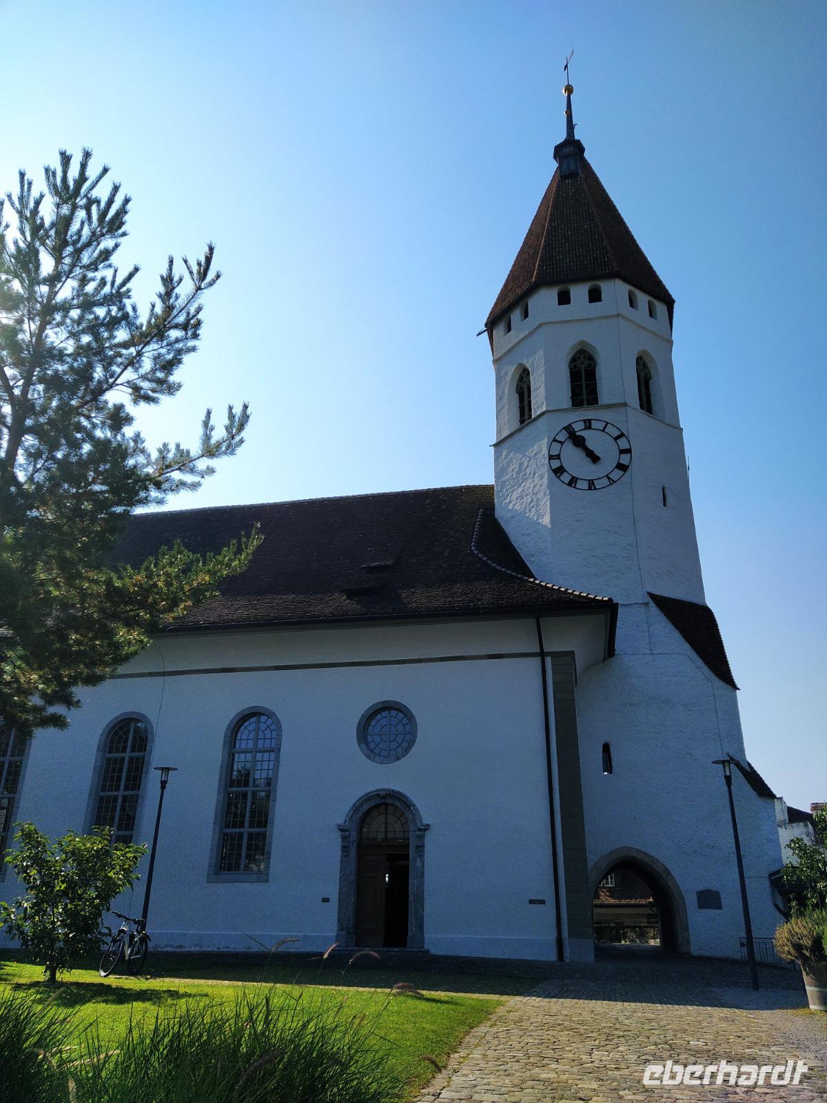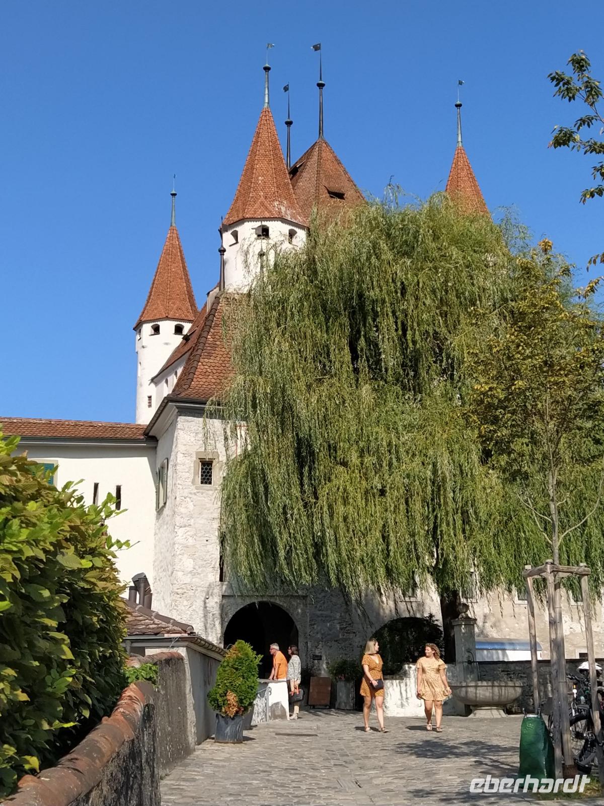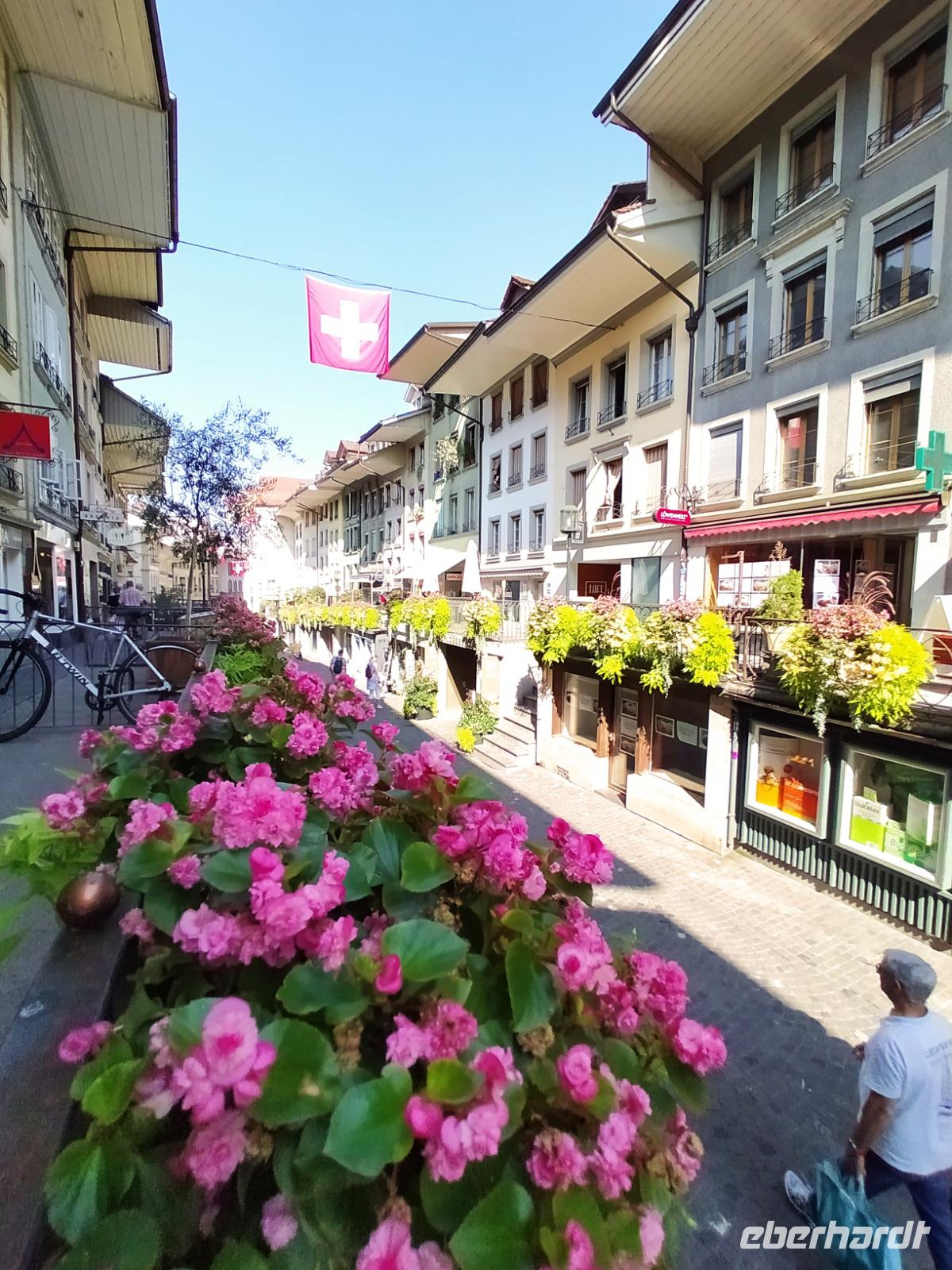 Patricia, unsere Stadtführerin, führt uns zunächst ans Ufer der Aare, vorbei an der Schleuse mit der wunderschönen Blumen geschmückten hölzernen Brücke, vorbei am Rathausplatz und hinauf zur Stadtkirche und dann zum Schloss. Bei 25° kommen wir dabei ganz schön ins Schwitzen. Nach ausführlichen Erläuterungen zur Geschichte des Schlosses und der Stadt gehen wir gemeinsam wieder hinunter in die Fußgängerzone.