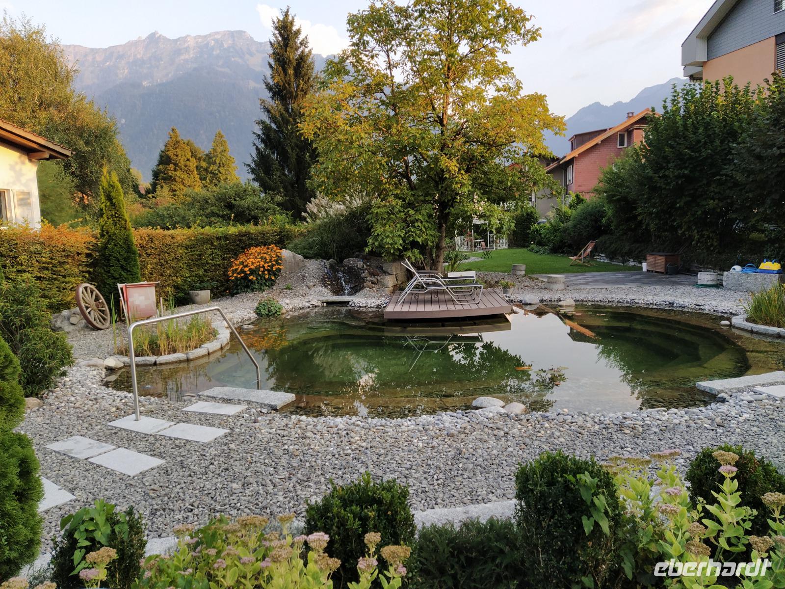 Das Cafe auf der Terrasse lädt zu einem zweiten Frühstück oder Kaffee ein. Gegen Mittag werden wir von einem kleinen Regen überrascht, der war für heute gar nicht angekündigt.... So zersplittert sich die Gruppe ein bisschen einige bleiben unter den großen Schirmen des Kaffees sitzen, andere wagen noch einen kleinen Spaziergang und wieder andere treten etwas früher als geplant die Rückfahrt mit der Bahn an, um den Rest des Tages im Hotel zu verbringen, etwa am Naturbadeteich, oder zu bummeln oder auf andere Weise den Rest des Tages in Interlaken zu verbringen.