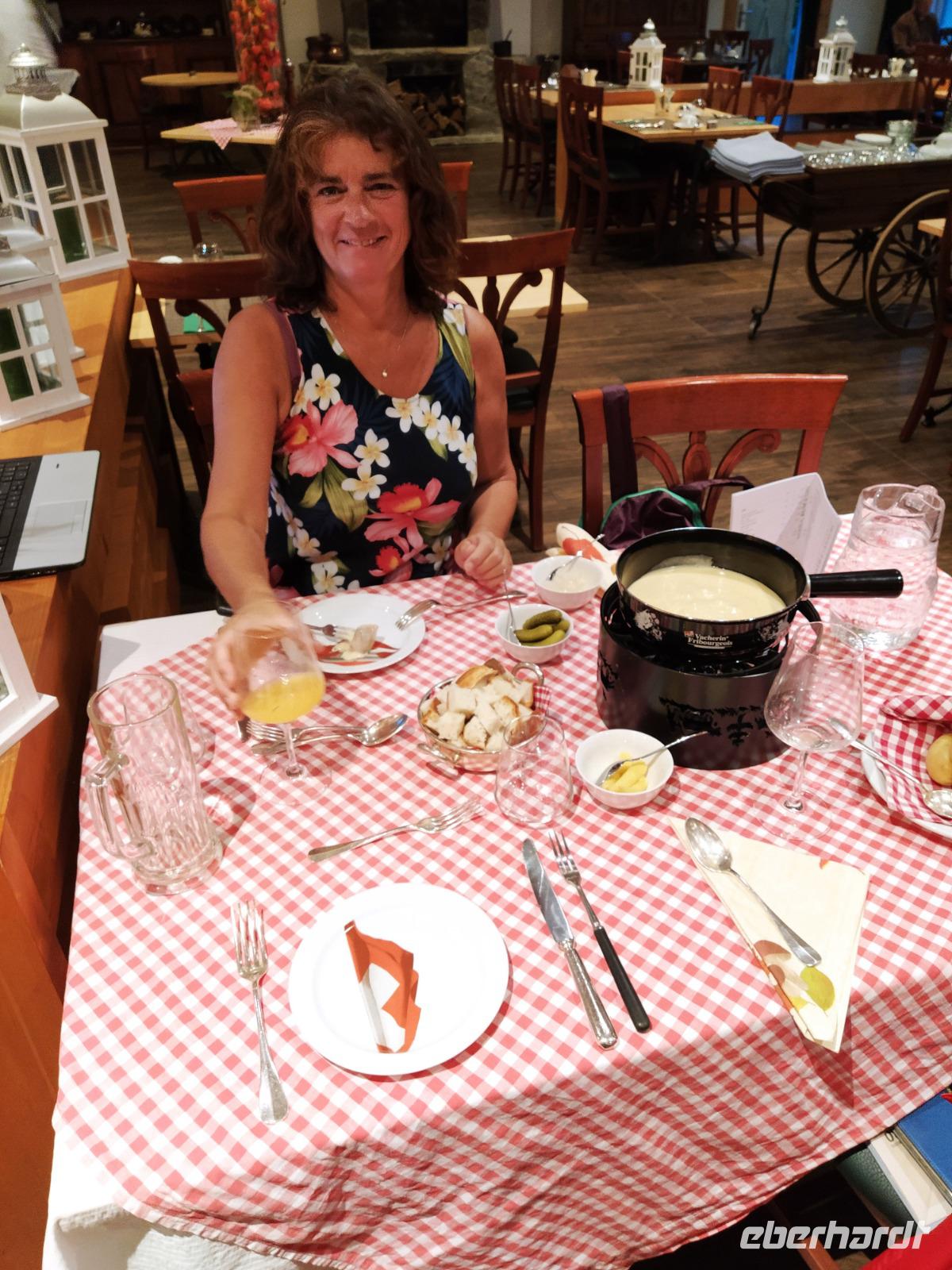 Für den Abend haben wir uns etwas besonderes einfallen lassen, nicht nur, dass einer der Gäste seinen 80 Geburtstag feiert.... nehmen wir unseren letzten Abend zum Anlass um vom Hotel ein typisch Schweizer Gericht, nämlich Käsefondue servieren zu lassen. Eigentlich muss nach Schweizer Ordnungsprinzip derjenige allen einen Schnaps bezahlen, der sein Brot im Käsepot verliert. Da wir jedoch ein glückliches und großzügiges Geburtstagskind unter uns haben übernimmt dieser eine extra Runde für die ganze Gästegruppe. Herzlichen Dank.