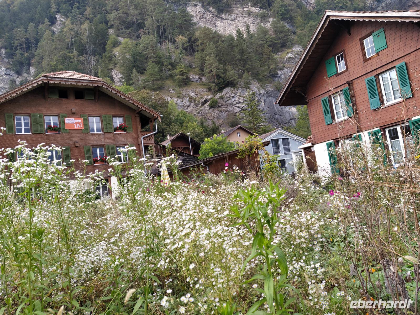 Nach zweieinhalb Stunden nehmen wir, noch immer nicht gesättigt von den hiesigen Eindrücken, Platz in der Zahnradbahn bergabwärts. Eine genauso aufregende wie erlebnisreiche Talfahrt steht uns bevor. Diesmal nehmen wir den Weg über Grindelwald, um wieder in Interlaken Ost anzukommen. Nichts aber auch gar nichts hat heute gefehlt. Satt grüne Weiden, Almrinder, Blumen, grüne Wiesen, schicke Dörfer mit alten Häusern, der Gletscher, die Felsen, die Kraft und Souveränität des Dreigestirns Eiger, Mönch und Jungfrau und das Alles im Sonnenschein.....
