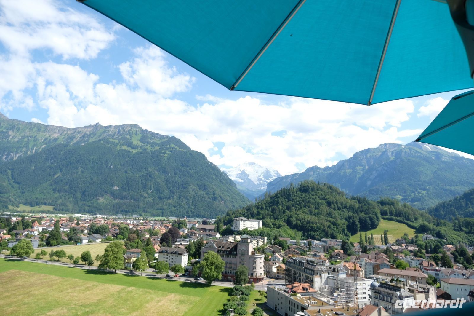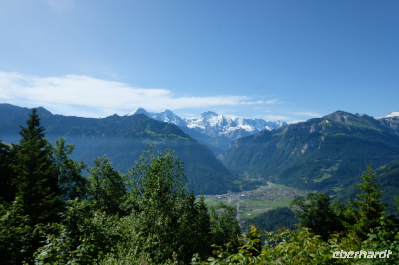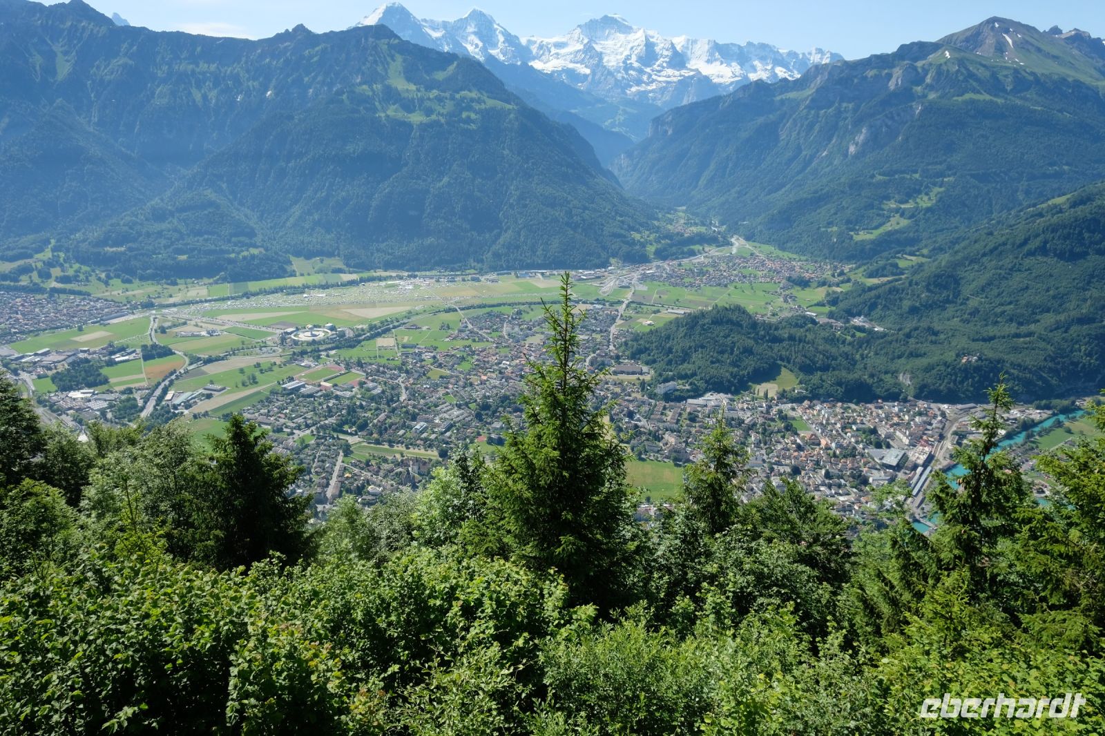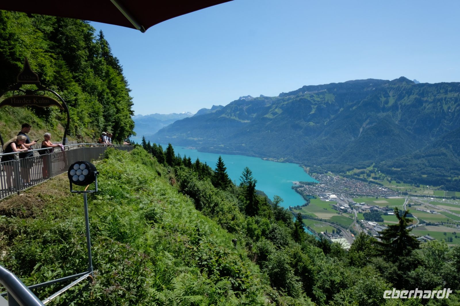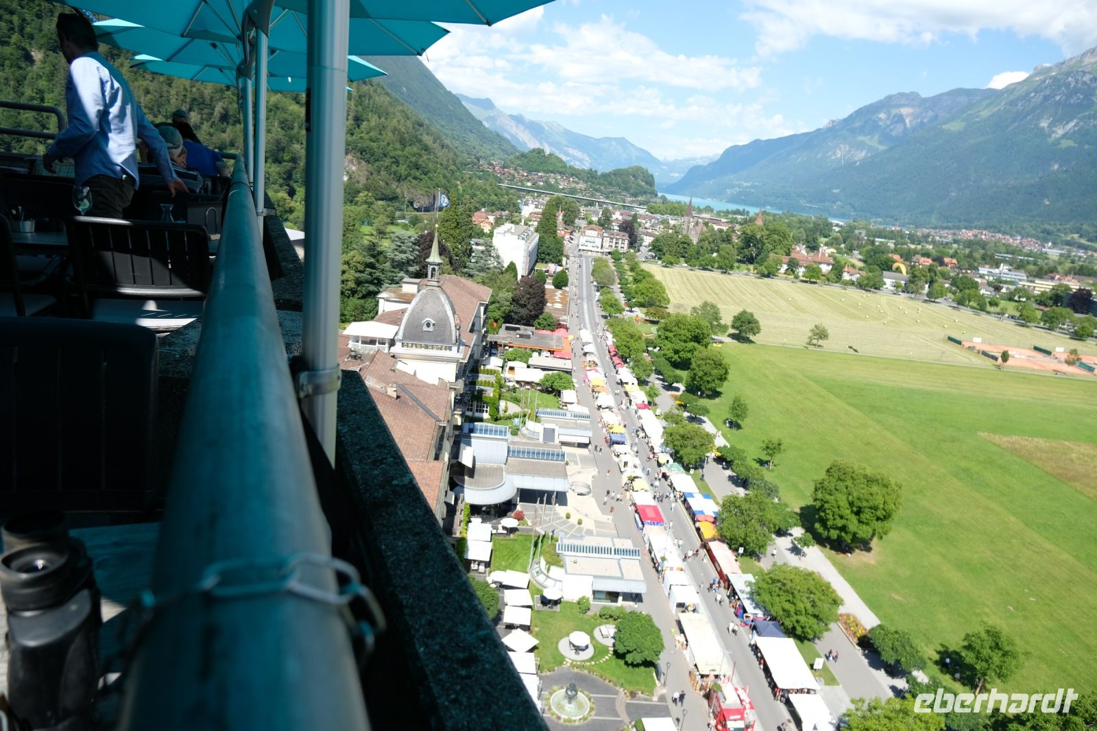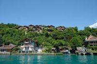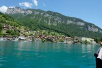 Der heutige Tag stand ganz im Zeichen von Interlaken und dessen schöner Umgebung. Die meisten unserer Gäste unternahmen an diesem herrlichen Sommertag einen Ausflug auf den Harder Kulm, den Hausberg Interlakens. Die Talstation der modernen Standseilbahn war immerhin nur einen kurzen Fußweg von unserem Hotel entfernt und durch die Vorlage unserer Gästekarte konnten wir zu einem ermäßigten Preis in nur etwa 10 Minuten hinauffahren. Hätte Interlaken einen König, dann würde dieser mit großer Sicherheit hier auf dem Kulm residieren, denn von der Aussichtsplattform auf 1.322 m ü. d. M. sähe er gnädig auf Brienzer- und Thunersee hinunter oder würde Eiger, Mönch und Jungfrau betrachten. Das Panorama-Restaurant auf dem Harder Kulm erinnert nämlich tatsächlich an ein Schloss und um dieses zu besuchen, braucht man allerdings kein König zu sein. Es war einfach traumhaft und einmalig schön! Am Nachmittag konnten wir dann das städtische Flair Interlakens erleben und nach Herzenslust durch den Ort bummeln.