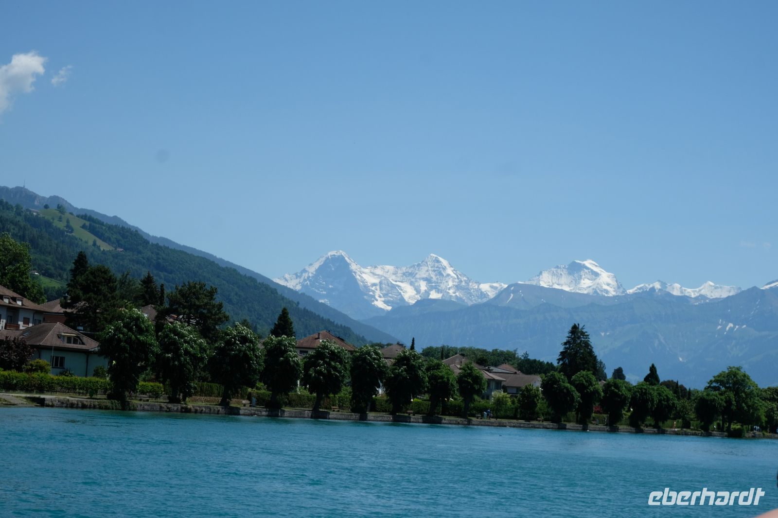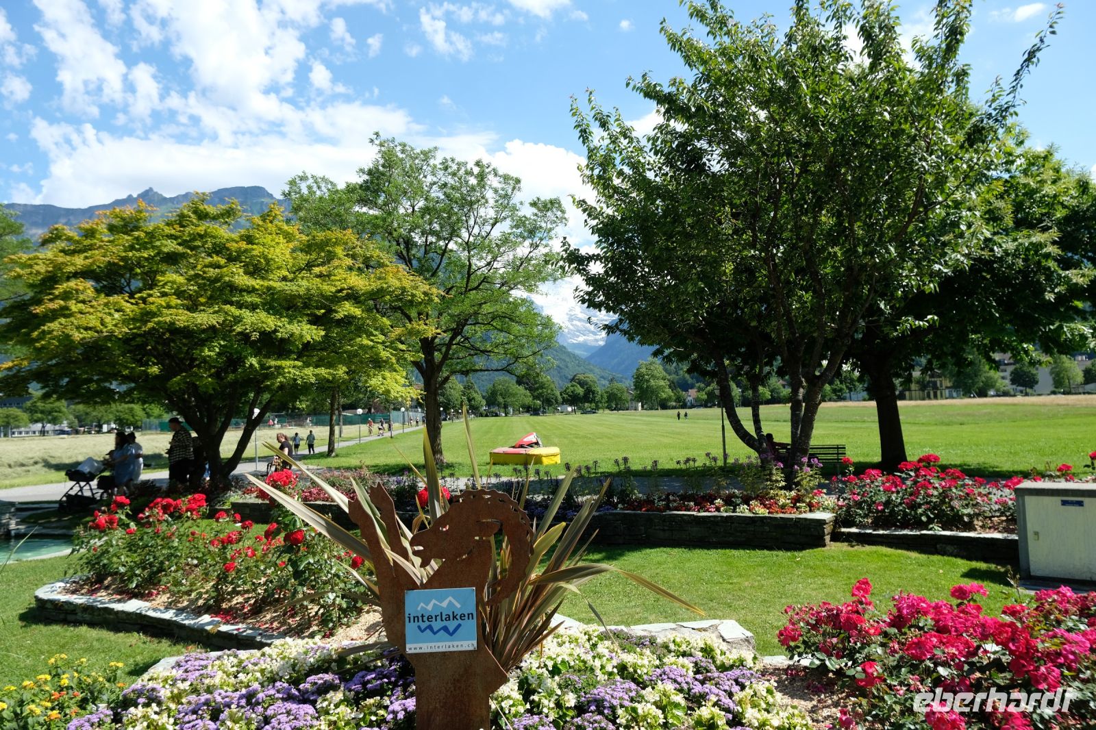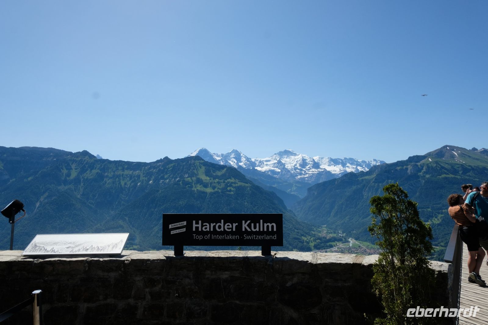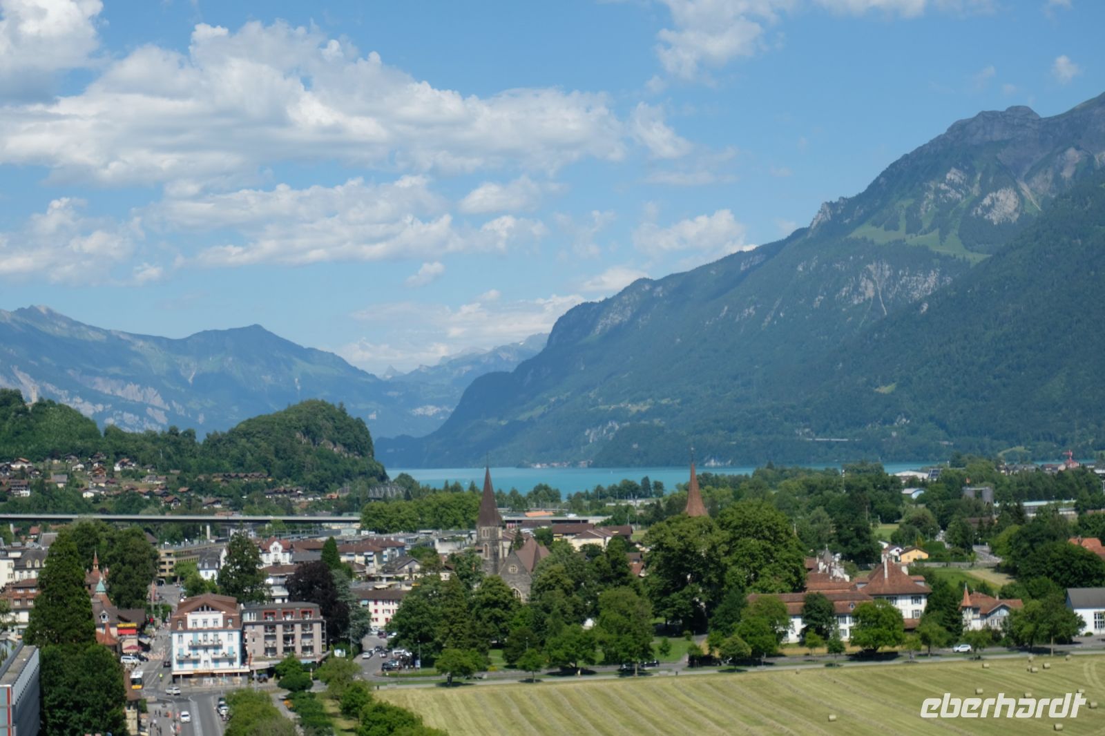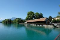 Der heutige Tag stand ganz im Zeichen von Interlaken und dessen schöner Umgebung. Die meisten unserer Gäste unternahmen an diesem herrlichen Sommertag einen Ausflug auf den Harder Kulm, den Hausberg Interlakens. Die Talstation der modernen Standseilbahn war immerhin nur einen kurzen Fußweg von unserem Hotel entfernt und durch die Vorlage unserer Gästekarte konnten wir zu einem ermäßigten Preis in nur etwa 10 Minuten hinauffahren. Hätte Interlaken einen König, dann würde dieser mit großer Sicherheit hier auf dem Kulm residieren, denn von der Aussichtsplattform auf 1.322 m ü. d. M. sähe er gnädig auf Brienzer- und Thunersee hinunter oder würde Eiger, Mönch und Jungfrau betrachten. Das Panorama-Restaurant auf dem Harder Kulm erinnert nämlich tatsächlich an ein Schloss und um dieses zu besuchen, braucht man allerdings kein König zu sein. Es war einfach traumhaft und einmalig schön! Am Nachmittag konnten wir dann das städtische Flair Interlakens erleben und nach Herzenslust durch den Ort bummeln.
