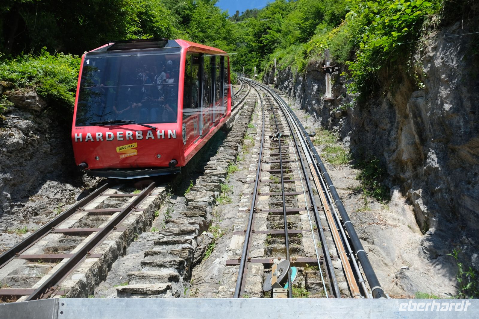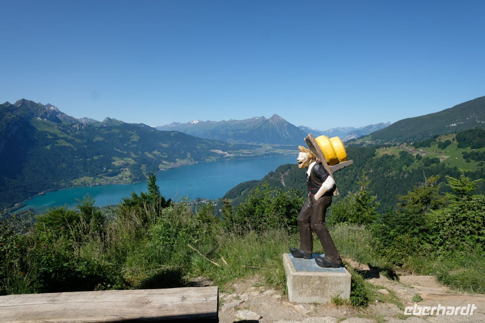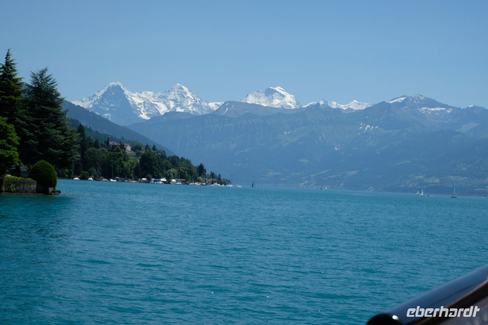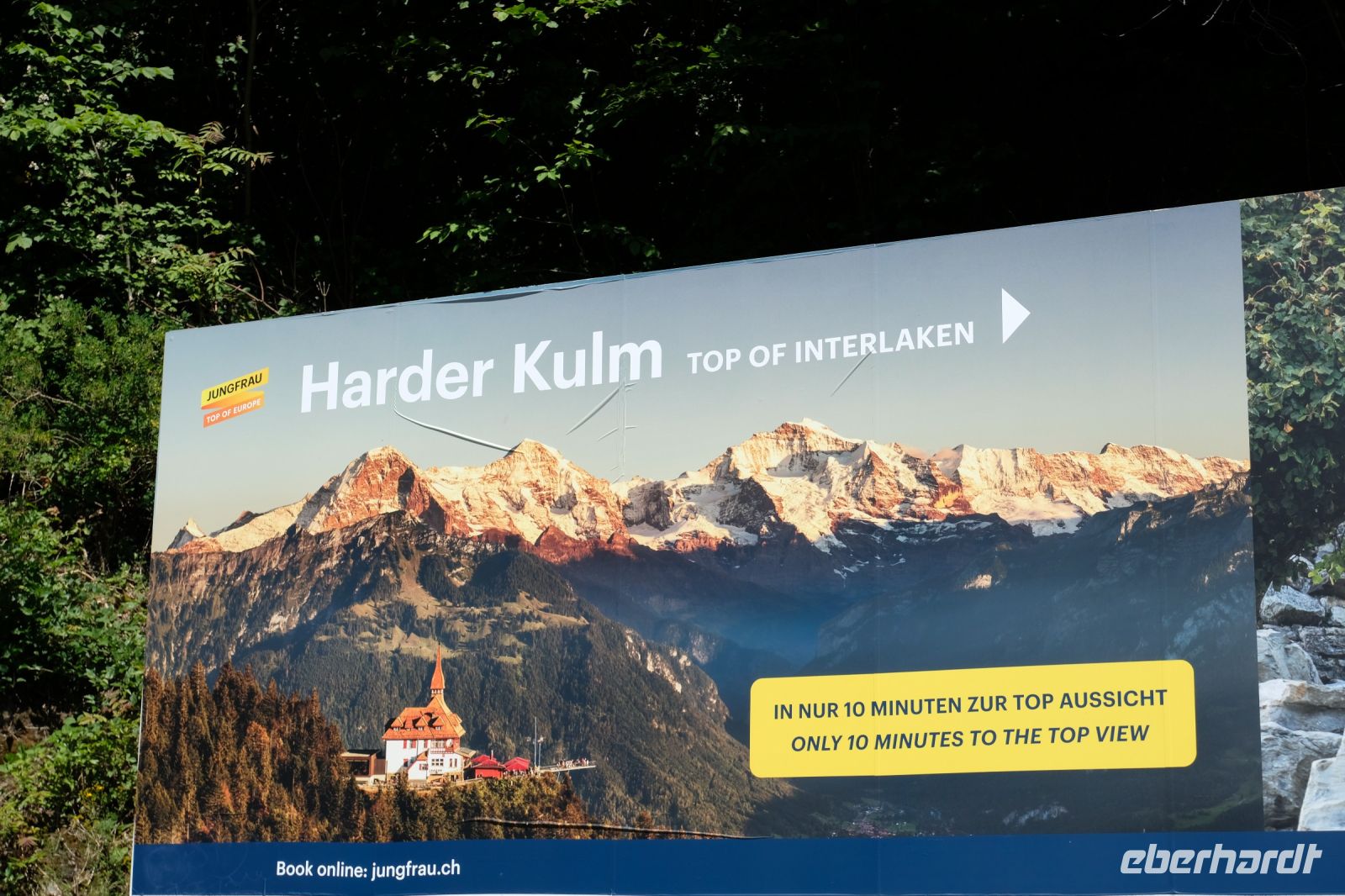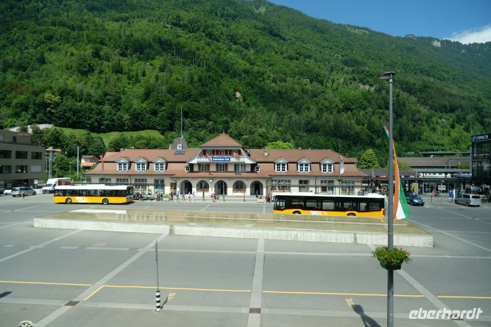 Der heutige Tag stand ganz im Zeichen von Interlaken und dessen schöner Umgebung. Die meisten unserer Gäste unternahmen an diesem herrlichen Sommertag einen Ausflug auf den Harder Kulm, den Hausberg Interlakens. Die Talstation der modernen Standseilbahn war immerhin nur einen kurzen Fußweg von unserem Hotel entfernt und durch die Vorlage unserer Gästekarte konnten wir zu einem ermäßigten Preis in nur etwa 10 Minuten hinauffahren. Hätte Interlaken einen König, dann würde dieser mit großer Sicherheit hier auf dem Kulm residieren, denn von der Aussichtsplattform auf 1.322 m ü. d. M. sähe er gnädig auf Brienzer- und Thunersee hinunter oder würde Eiger, Mönch und Jungfrau betrachten. Das Panorama-Restaurant auf dem Harder Kulm erinnert nämlich tatsächlich an ein Schloss und um dieses zu besuchen, braucht man allerdings kein König zu sein. Es war einfach traumhaft und einmalig schön! Am Nachmittag konnten wir dann das städtische Flair Interlakens erleben und nach Herzenslust durch den Ort bummeln.