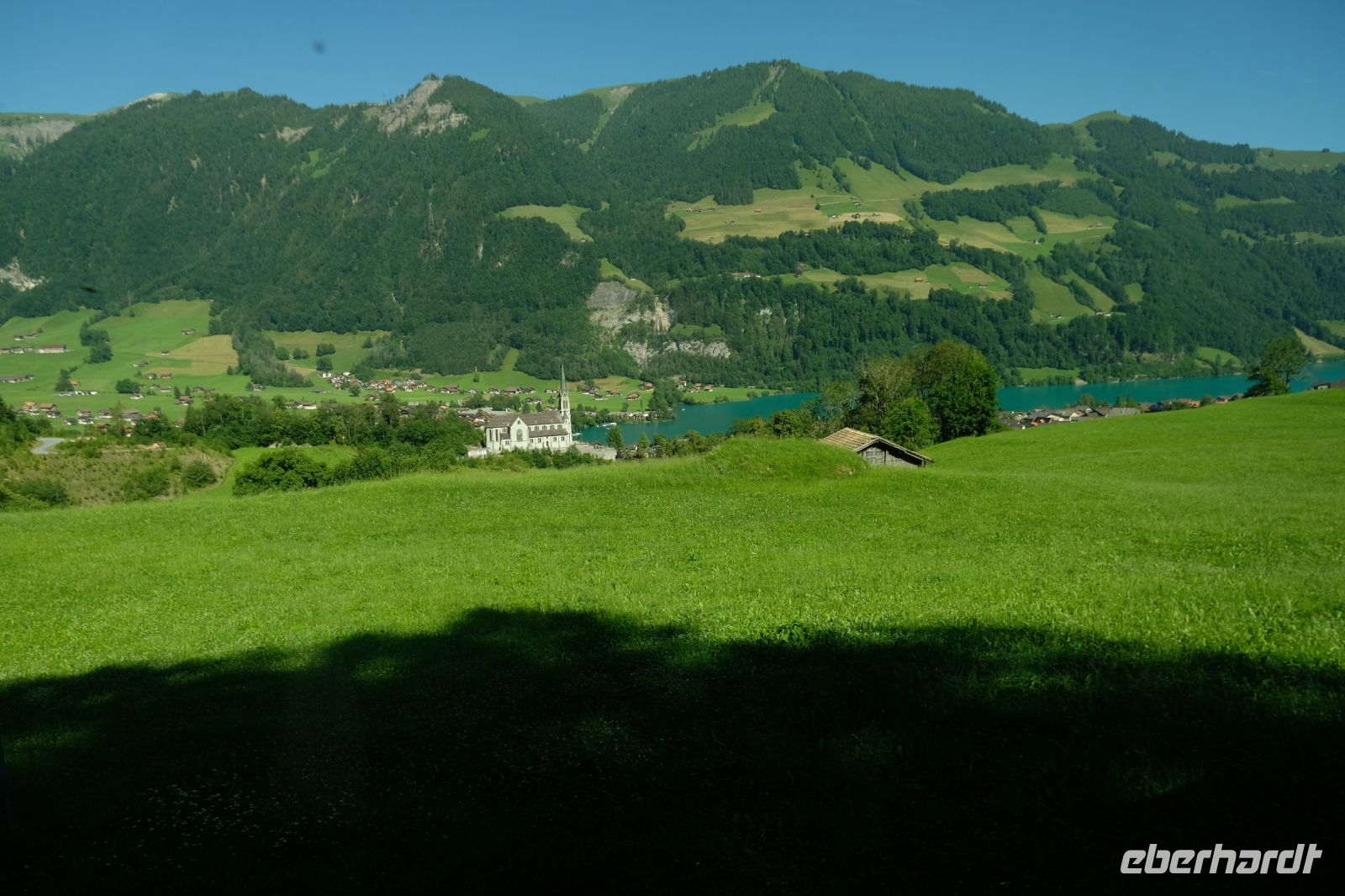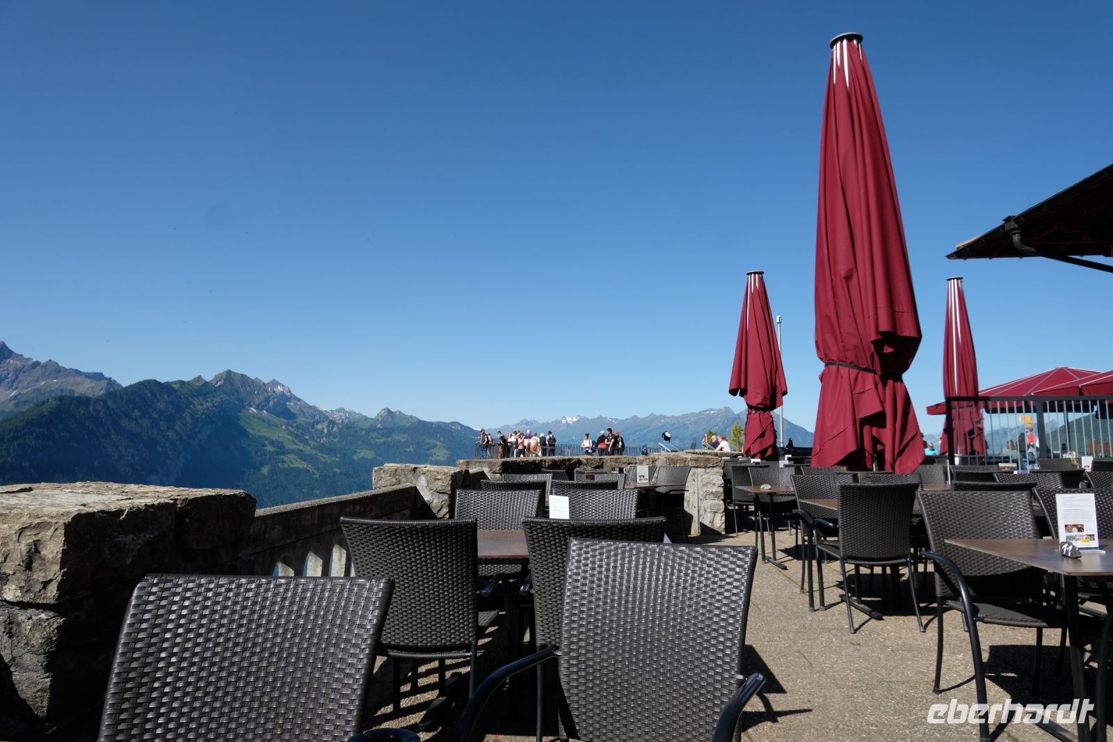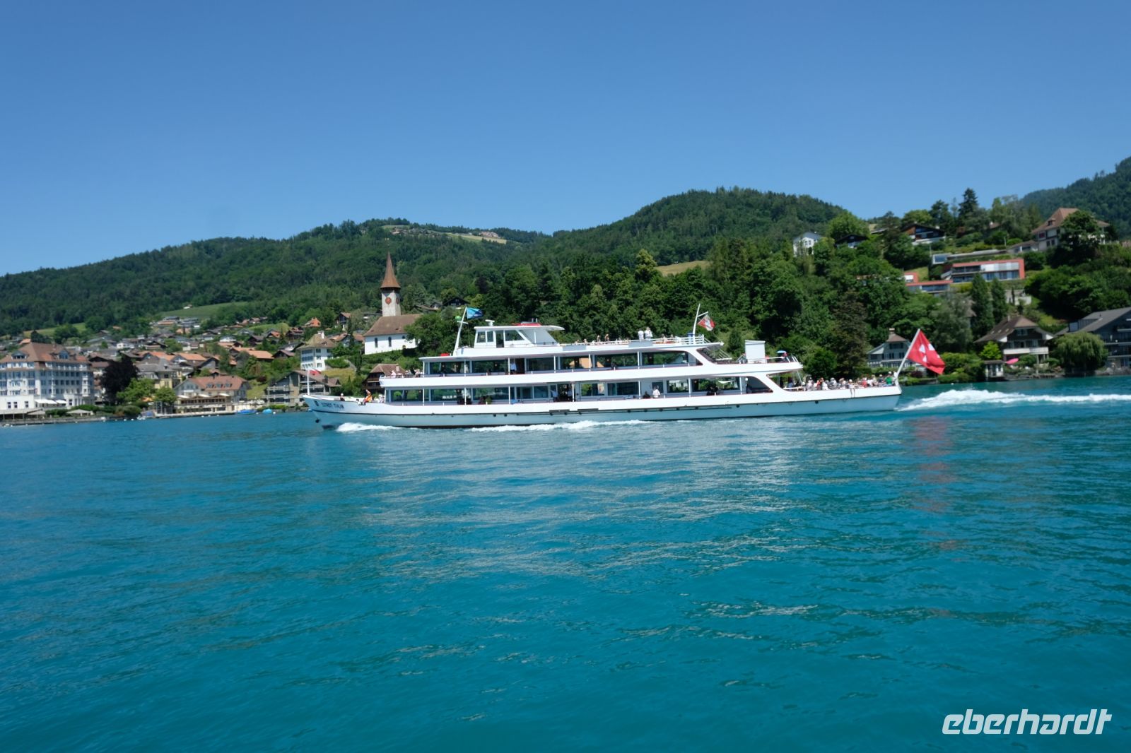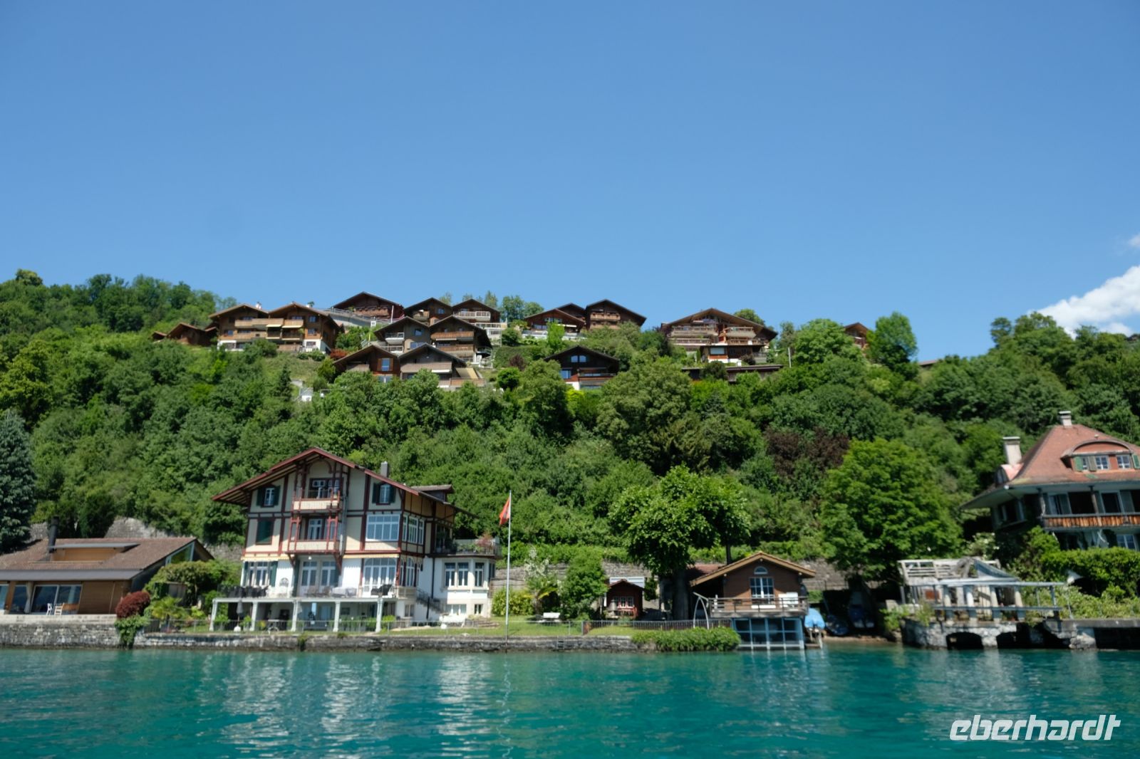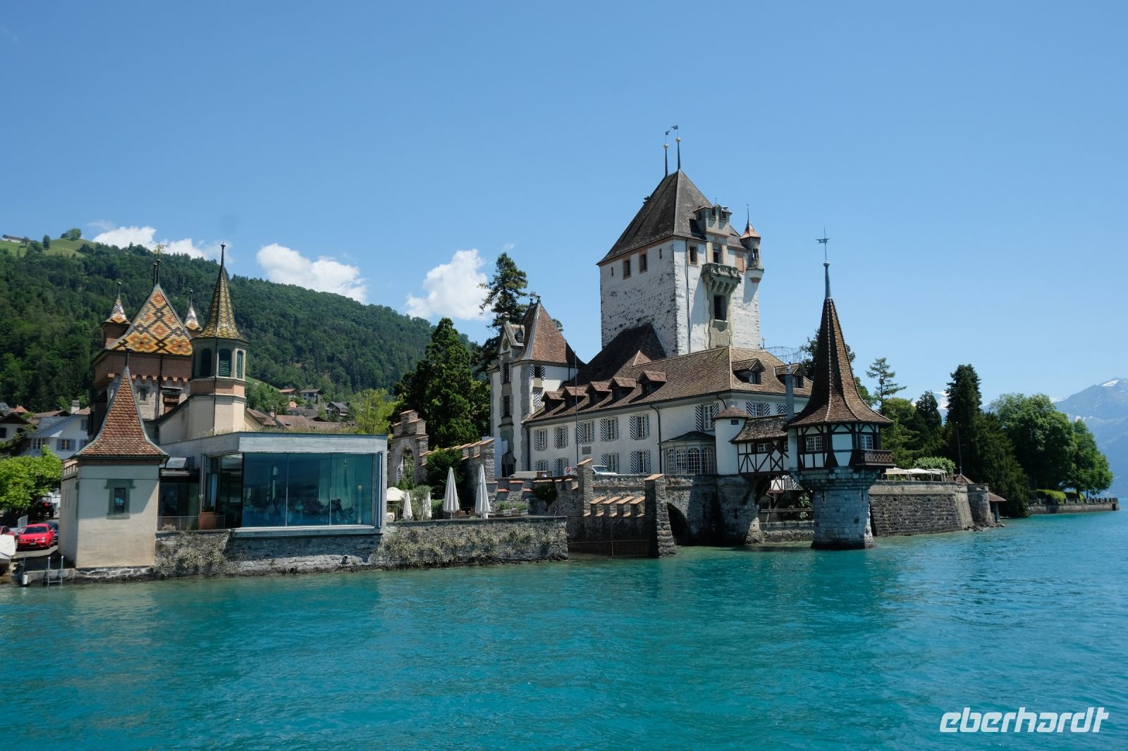 Der heutige Tag stand ganz im Zeichen von Interlaken und dessen schöner Umgebung. Die meisten unserer Gäste unternahmen an diesem herrlichen Sommertag einen Ausflug auf den Harder Kulm, den Hausberg Interlakens. Die Talstation der modernen Standseilbahn war immerhin nur einen kurzen Fußweg von unserem Hotel entfernt und durch die Vorlage unserer Gästekarte konnten wir zu einem ermäßigten Preis in nur etwa 10 Minuten hinauffahren. Hätte Interlaken einen König, dann würde dieser mit großer Sicherheit hier auf dem Kulm residieren, denn von der Aussichtsplattform auf 1.322 m ü. d. M. sähe er gnädig auf Brienzer- und Thunersee hinunter oder würde Eiger, Mönch und Jungfrau betrachten. Das Panorama-Restaurant auf dem Harder Kulm erinnert nämlich tatsächlich an ein Schloss und um dieses zu besuchen, braucht man allerdings kein König zu sein. Es war einfach traumhaft und einmalig schön! Am Nachmittag konnten wir dann das städtische Flair Interlakens erleben und nach Herzenslust durch den Ort bummeln.