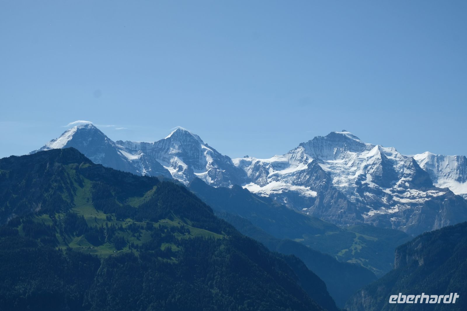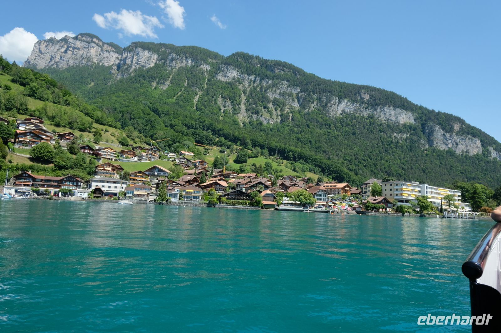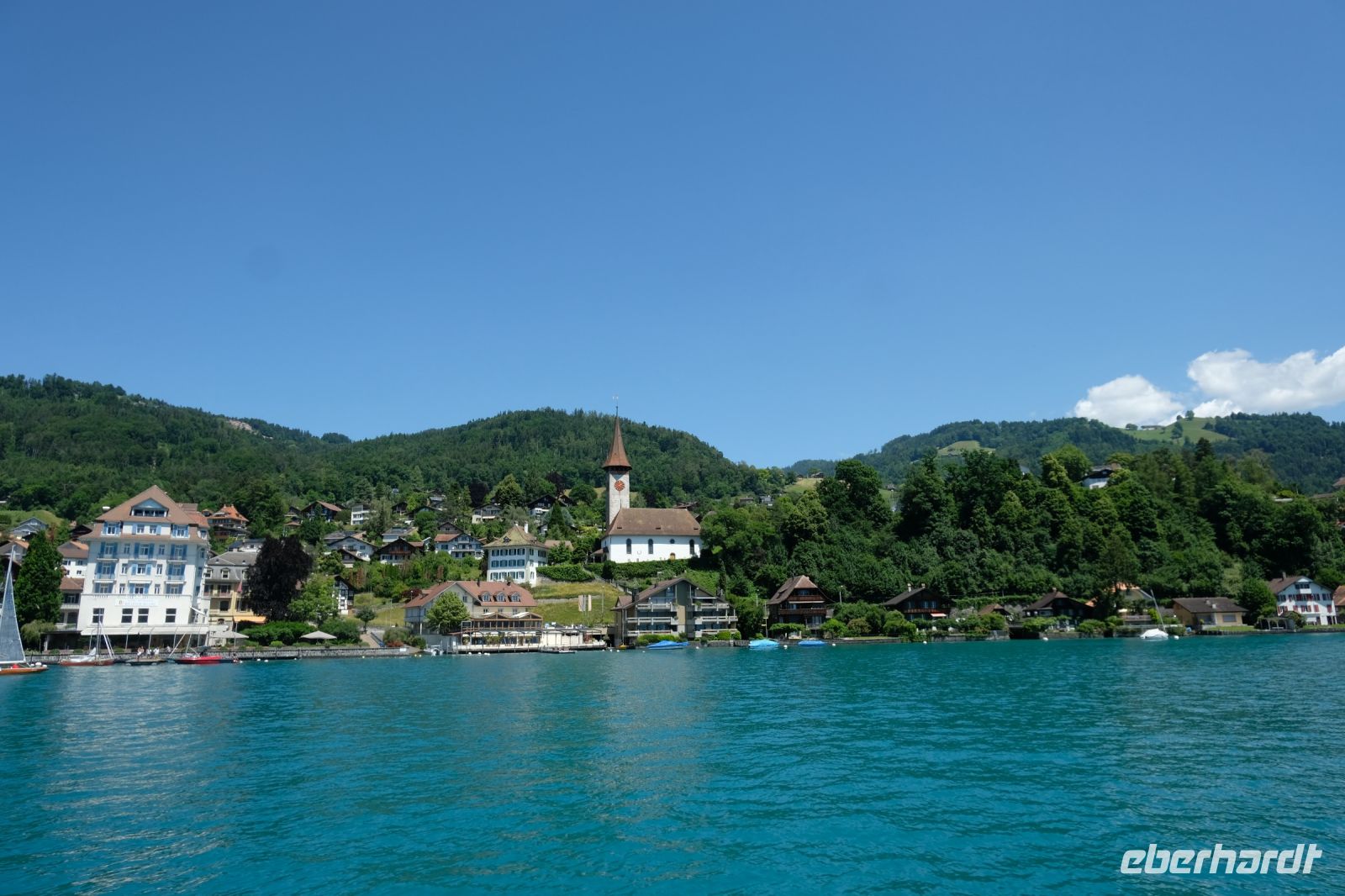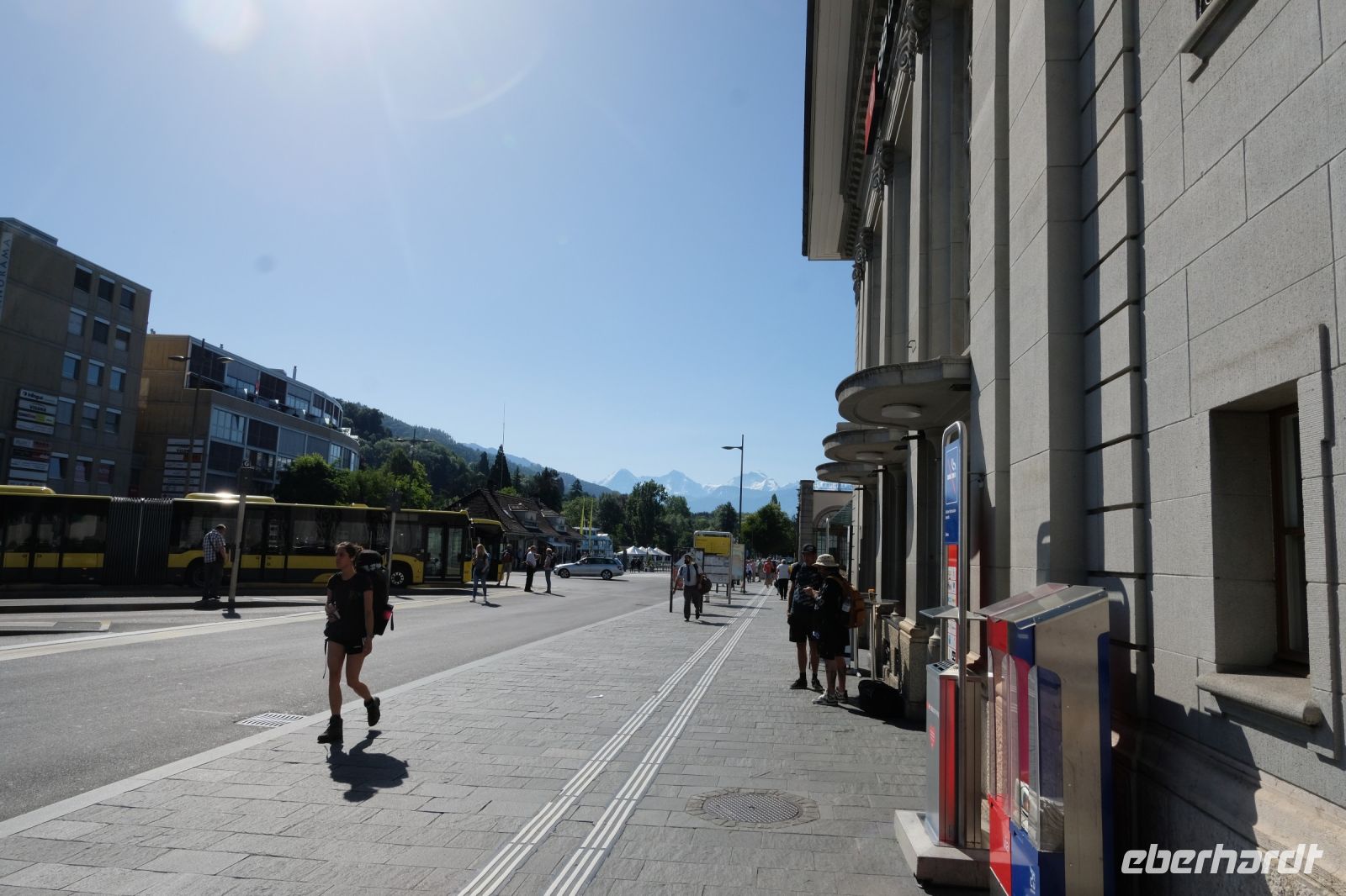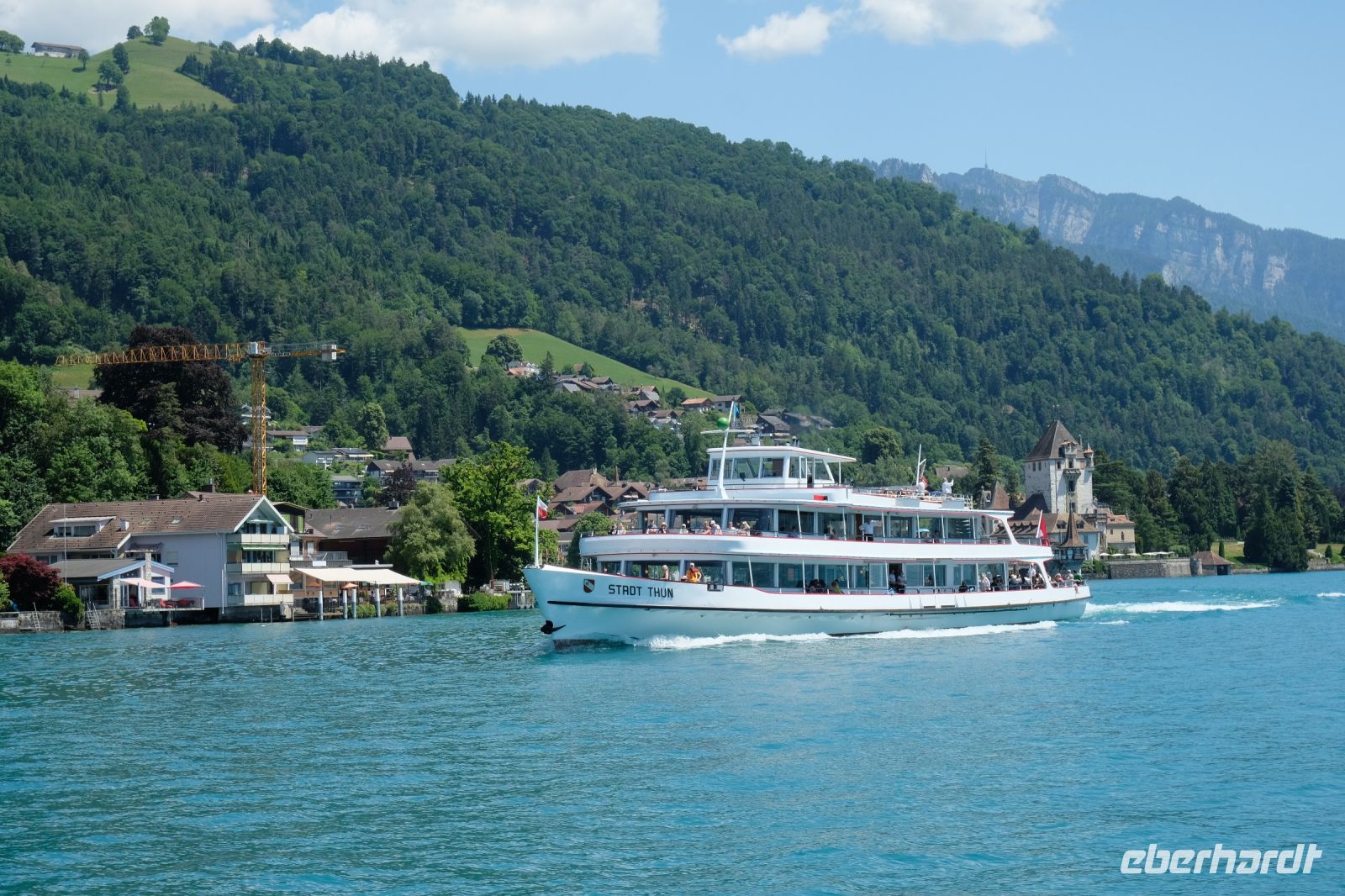 Der heutige Tag stand ganz im Zeichen von Interlaken und dessen schöner Umgebung. Die meisten unserer Gäste unternahmen an diesem herrlichen Sommertag einen Ausflug auf den Harder Kulm, den Hausberg Interlakens. Die Talstation der modernen Standseilbahn war immerhin nur einen kurzen Fußweg von unserem Hotel entfernt und durch die Vorlage unserer Gästekarte konnten wir zu einem ermäßigten Preis in nur etwa 10 Minuten hinauffahren. Hätte Interlaken einen König, dann würde dieser mit großer Sicherheit hier auf dem Kulm residieren, denn von der Aussichtsplattform auf 1.322 m ü. d. M. sähe er gnädig auf Brienzer- und Thunersee hinunter oder würde Eiger, Mönch und Jungfrau betrachten. Das Panorama-Restaurant auf dem Harder Kulm erinnert nämlich tatsächlich an ein Schloss und um dieses zu besuchen, braucht man allerdings kein König zu sein. Es war einfach traumhaft und einmalig schön! Am Nachmittag konnten wir dann das städtische Flair Interlakens erleben und nach Herzenslust durch den Ort bummeln.