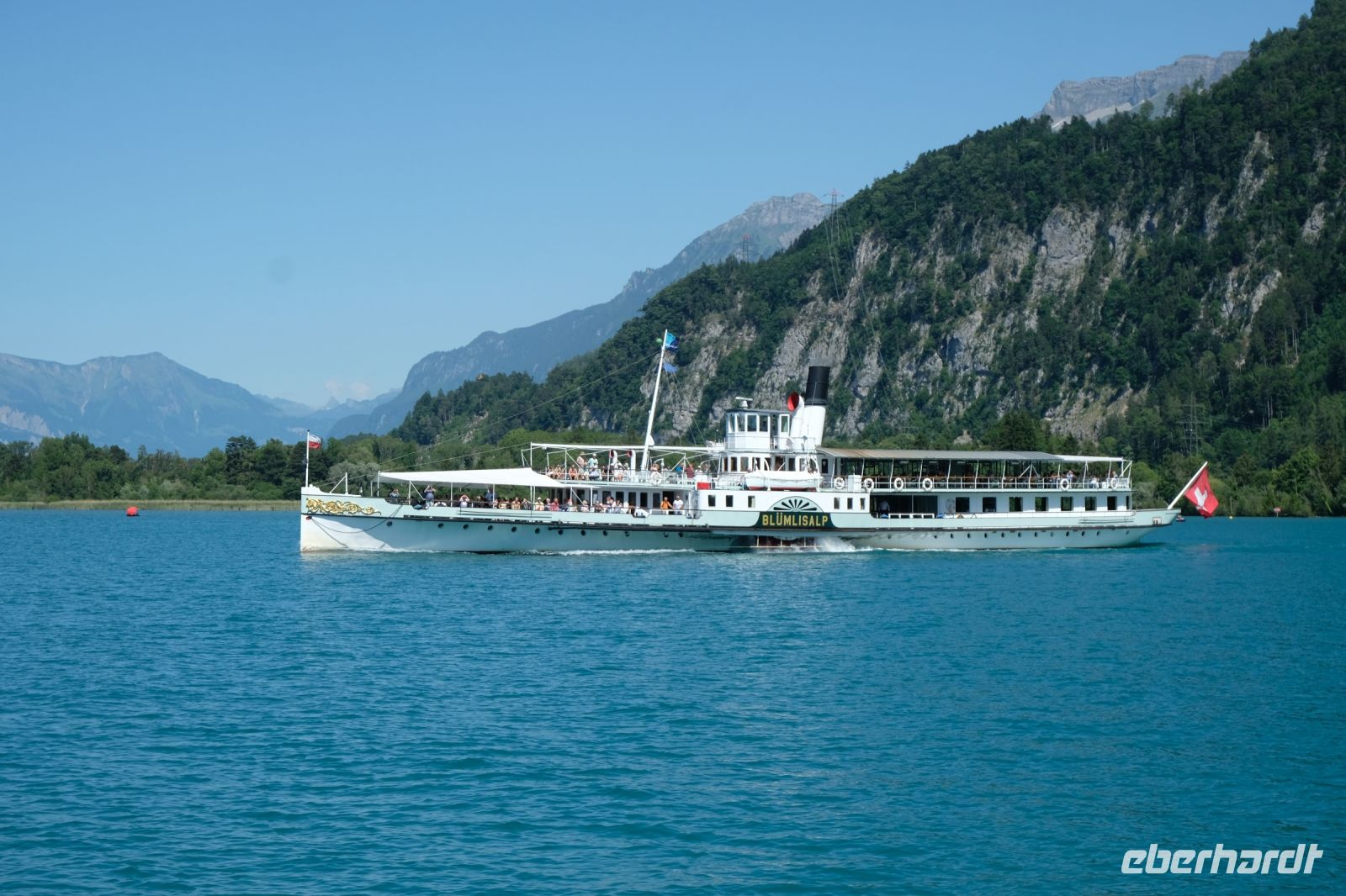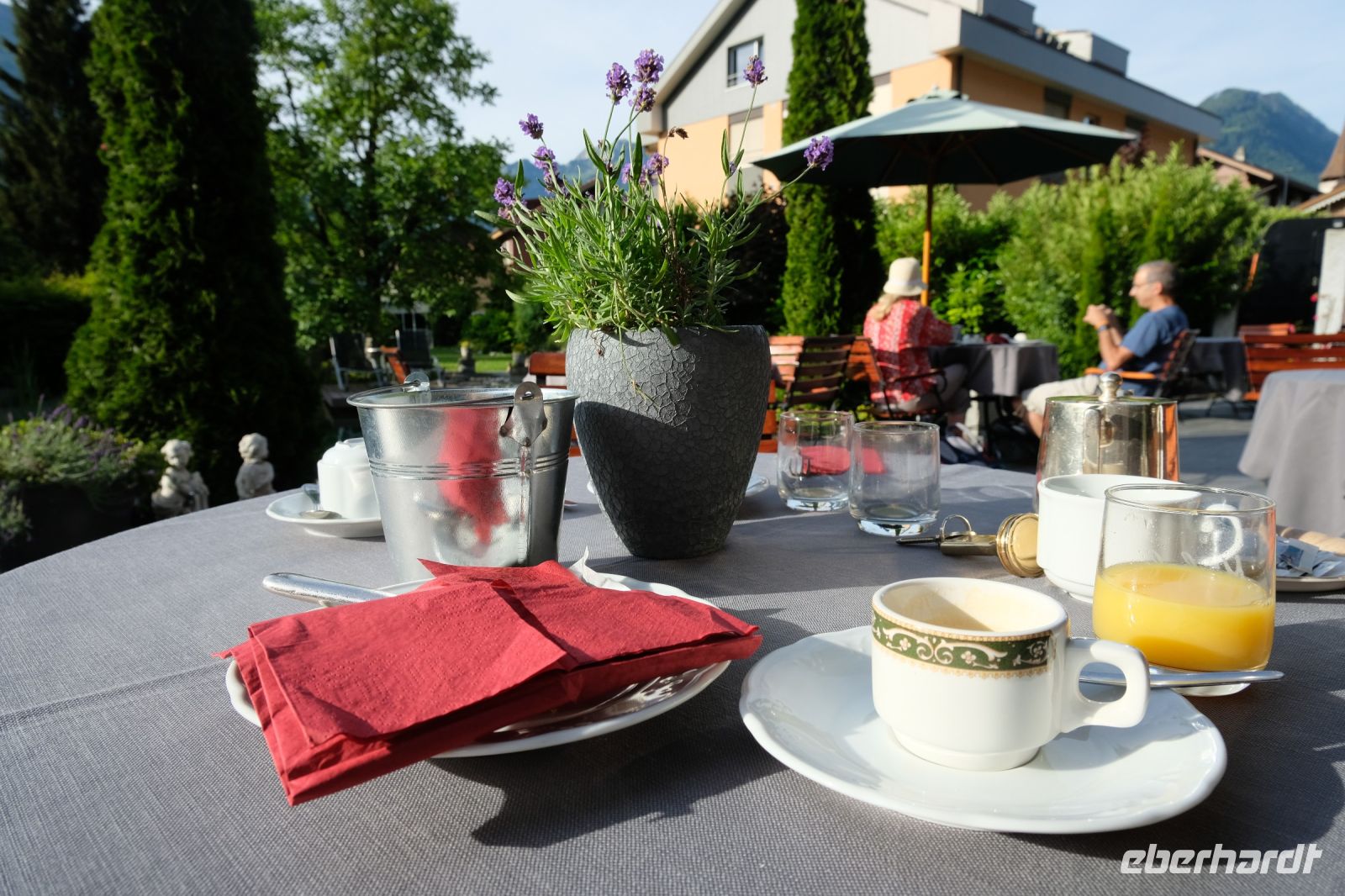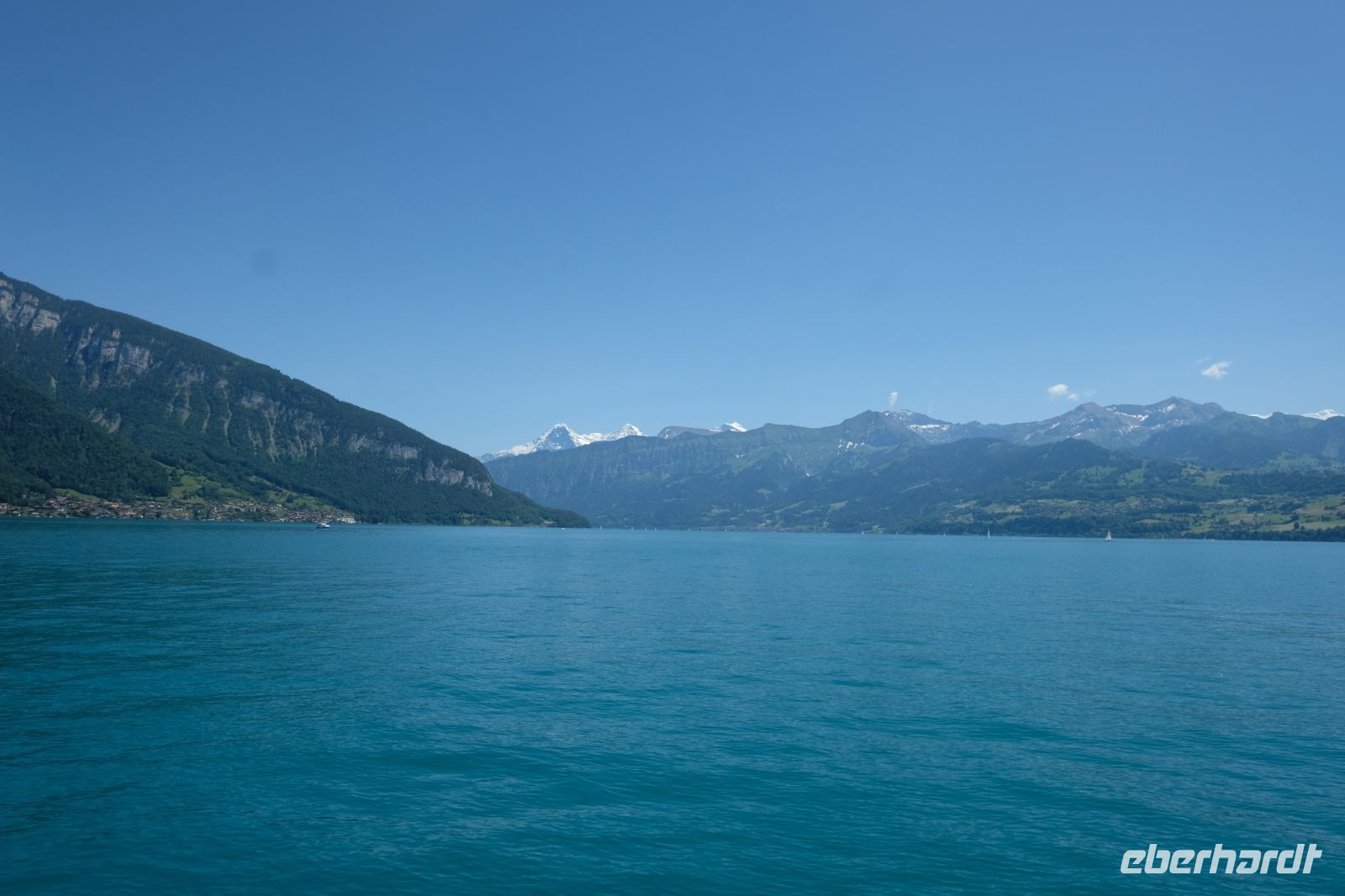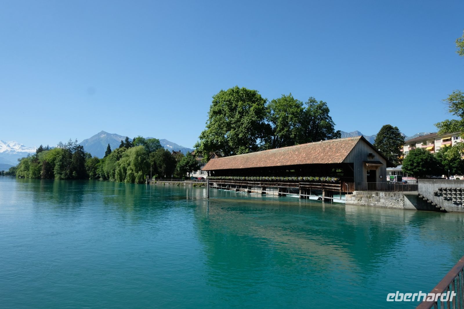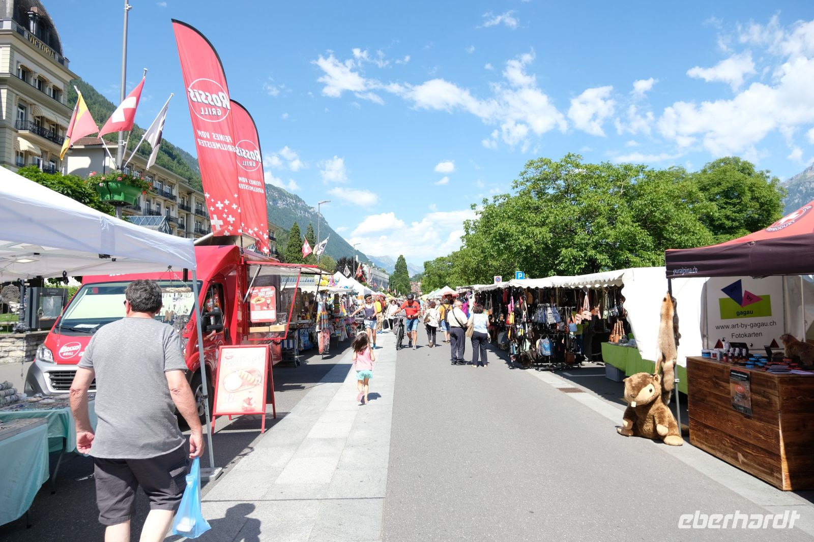 Der heutige Tag stand ganz im Zeichen von Interlaken und dessen schöner Umgebung. Die meisten unserer Gäste unternahmen an diesem herrlichen Sommertag einen Ausflug auf den Harder Kulm, den Hausberg Interlakens. Die Talstation der modernen Standseilbahn war immerhin nur einen kurzen Fußweg von unserem Hotel entfernt und durch die Vorlage unserer Gästekarte konnten wir zu einem ermäßigten Preis in nur etwa 10 Minuten hinauffahren. Hätte Interlaken einen König, dann würde dieser mit großer Sicherheit hier auf dem Kulm residieren, denn von der Aussichtsplattform auf 1.322 m ü. d. M. sähe er gnädig auf Brienzer- und Thunersee hinunter oder würde Eiger, Mönch und Jungfrau betrachten. Das Panorama-Restaurant auf dem Harder Kulm erinnert nämlich tatsächlich an ein Schloss und um dieses zu besuchen, braucht man allerdings kein König zu sein. Es war einfach traumhaft und einmalig schön! Am Nachmittag konnten wir dann das städtische Flair Interlakens erleben und nach Herzenslust durch den Ort bummeln.