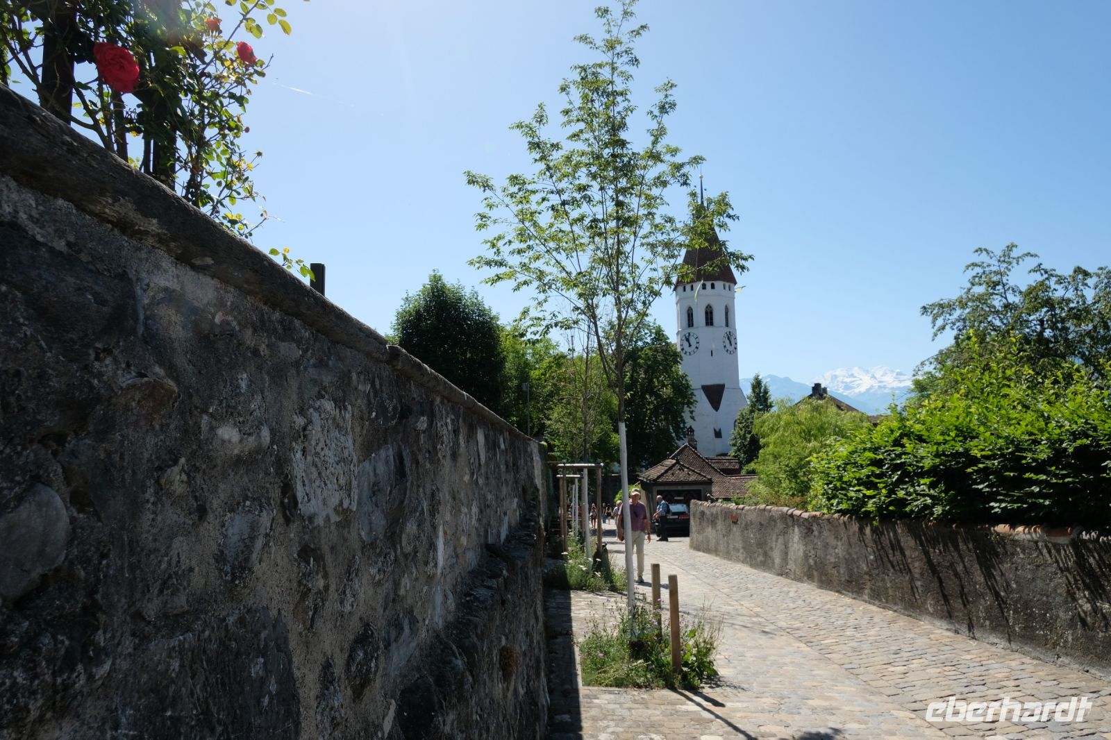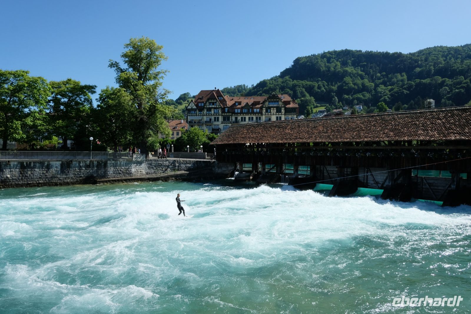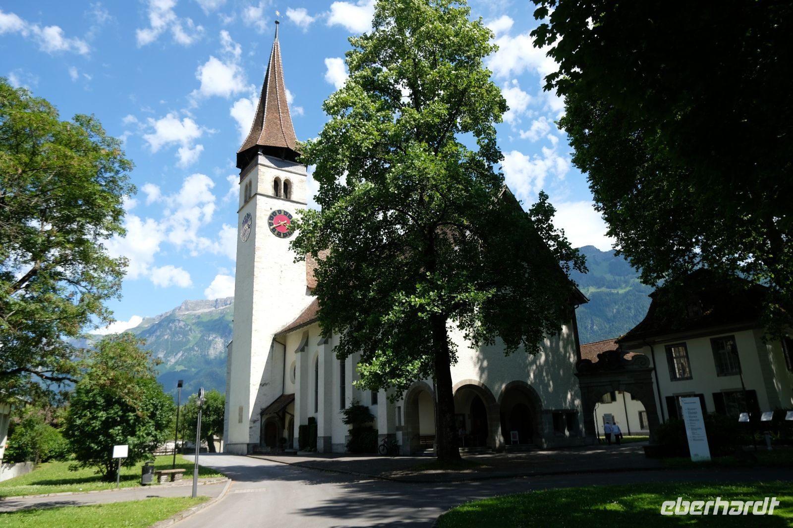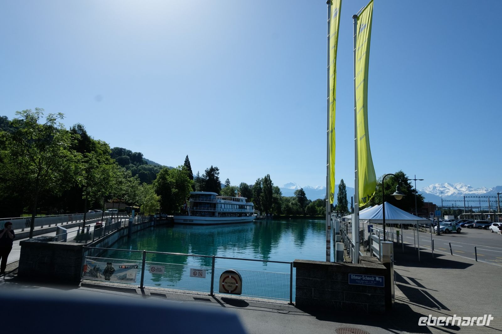 Der heutige Tag stand ganz im Zeichen von Interlaken und dessen schöner Umgebung. Die meisten unserer Gäste unternahmen an diesem herrlichen Sommertag einen Ausflug auf den Harder Kulm, den Hausberg Interlakens. Die Talstation der modernen Standseilbahn war immerhin nur einen kurzen Fußweg von unserem Hotel entfernt und durch die Vorlage unserer Gästekarte konnten wir zu einem ermäßigten Preis in nur etwa 10 Minuten hinauffahren. Hätte Interlaken einen König, dann würde dieser mit großer Sicherheit hier auf dem Kulm residieren, denn von der Aussichtsplattform auf 1.322 m ü. d. M. sähe er gnädig auf Brienzer- und Thunersee hinunter oder würde Eiger, Mönch und Jungfrau betrachten. Das Panorama-Restaurant auf dem Harder Kulm erinnert nämlich tatsächlich an ein Schloss und um dieses zu besuchen, braucht man allerdings kein König zu sein. Es war einfach traumhaft und einmalig schön! Am Nachmittag konnten wir dann das städtische Flair Interlakens erleben und nach Herzenslust durch den Ort bummeln.