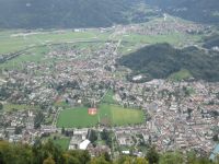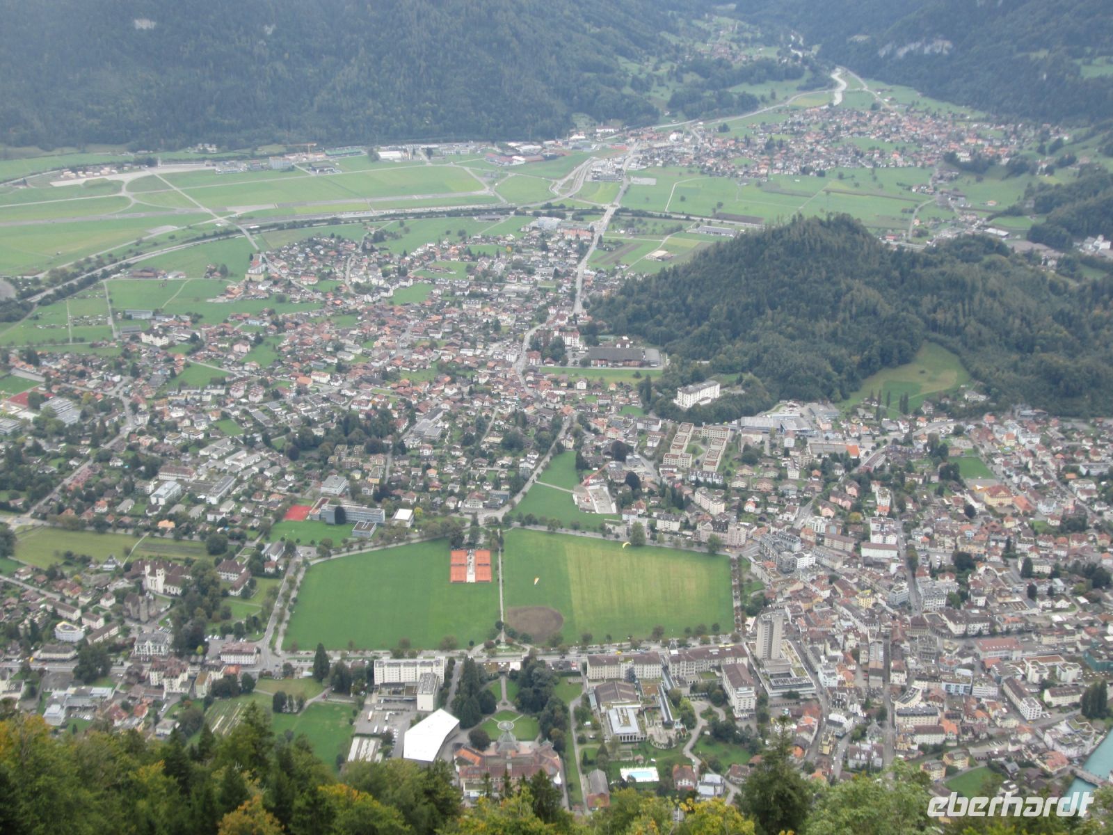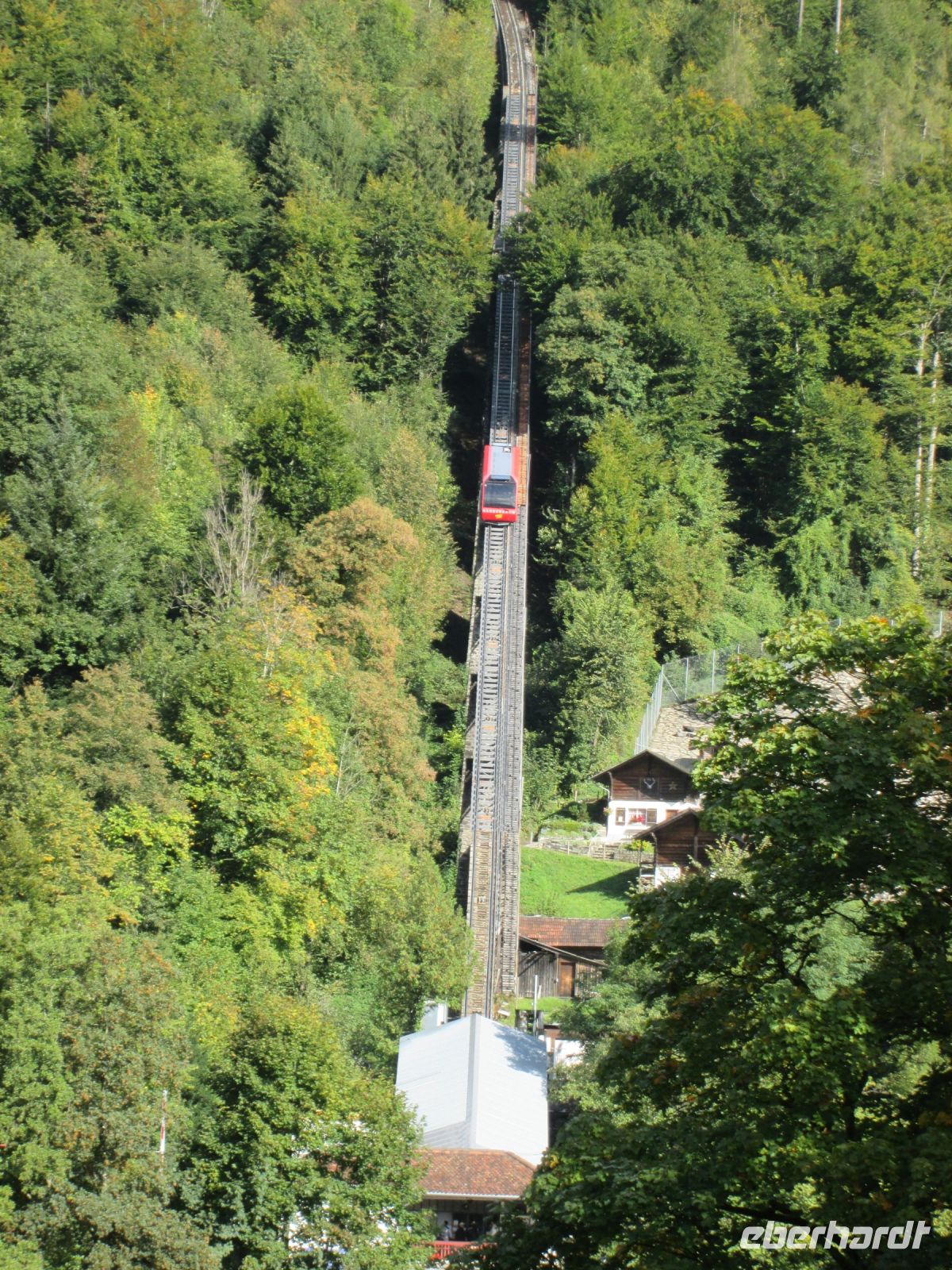 Das Wetter besserte sich, ab dem späten Vormittag konnte man sogar mit Sonne rechnen. So spazierte gegen Mittag die gesamte Gruppe zur Talstation der Harder Kulm Bahn. 1908 in Betrieb genommen, überwindet sie einen Höhenunterschied von 755 m. Gleich nach dem Start konnte man vom Wagen aus im "Wildpark Interlaken" Steinböcke sehen.