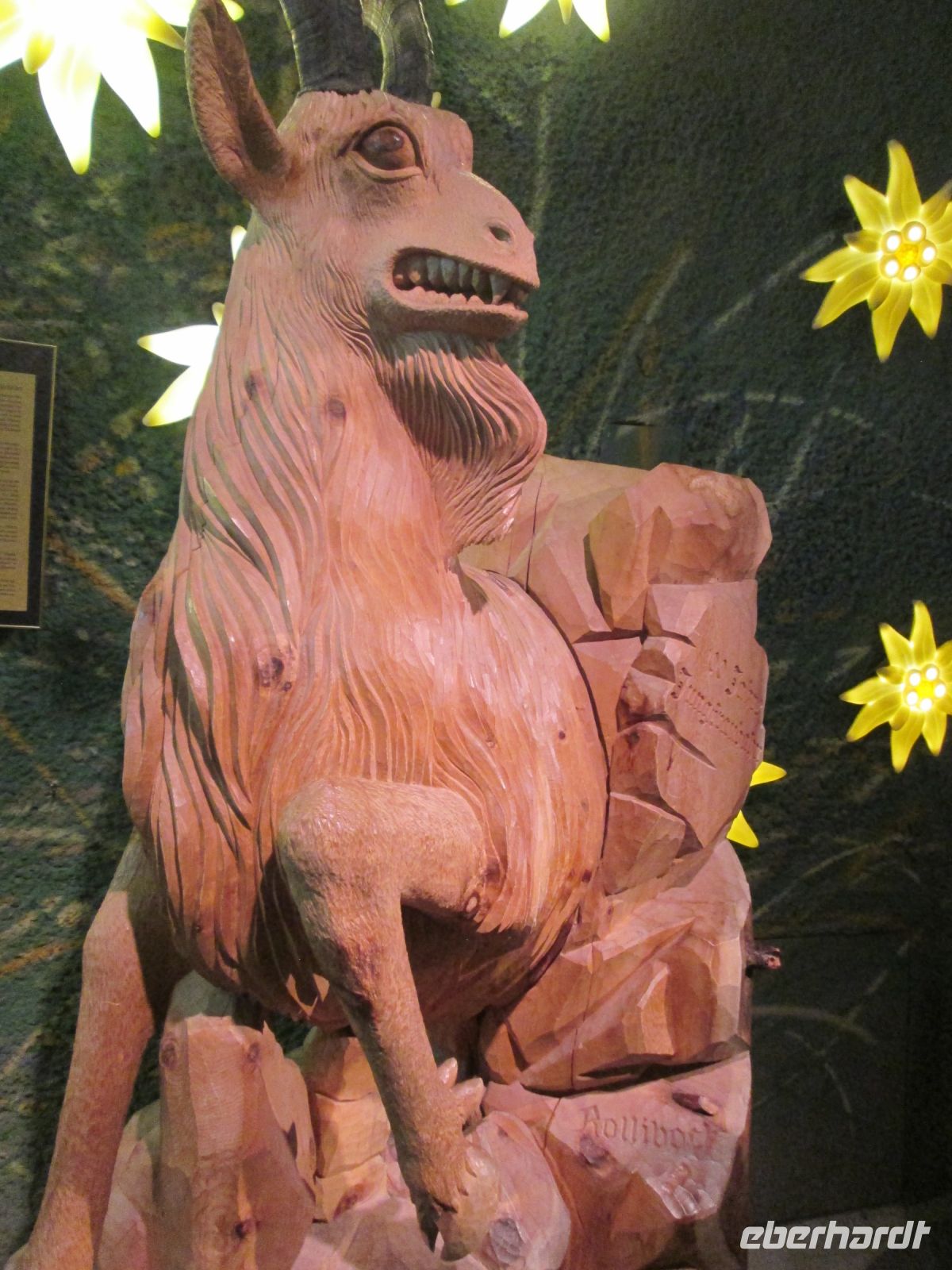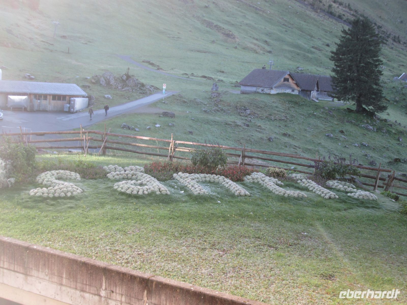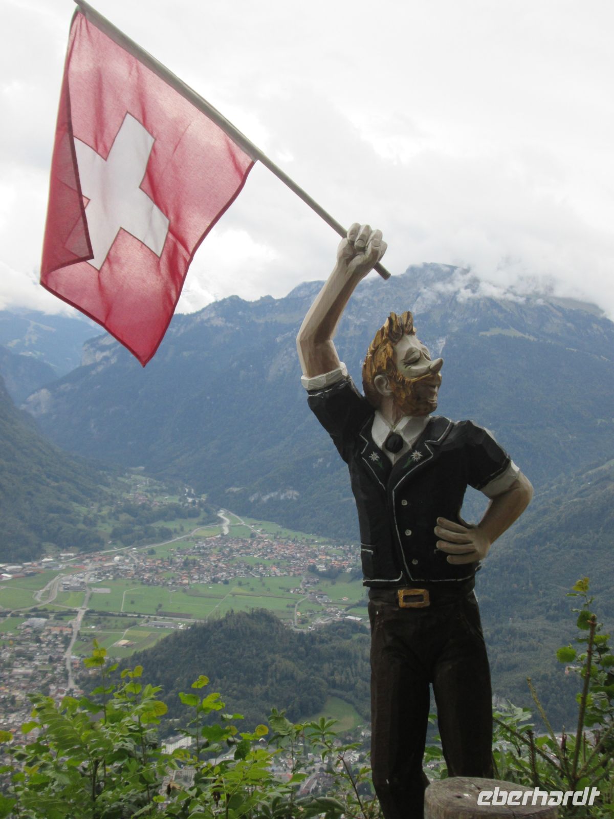 Auf 1322 m Höhe angekommen, begrüßten uns zunächst lustig dreinschauende Holzschnitzfiguren mit der Schweizer Flagge und dem Alphorn.