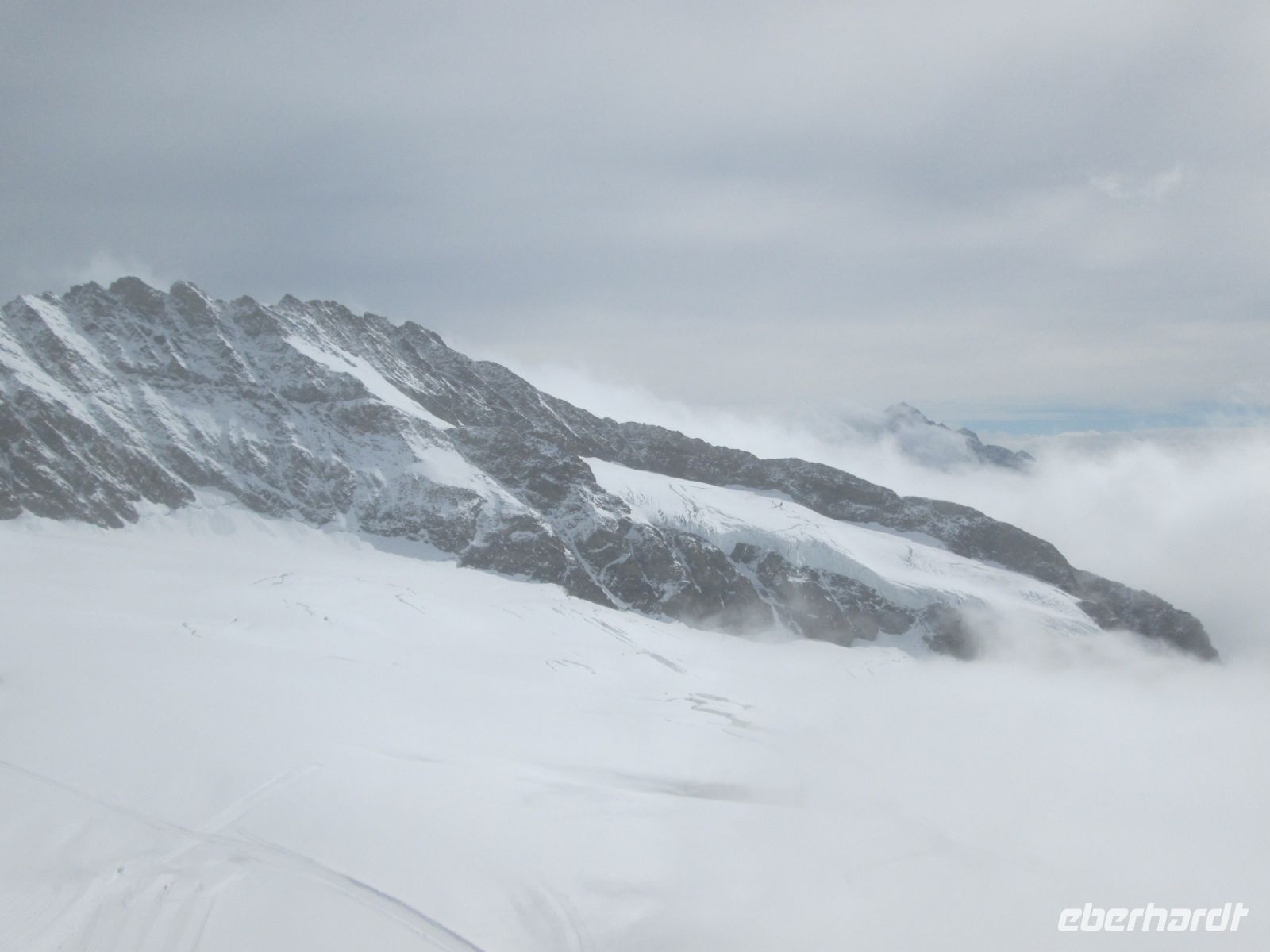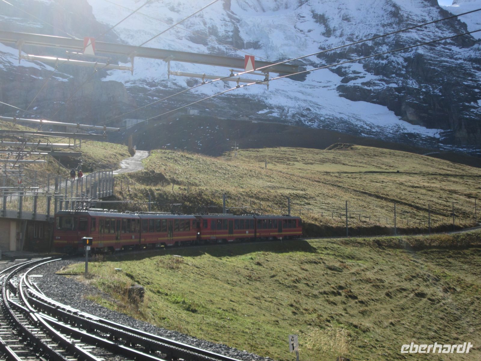 Pünktlich erfolgte die erste Bahnfahrt Interlaken Ost-Lauterbrunnen. Ein schneller Umstieg, und mit der Wengernalpbahn ging es weiter auf die Kleine Scheidegg. Mittlerweile befanden wir uns auf 2061 m und hatten einen grandiosen Blick auf Eiger, Mönch und Jungfrau. Auch die berühmt-berüchtigte Eigernordwand war klar zu erkennen. Den Abschluss des Bahnfahrens am Vormittag bildete die Jungfraubahn, die auf Initiative von Adolf Guyer Zeller in insgesamt 16 Jahren erbaut wurde. Ihm war es leider nicht gegönnt, die Jungfernfahrt mit zu erleben. Guyer Zeller starb 1899, der erste Zug fuhr Mitte 1912 die gesamte Strecke von 9,3 km.
