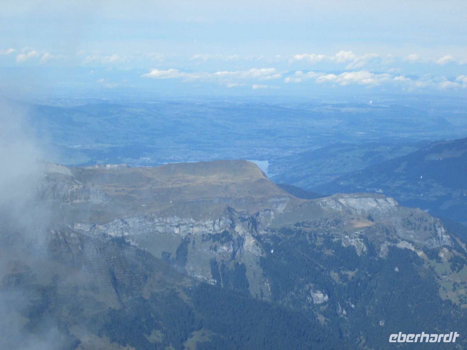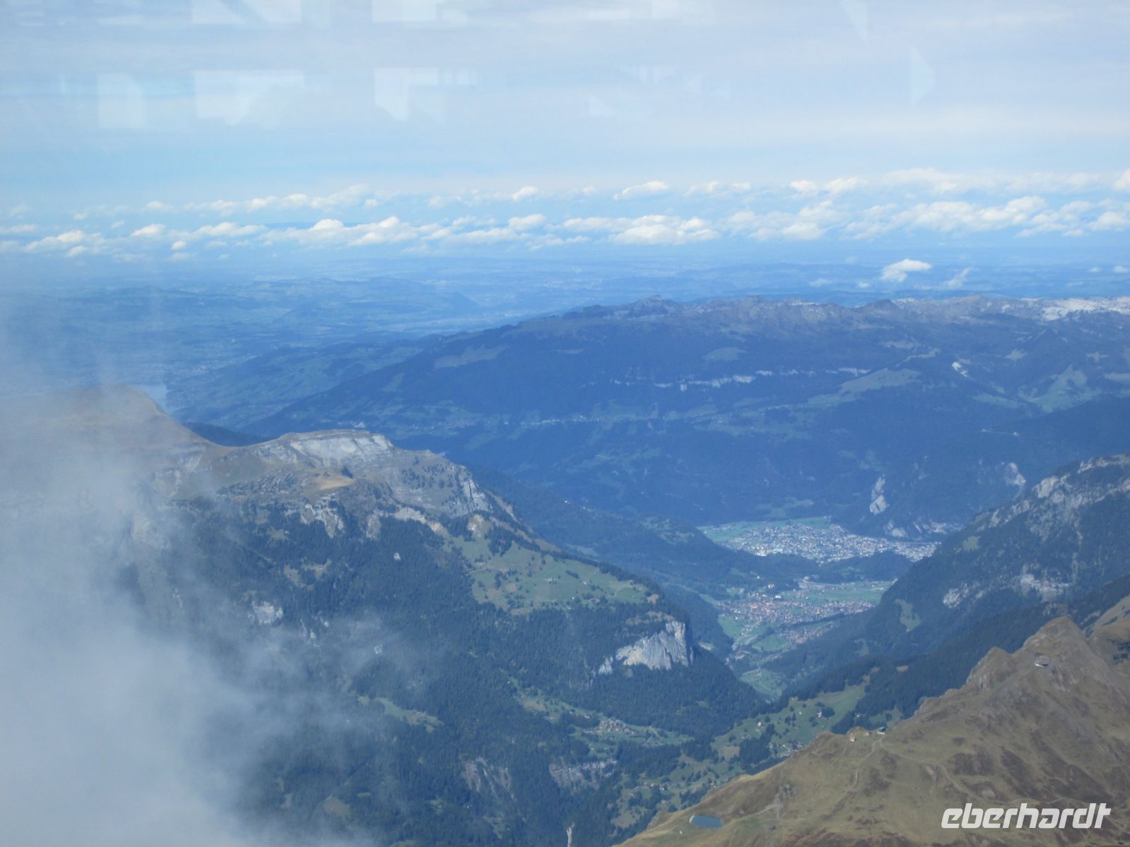 Thuner und Brienzer See, dazwischen Interlaken und die Aare lagen uns zu Füßen. Und es dauerte nicht lange, die Wolken zogen auf und der Blick wurde frei auf das Dreigestirn Eiger, Mönch und Jungfrau. Selbst die Jungfrau Station, die wir am kommenden Tag besuchen wollten, war sichtbar.