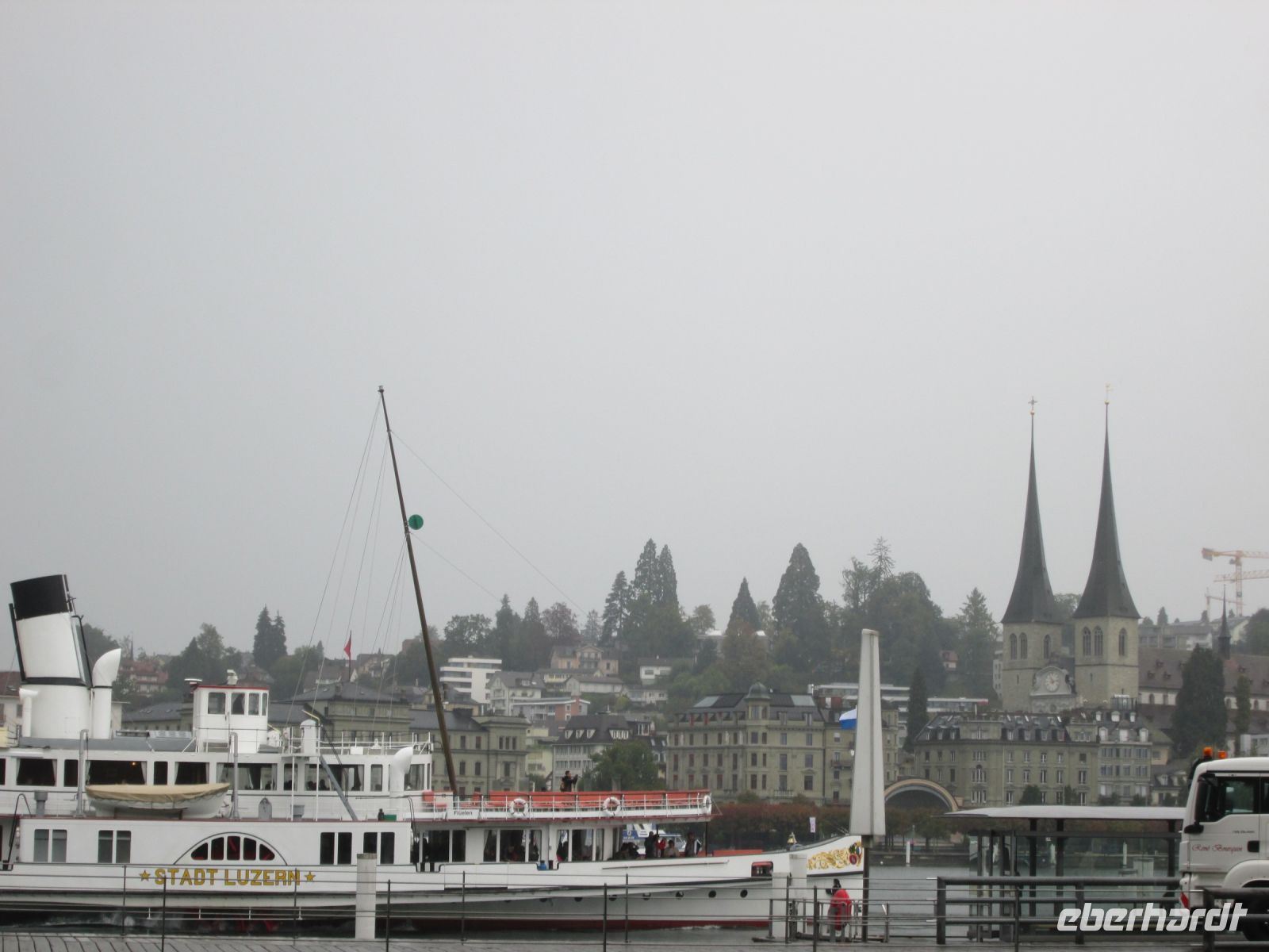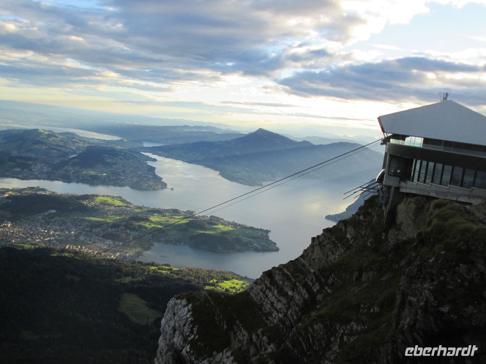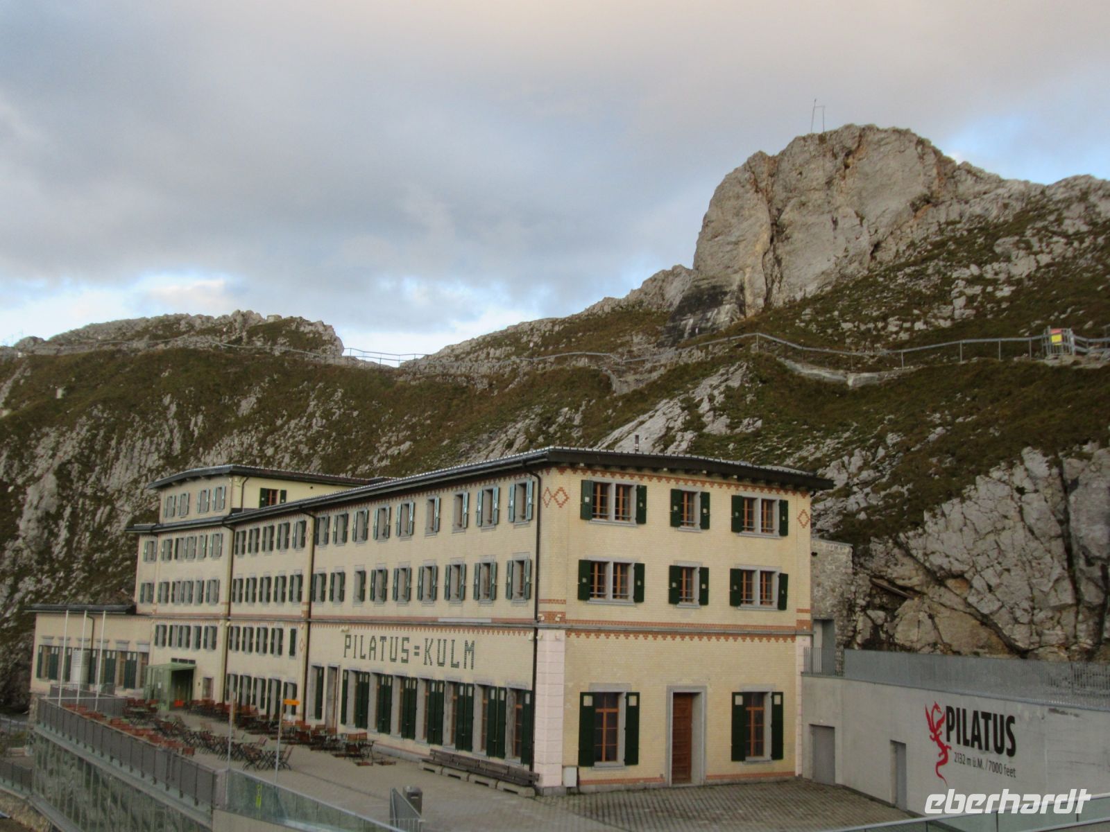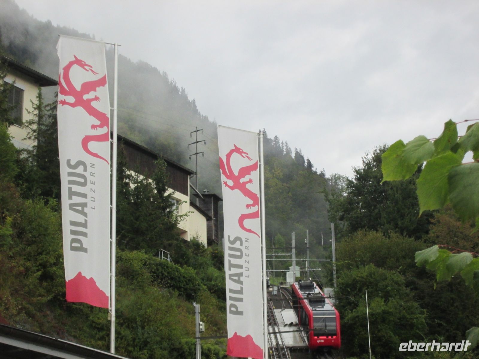 Viel hat man schon über ihn gehört, auch im TV gab es Dokumentationen, und jetzt war es endlich soweit. Die steilste Zahnradbahn der Welt brachte uns von Alpnachstad auf Pilatus Kulm. Sollte sich das Wetter bessern ? Naja, auf der Fahrt hatten wir immer mal wieder den Blick auf den Vierwaldstättersee, aber auf 2100 m Höhe war es dann damit vorbei. Nichts war zu sehen, Regen und Sturm wurden sogar immer stärker.