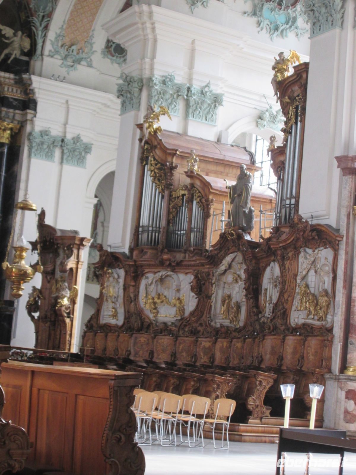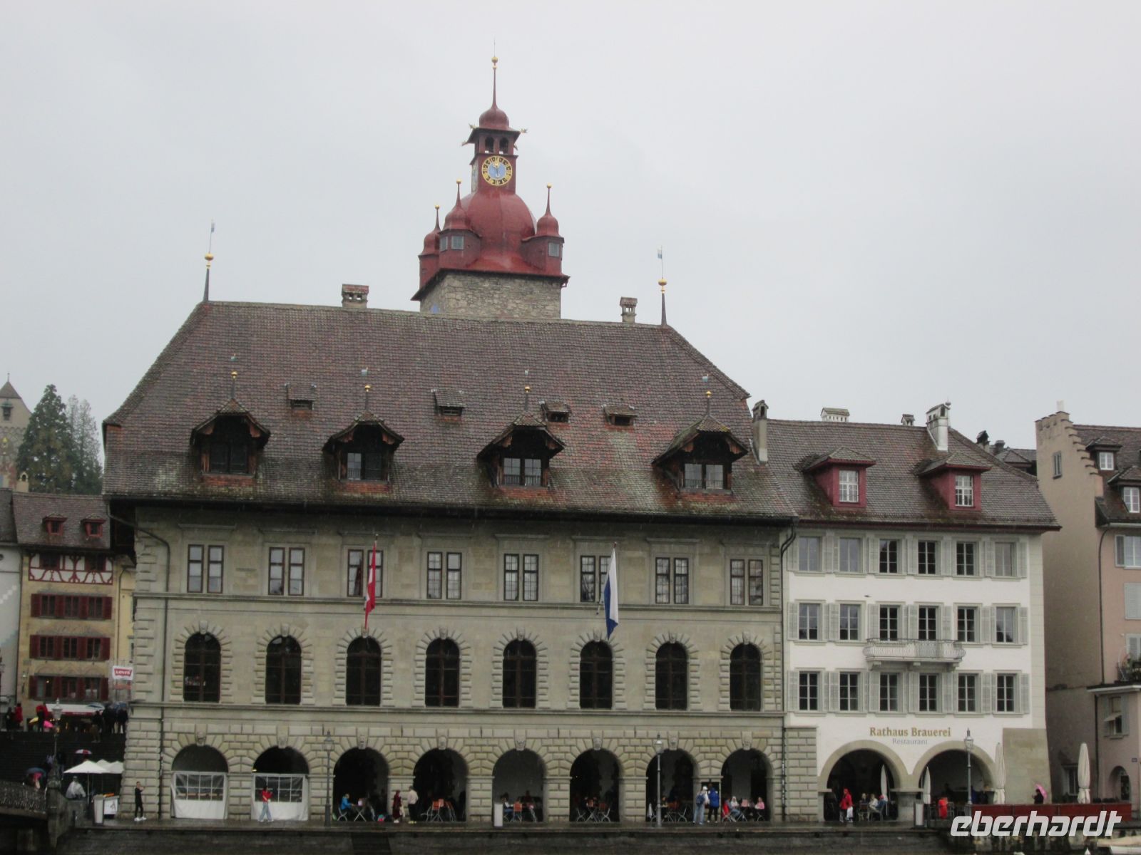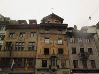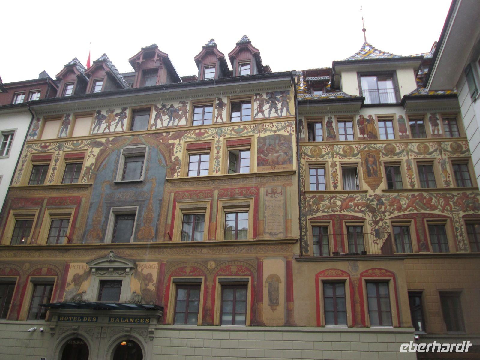 Ursula war sehr bemüht, uns im Trockenen die Informationen weiterzugeben. So standen wir unter Arkaden, sogar im Regierungsgebäude des Kantons Luzern, dem Ritterschen Palais und in der Jesuitenkirche des Heiligen Franz Xaver. Mit ihrer großen Doppelturmfassade ziert sie das linke Ufer der Reuss. Das lichterfüllte Innere begrüßt jeden Besucher mit fein abgestimmten und nicht überladenen Barockelementen. Informationen gab es zum Hochaltar aus Stuckmarmor, den vielen Seitenkapellen, die meist privat finanziert wurden und der Orgel auf der Eingangsempore.
