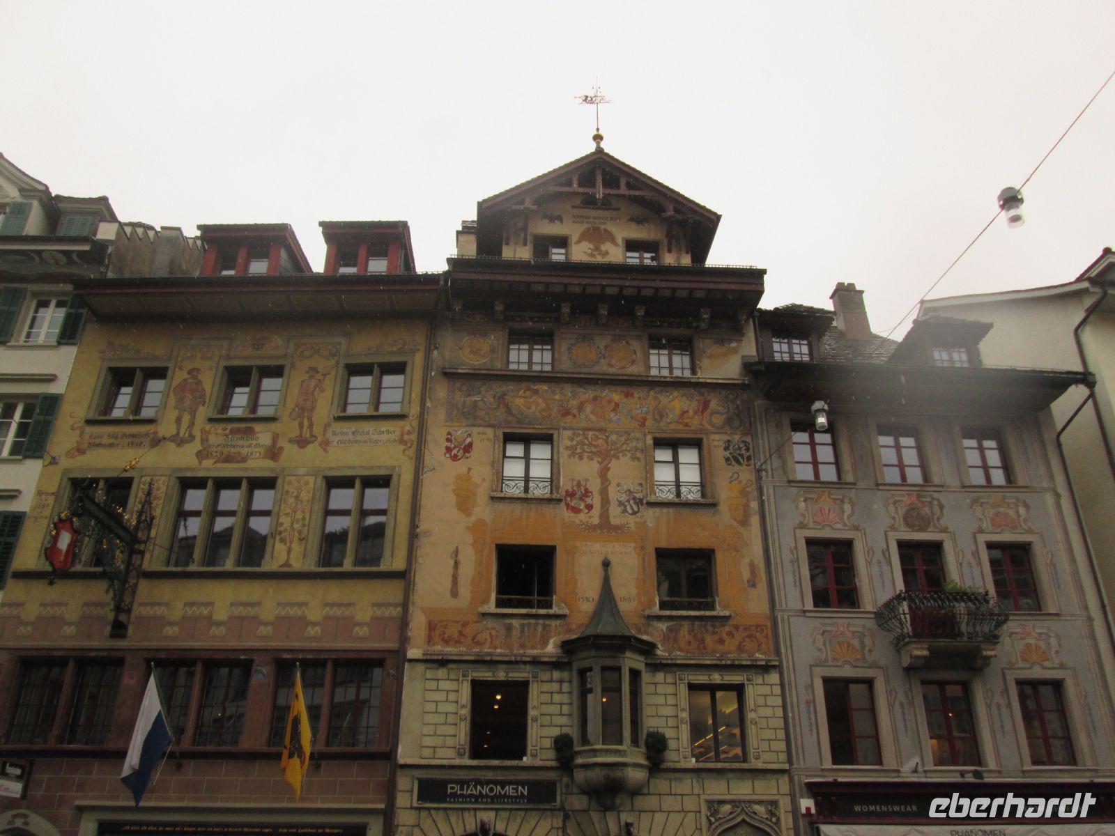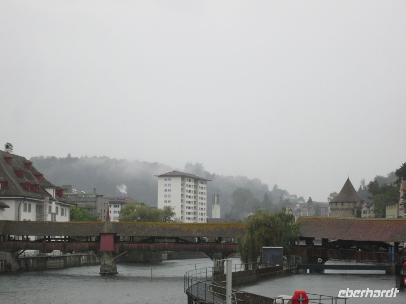 Dort begrüßte uns die Stadtführerin Ursula direkt am Gleis, weil sich Petrus nicht von seiner besten Seite zeigte. So gab es die ersten allgemeinen Informationen zu Luzern im trockenen Bahnhofsgebäude. Aber wir wollten natürlich die Stadt kennenlernen, und so hieß es Regenschirme auf und Kapuzen hoch.