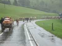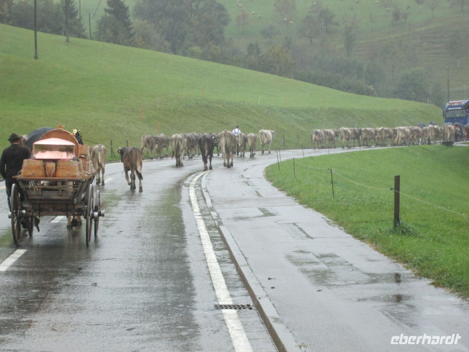 Kaum in Urnäsch angekommen, ging es mit 5 km/h für uns weiter. Aufgrund des schlechten Wetters und der angekündigten Minusgrade auf den Almen, wurden die Tiere ins Tal geholt, es war Almabtrieb. Im Appenzeller Land sagt man Alpfahrt dazu.
