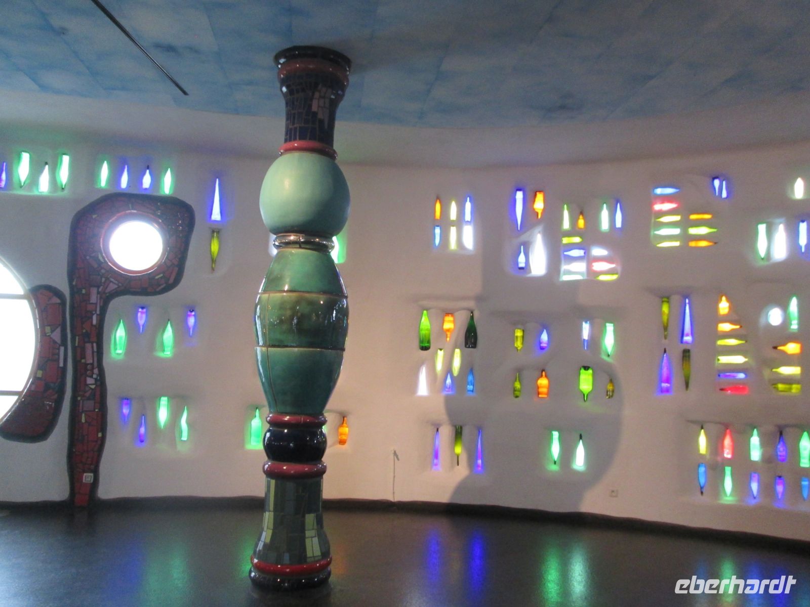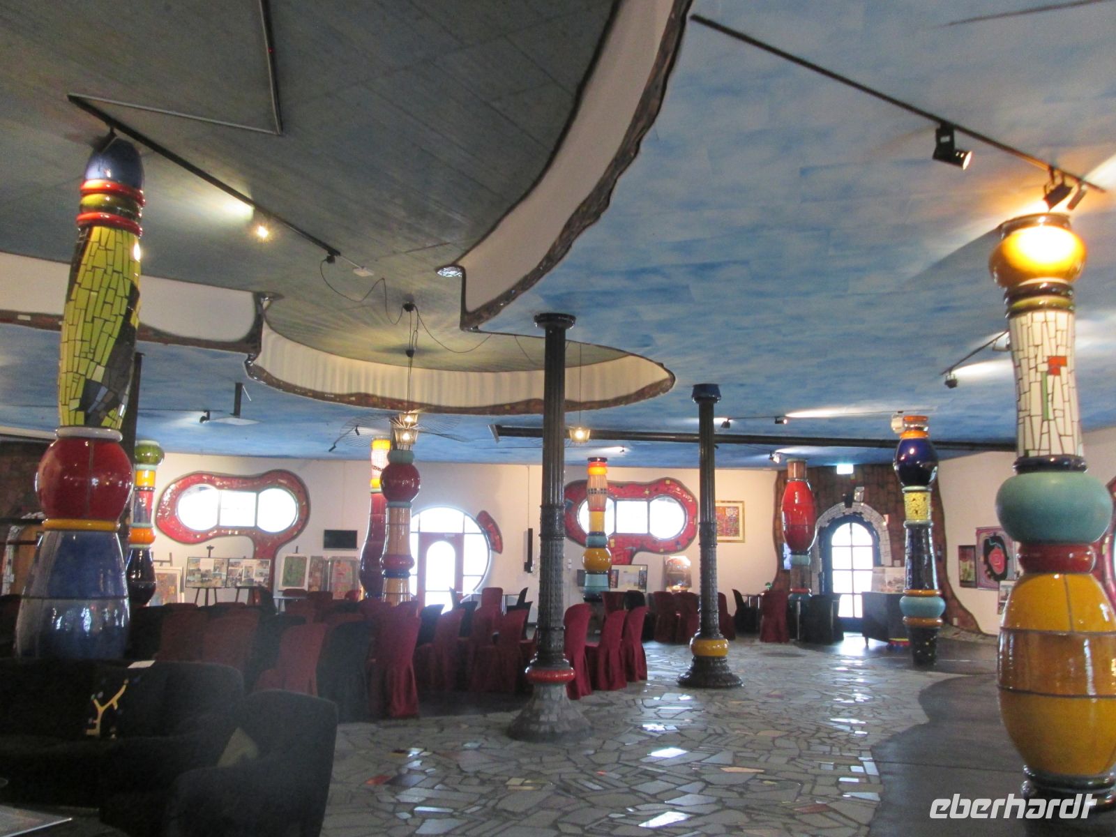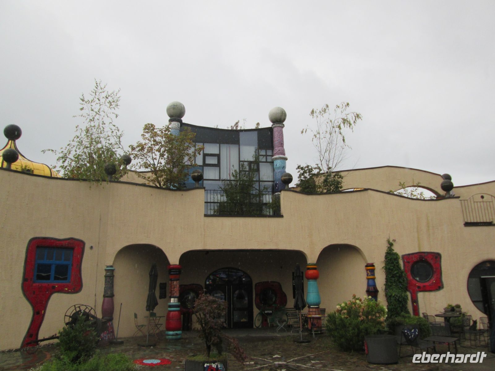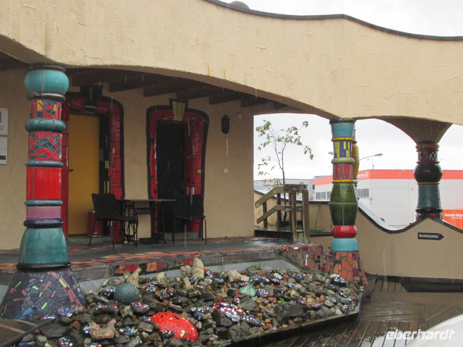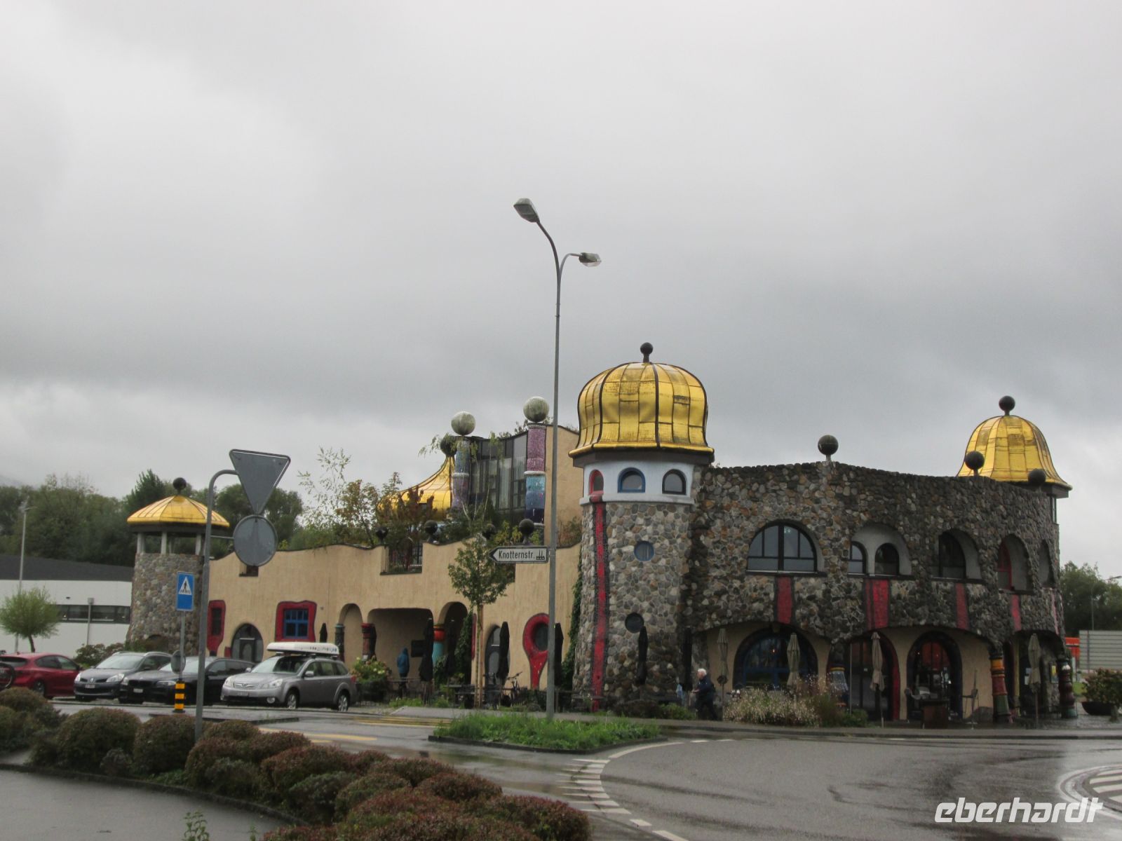 Im starken Regen wollte keiner durch die Stadt weiter spazieren, im Bus zu sitzen war da schon angenehmer. So starteten wir Richtung Bodensee. Die Markthalle im Stile Friedenreich Hundertwasser in Altenrhein war unser Ziel. Auf dem Weg dorthin wurde die ganze Geschichte erzählt, mit welchen Enthusiasmus Herbert Lindemann seinen außergewöhnlichen Traum umsetzte.