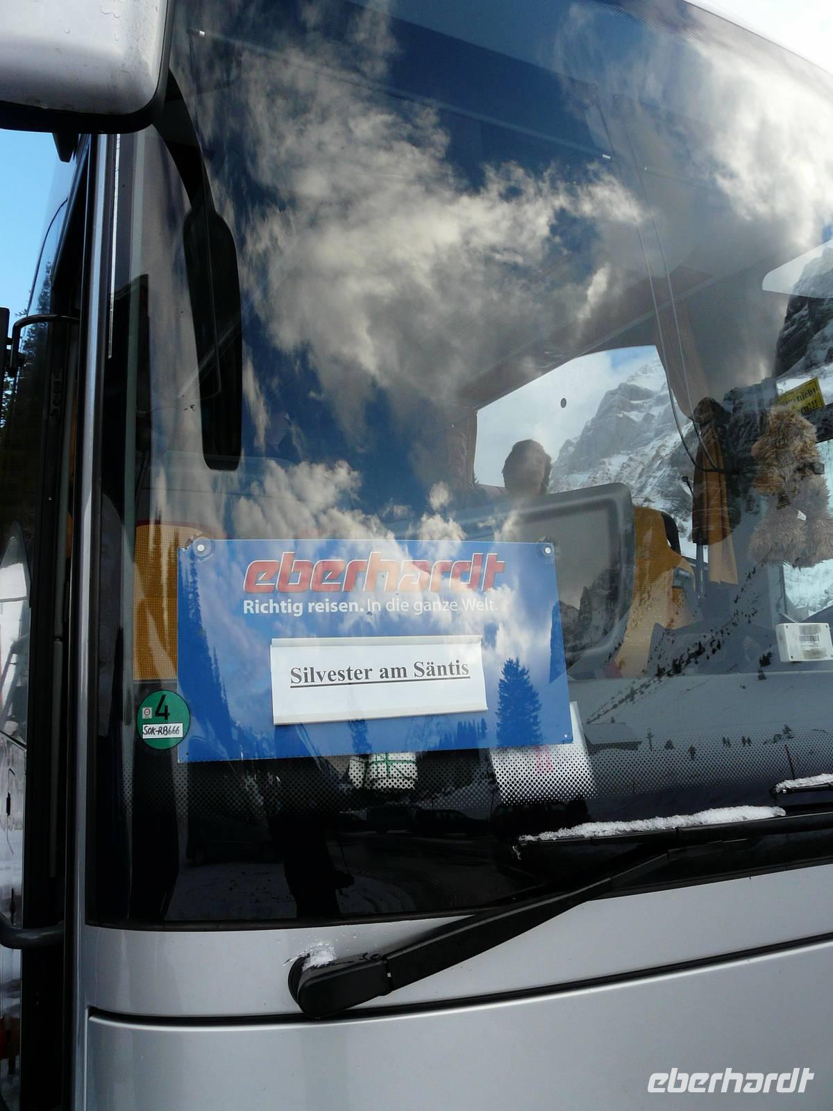 Die Reise begann wie immer mit der Abfahrt bzw. dem zuverlässigen Haustürtransfer von Eberhardt TRAVEL. Diesmal trafen wir uns nicht wie sonst um sechs, sondern erst um acht Uhr an den Eberhardt-Sonderfahrtenständen direkt am Dresdner Flughafen. Es war also schon hell, als uns der bequeme Reisebus, chauffiert von Herrn Alf Langer, vorbei an Chemnitz, Zwickau und Plauen zunächst ins Bayrische brachte. Unterwegs nahmen wir an einigen Stationen noch Reisegäste auf, bis wir bei der Abfahrt in Münchberg dann komplett mit 42 erwartungsfreudigen Silvestergästen gen Süden fuhren. Alles lief rund und planmäßig, mit Bordservice in den Pausen und gutem Reisetempo - bis wir in Nähe des Bodensees auf immer neue Stauwarnungen und schließlich das Ende eines Megaustaues selbst trafen. Hier aber half uns die besondere Ortskenntnis des Bus-Chauffeurs: Alf Langer lieferte ein grandioses Beispiel für gekonnte Stau-Umfahrung im Raum Lindau - er fand genau die noch nicht verstopften Straßen heraus und führte uns sicher bis fast an die österreichische Grenze. Erst als das Wasser des Bodensees im letzten Licht der untergehenden Sonne funkelte, waren wir dann zu Schritt-Tempo gezwungen, aber glücklicherweise nur ein Stück. Auch das konnten wir ganz entspannt überstehen, denn neben uns gab es - trotz hereinbrechender Dunkelheit im Licht des Vollmondes noch schöne Blicke auf das „schwäbische Meer", den drittgrößten See Mitteleuropas. Nachdem wir ein Stück der 28 km österreichischen Ufers noch im „Stopp-and-go" zurückgelegt hatten, hatten wir ab Ortsausgang von Bregenz wieder freie Fahrt und erreichten zur Abendbrotszeit unser Ziel, das Berghotel Schwägalp. Nach schnellem Einchecken und kurzem Frischmachen gab es dann einen Empfangs-Aperitiv von der Wirtsfamilie und ein leckeres Schweizer Abendessen.