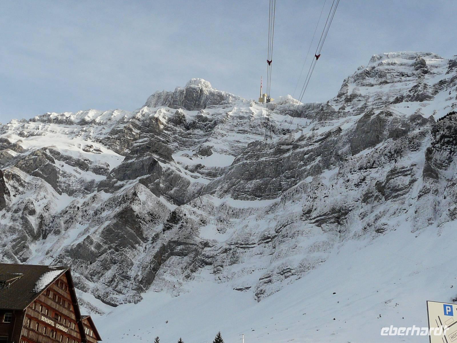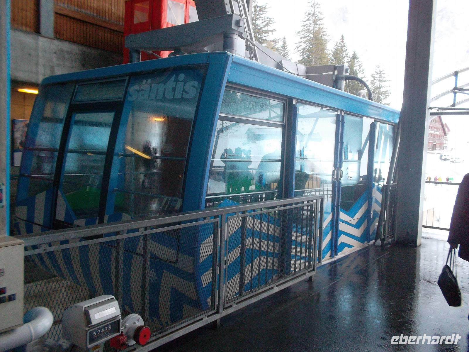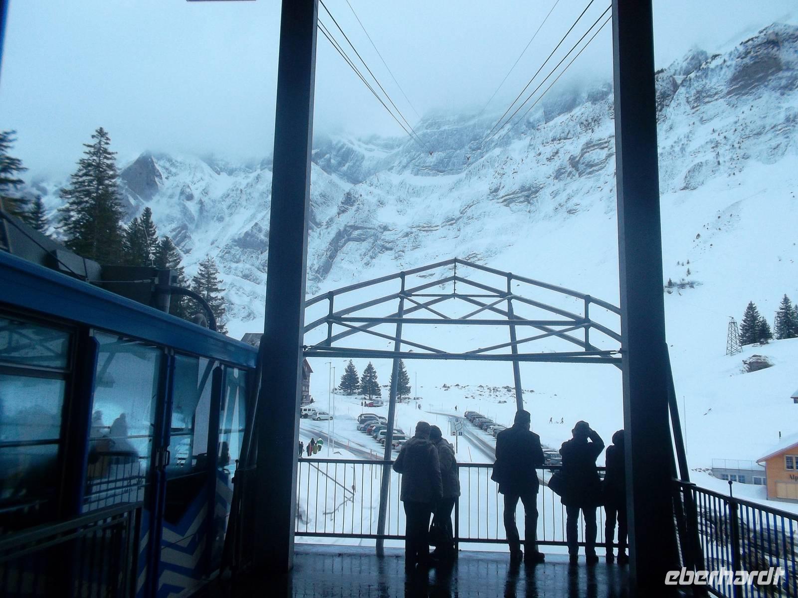 Der heutige Morgen versprach gleich eine besondere Überraschung: Eine Auffahrt auf den höchsten Punkt der Appenzeller Alpen, den Säntis - und ein Frühstück im dortigen Panoramarestaurant. Gleich die erste Auffahrt der Säntisbahn um 08.30 Uhr konnten wir nehmen - nachdem ich für alle Reisteilnehmer die Seilbahntickets geholt hatte, ging es in die Talstation der seit 1935 betriebenen Seilbahn, die kurz Säntisbahn genannt wird. Nach über 50 Jahren war damals ein Projekt realisiert worden, das seit dem Jahre 1886, als die Appenzellerbahn Appenzell erreicht hatte, in Planung gewesen war. 85 Personen fasste die Kabine - recht schnell waren die beisammen und wir alle schwebten diesmal in tatsächlich „luftige" Höhen. 2502 m hoch ist der zum Alpstein-Massiv der Appenzeller Alpen gehörende Säntis - eine Landmarke, die bei gutem Wetter selbst vom Schwarzwald zu sehen ist - wie auch ein Blick zum Schwarzwald vom Säntis aus möglich ist - gute Sicht vorausgesetzt. Nun, leider hatten wir die nicht, denn bei knapp acht Grad minus war auf der Bergspitze heftiges Schneetreiben. Wir genossen dennoch unser leckeres Frühstücksbuffet mit vielen Sorten Wurst und deftigem Käse. Da das Betreten der Terrasse im Schneetreiben äußerst ungemütlich war, trafen wir uns nach dem Frühstück wieder im kleinen Museum der Bergstation und zur Abfahrt. Erst auf Schwägalphöhe und darunter wurde das Wetter besser.
