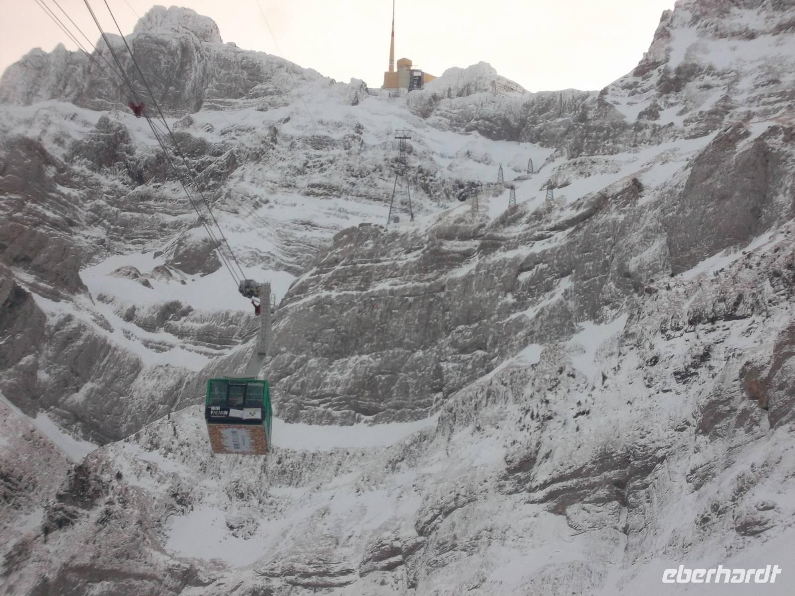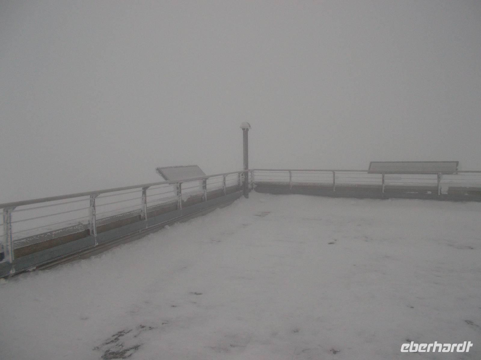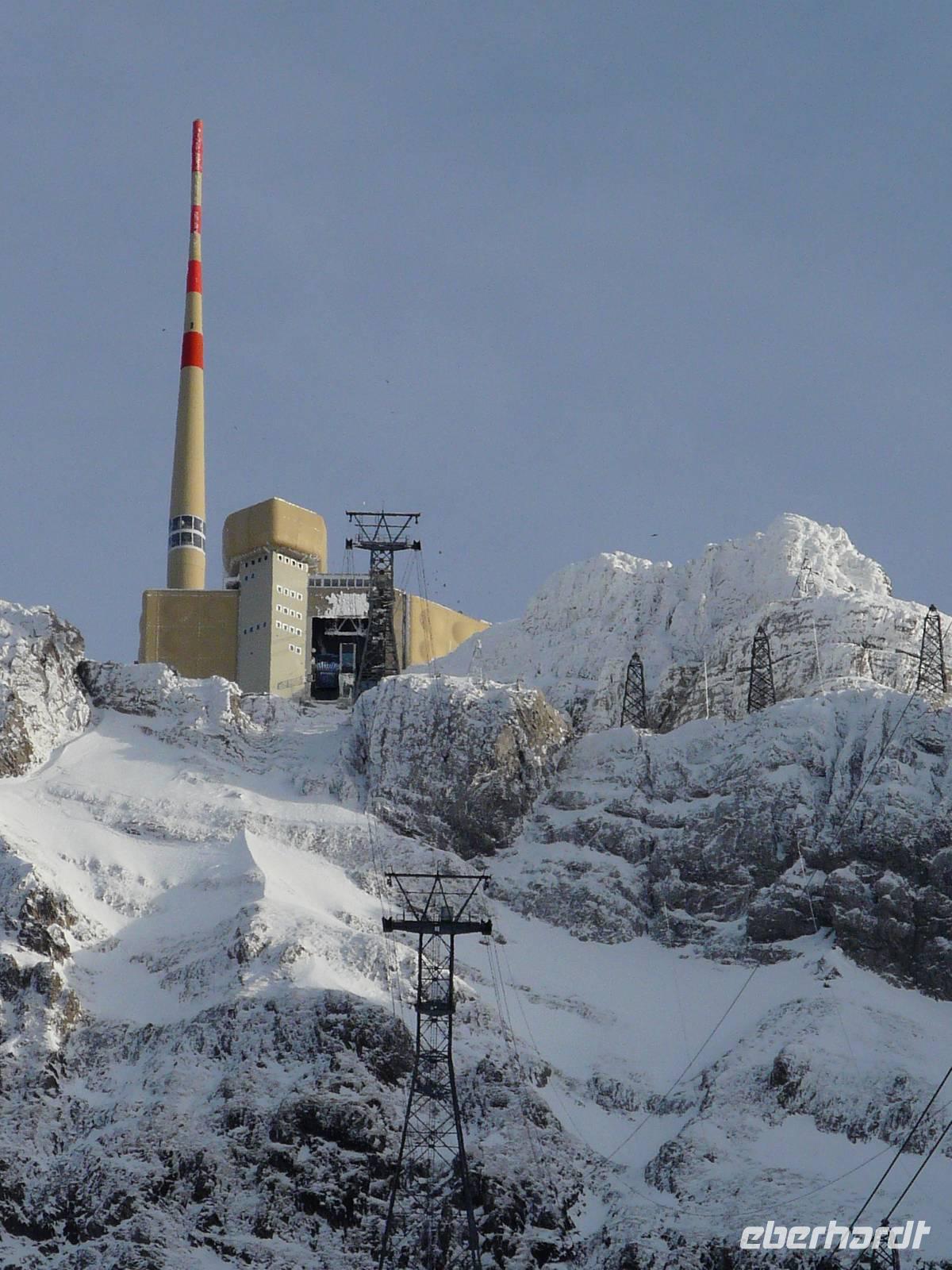 Der heutige Morgen versprach gleich eine besondere Überraschung: Eine Auffahrt auf den höchsten Punkt der Appenzeller Alpen, den Säntis - und ein Frühstück im dortigen Panoramarestaurant. Gleich die erste Auffahrt der Säntisbahn um 08.30 Uhr konnten wir nehmen - nachdem ich für alle Reisteilnehmer die Seilbahntickets geholt hatte, ging es in die Talstation der seit 1935 betriebenen Seilbahn, die kurz Säntisbahn genannt wird. Nach über 50 Jahren war damals ein Projekt realisiert worden, das seit dem Jahre 1886, als die Appenzellerbahn Appenzell erreicht hatte, in Planung gewesen war. 85 Personen fasste die Kabine - recht schnell waren die beisammen und wir alle schwebten diesmal in tatsächlich „luftige" Höhen. 2502 m hoch ist der zum Alpstein-Massiv der Appenzeller Alpen gehörende Säntis - eine Landmarke, die bei gutem Wetter selbst vom Schwarzwald zu sehen ist - wie auch ein Blick zum Schwarzwald vom Säntis aus möglich ist - gute Sicht vorausgesetzt. Nun, leider hatten wir die nicht, denn bei knapp acht Grad minus war auf der Bergspitze heftiges Schneetreiben. Wir genossen dennoch unser leckeres Frühstücksbuffet mit vielen Sorten Wurst und deftigem Käse. Da das Betreten der Terrasse im Schneetreiben äußerst ungemütlich war, trafen wir uns nach dem Frühstück wieder im kleinen Museum der Bergstation und zur Abfahrt. Erst auf Schwägalphöhe und darunter wurde das Wetter besser.