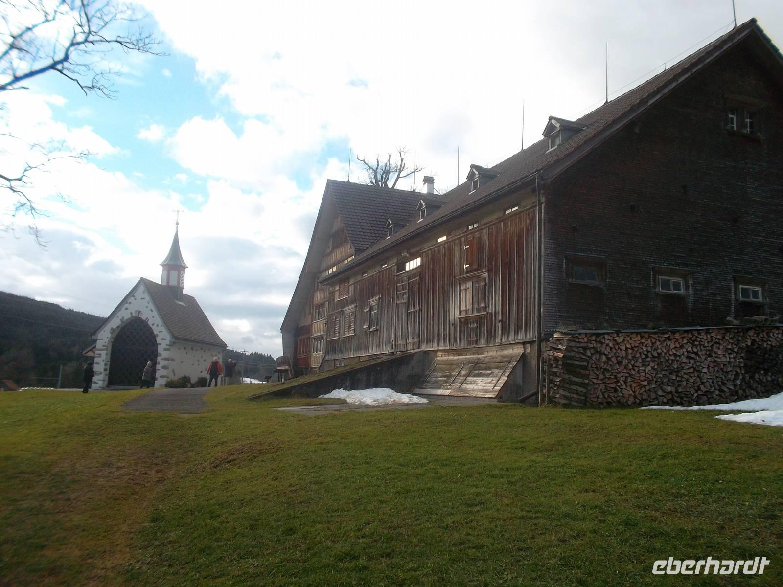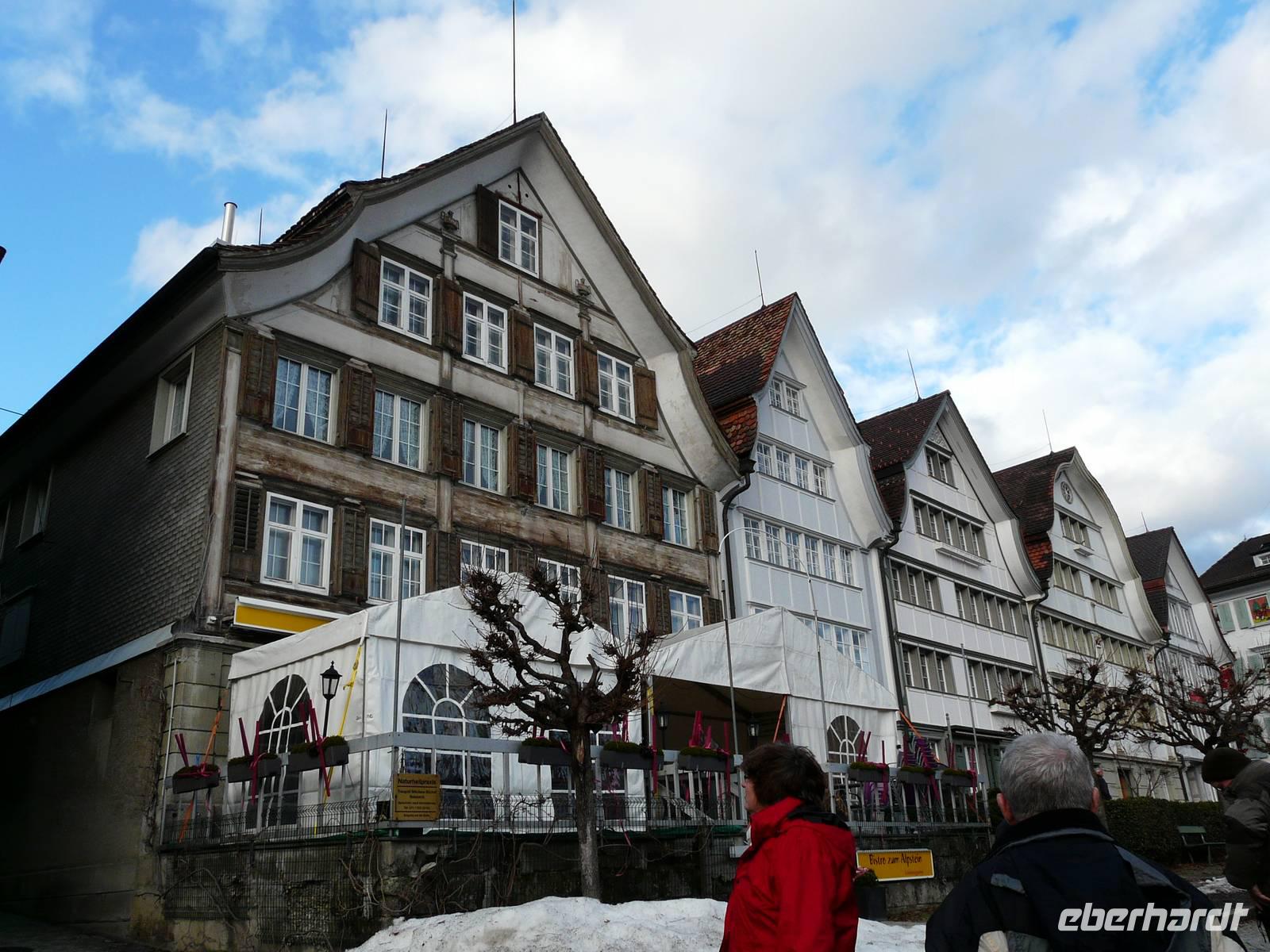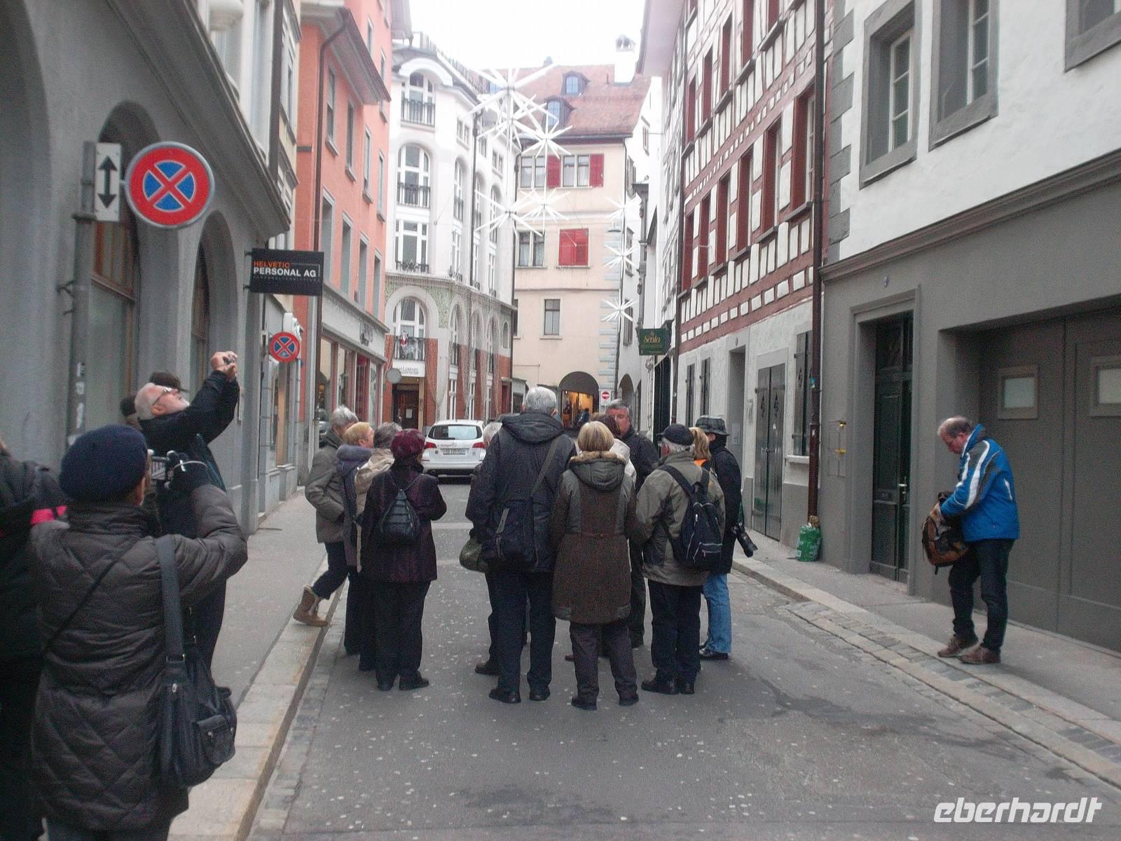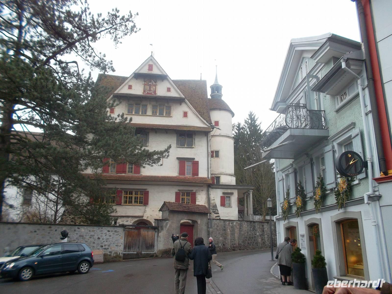 Auf der Weiterfahrt gab es wieder ein kleines Extra im Eberhardt-Stil: Chauffeur Alf Langer brachte uns dicht an die abgesperrte Altstadt von Herisau, dem Hauptort von Innerrhoden. Hier sahen wir auf einem Spaziergang durch das hübsche Zentrum rund um den Kirchenberg erneut viele Silvesterchläuse, deren Kostüme bei gleichem Grundinhalt doch etwas von denen der Urnäscher abwichen. Nächstes Ziel war dann die Schaukäserei für den würzigen Appenzeller Käse im Ortsteil Stein. Hier kann man zwar - aus Hygienegründen - nicht direkt die „Werkhalle" betreten, in der das streng-würzige, weit über die Landesgrenzen der Schweiz bekannte Milchprodukt hergestellt wird. Durch Glasscheiben konnten wir aber einen Blick auf die Produktionsstätte werfen und erfuhren dabei, wie die Milch mit Fermenten durchsetzt zum Gerinnen gebracht, gebrochen und neu zusammengesetzt wird, bis man sie in die Form der runden Käselaibe presst und - regelmäßig mit „geheimer" Gewürzmischung bestrichen und immer wieder gewendet - lange Zeit reifen lässt. Der Erfolg dieser Prozedur lässt sich riechen und - schmecken. Wir konnten ein paar Käsebrocken des klassischen Appenzeller verkosten und auch die verschiedenen Reifestufen im angeschlossenen Geschäft kaufen. Vielleicht hat der würzige Landkäse aus der Ostschweiz nun ein paar Fans mehr, denn es gibt ihn auch mitunter bei uns in den Supermärkten zu kaufen - im speziellen Käseladen sowieso!