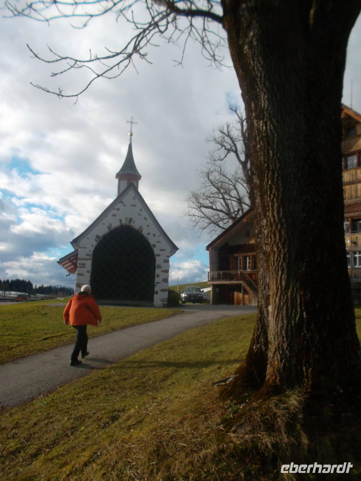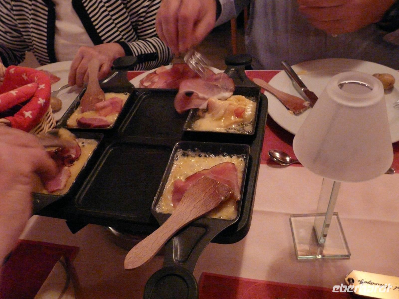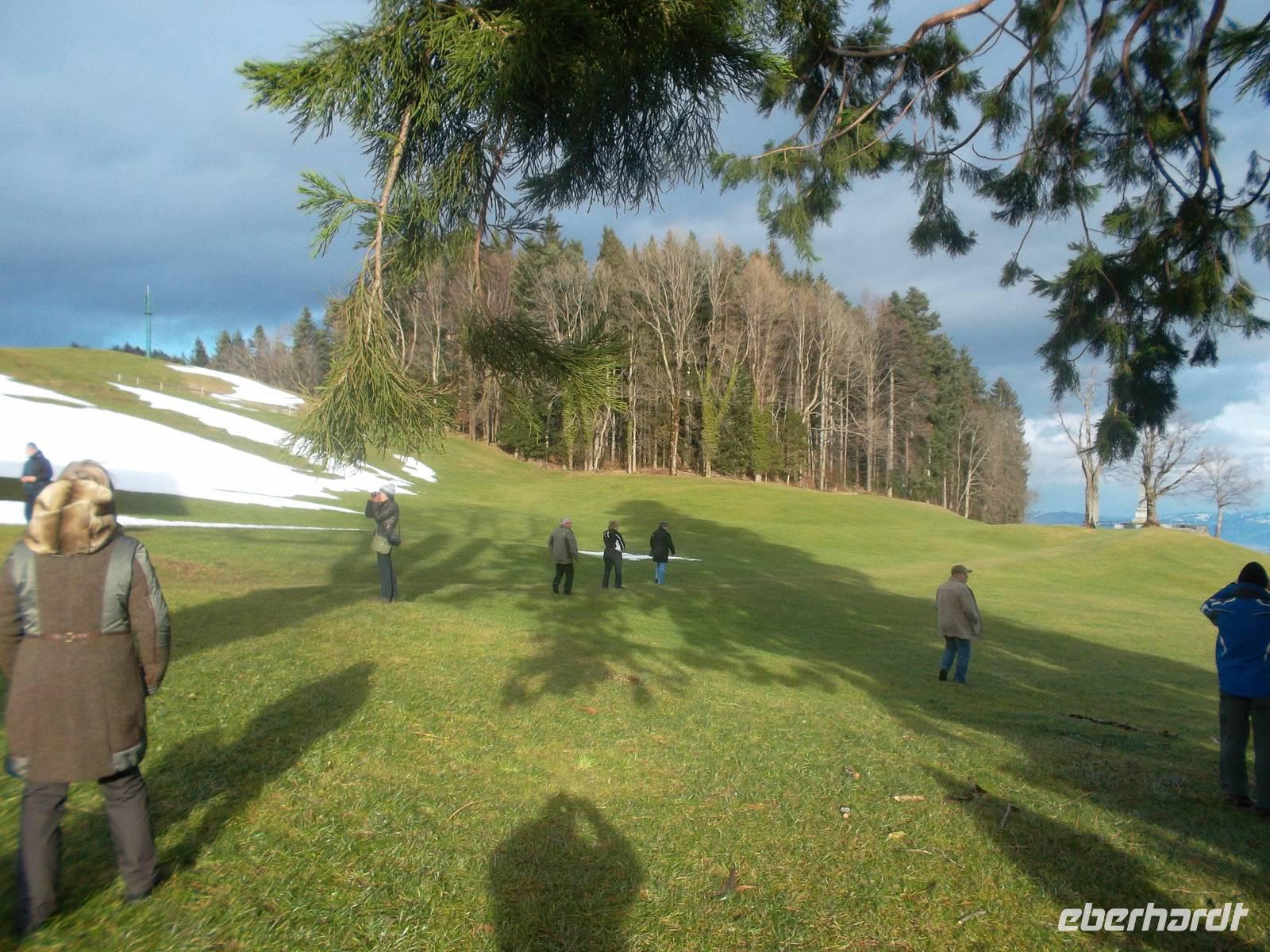 Gegen Mittag dann fuhren wir im Bus mit unseren interessierten Gästen ins Dorf Appenzell. Als 1597 im Religionsstreit der Kanton Appenzell in zwei selbständige Halbkantone - Außerrhoden und Innerrhoden - geteilt wurde, blieb die etwas über 5000 Einwohner zählende Landgemeinde Hauptstadt des katholischen Außerrhoden. Wir spazierten zunächst zum Landgemeindeplatz, wo sich bis vor kurzem noch jährlich alle wahlberechtigten Bürger versammelten - erst 1990 gab es hier auch das Wahlrecht für Frauen! - und von hier durch die Hauptgasse mit ihren hübschen Häusern. Phantasievoll bemalt und oft mit den für die hiesige Alpenarchitektur typischen „Schweifgiebeln" versehen, war es eine Gasse der Verlockungen, denn die Auslagen der geöffneten Geschäfte und Kaffees hielten neben zahlreichen Souvenirs und Stickereien auch Süßigkeiten und leckere Torten bereit. Eine kleine Kapelle am Anfang der Hauptgasse, Geschäfte und Patrizierhäuser sowie das hübsche Rathaus und die wuchtige Mauritiuskirche machen den Reiz des kleinen Ortes aus. Bevor wir wieder zurück in unser Berghotel fuhren, hatten wir noch ein kleines Extra im Sinne der Eberhardt „Richtig Reisen!"-Philosophie für unsere Gäste: wir fuhren zum Stoss-Pass! Hier hatte nicht nur im Jahre 1405 in der „Schlacht am Stoss" ein kleines Heer Appenzeller Bauern über eine gewaltige Übermacht des Tiroler Herzogs und des St.Galler Fürstbischofs gesiegt - woran heute noch eine Kapelle und ein Gedenkstein erinnern - hier gibt es auch den schönsten und umfangreichsten Blick über das ganze Appenzeller Land. Nach Stopp und kleiner Wanderung zum Gedenkstein legten wir auf der Weiterfahrt noch einen halbstündigen Stopp im denkmalgeschützten Ort Gais mit seinen Schweifgiebelhäusern ein. Am frühen Abend dann, nach der Rückkehr ins Hotel, trafen wir uns um 18.00 Uhr zu einem gemeinsamen, romantischen Spaziergang auf dem „Laternliweg". Der festgestampfte Weg durch den verschneiten Wald „umrundet" sozusagen das Berghotel Schwägalp, wird zu bestimmten Zeiten abends von an Pfosten aufgehängten Laternen erleuchtet und mittendring gab es eine Überraschung: Mitarbeiter des Hotels schenkten Punsch und Glühwein aus. Allen Teilnehmern hat der Glühwein geschmeckt - aber ein besonderes Abendessen bevorstand, fanden sie schnell den Weg zurück. Das Abendessen war ein typisches Schweizer „Raclette" - auf einem Öfchen wird deftiger Alpenkäse in kleinen Tiegelchen zum Schmelzen gebracht und warm zusammen mit Pellkartoffeln und verschiedenen Schinken- und Fleischspezialitäten gegessen - ein Gedicht! Dazu schmeckte natürlich Schweizer Wein - eigentlich immer eine Empfehlung, denn als Weinnation ist die Schweiz nun wirklich nicht gerade bekannt, obwohl seit der Römerzeit im Alpenland sehr erfolgreich und schmackhaft Trauben angebaut und gekeltert werden.
