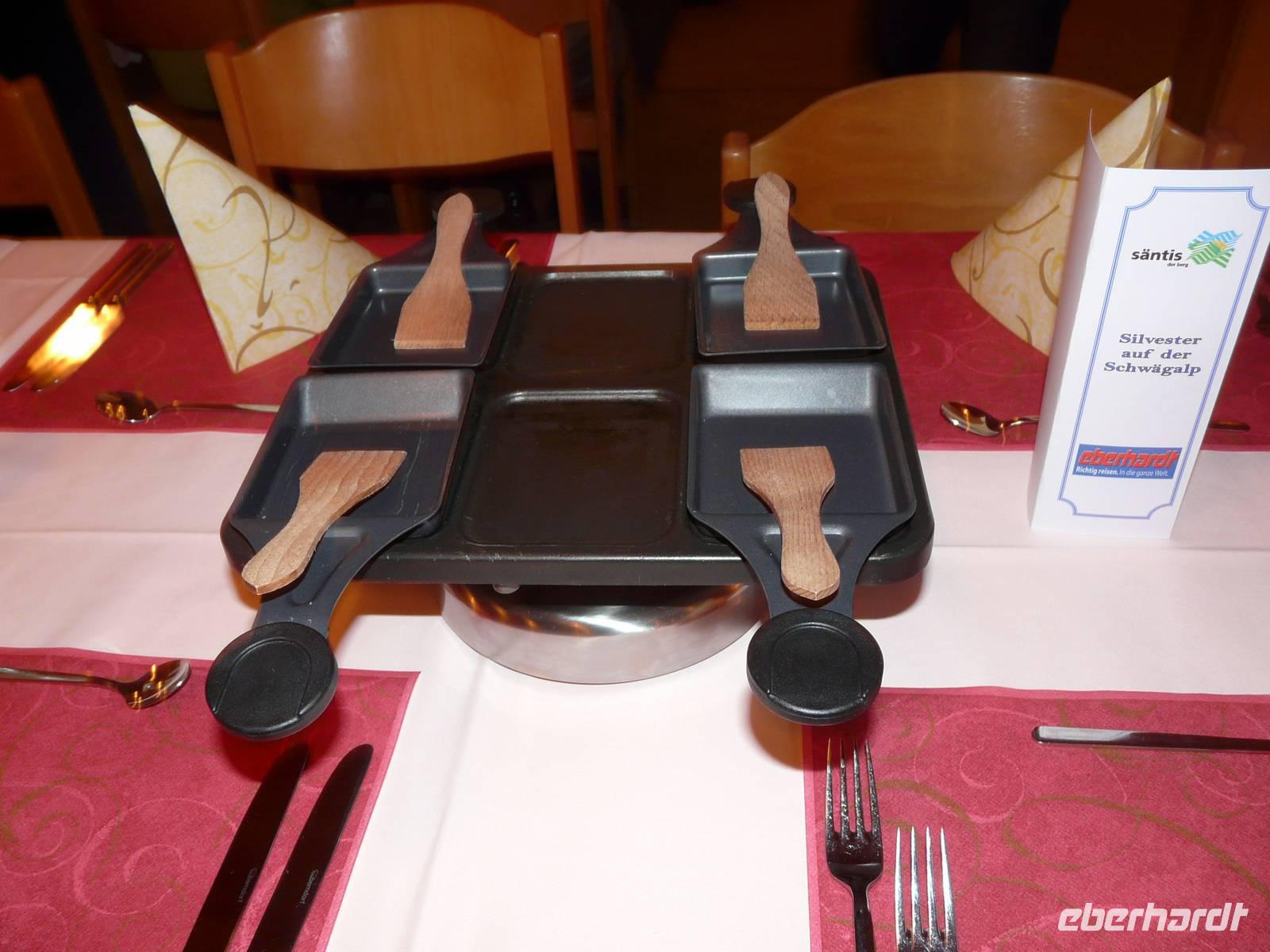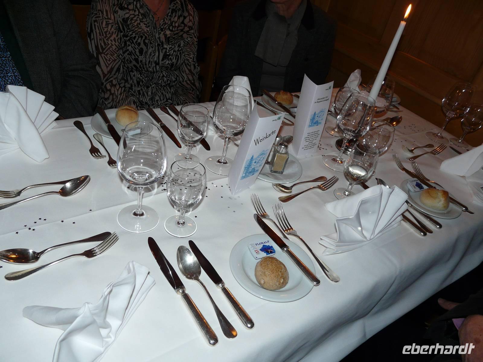 Wir kehrten zu unserem Berghotel „Schwägalp" zurück und hatten nun Freizeit - für Spaziergänge in der freundlichen und sonnigen Umgebung oder zum Ausruhen und „Vorbereiten" auf die Silvesternacht! Die Silvesterfeier begann um 18.30 Uhr mit Aperitiv und Häppchen, untermalt durch musikalische Einlagen des Musikduos „Wirbelwind", das bei dieser Feier für Unterhaltung sorgen sollte. Nachdem wir alle schon einmal miteinander angestoßen hatten, begann gegen 19.00 das Sechs-Gänge - Abendessen. Unsere Eberhardt-Gruppe saß in einem festlich geschmückten separaten Saalteil, daneben viele Schweizer und Individualgäste des Hotels. Essen und Service waren wirklich hervorragend und es kam richtig Stimmung auf! Zwischendurch habe ich noch - nach Erlaubnis durch den „Schwägalp"-Wirt, Wunderkerzen und Tischfeuerwerk verteilt - denn ein bissen „Kolorit" gehört schon zu einer Silvesterfeier. Natürlich aber muß alles - gerade in einem traditionellen Bauz mit sehr viel Holz - auch den Sicherheitsaspekten genügen.