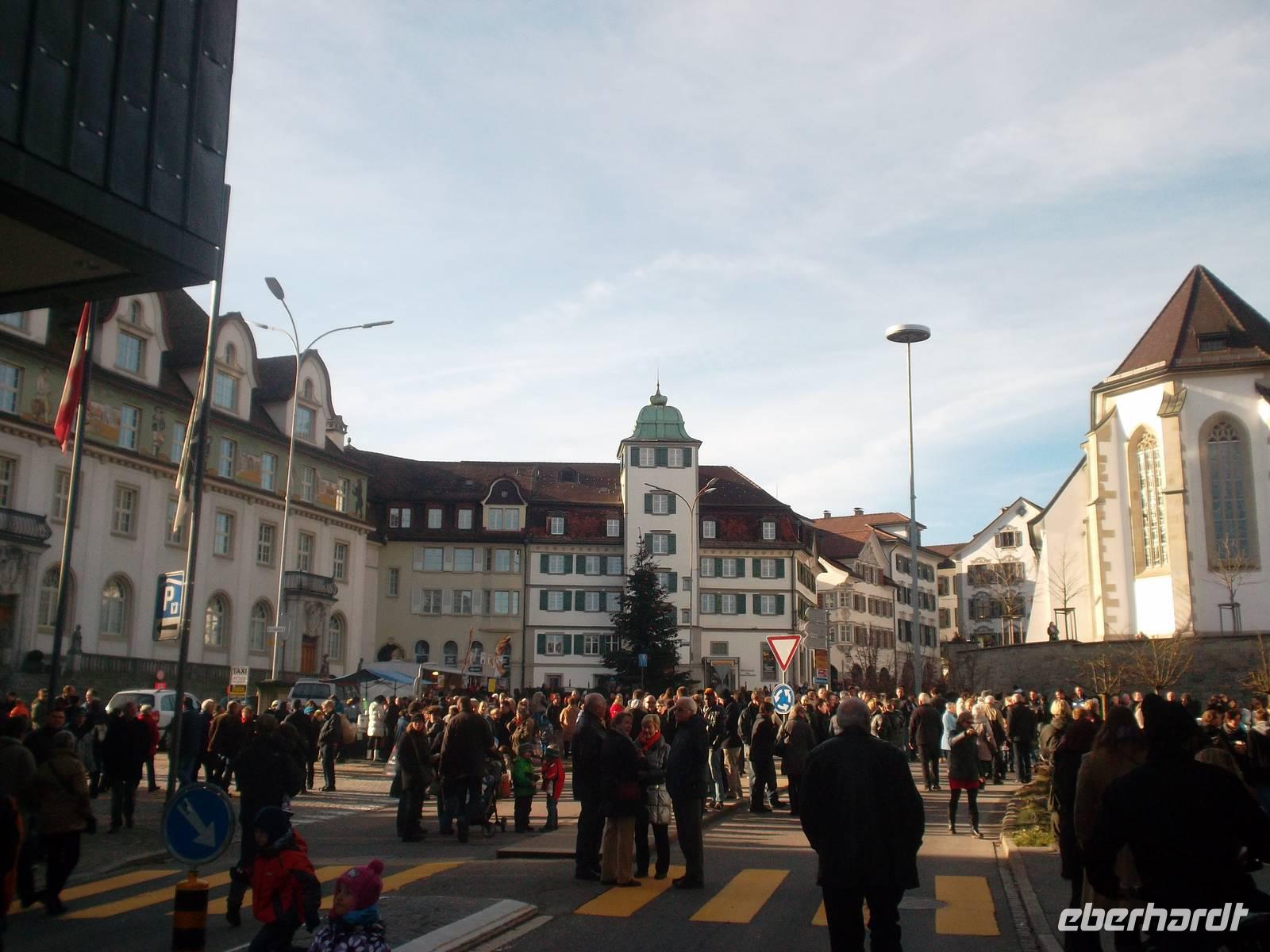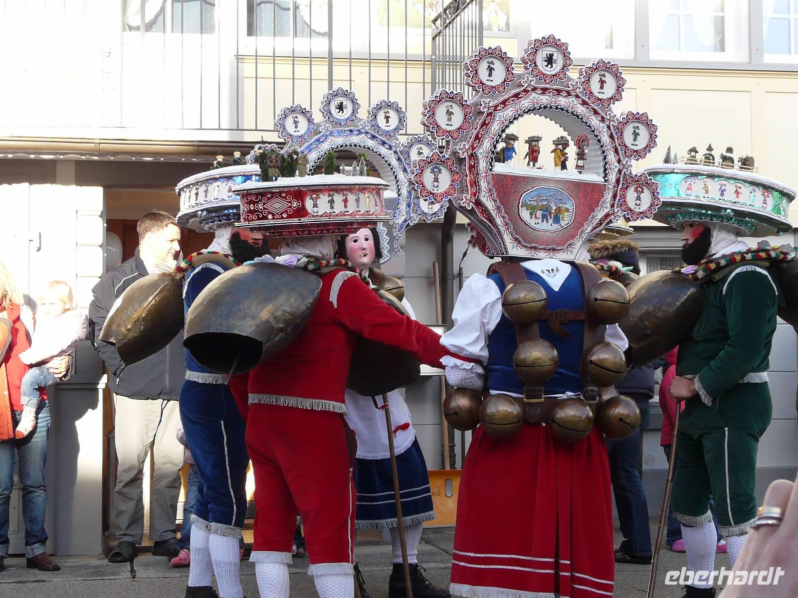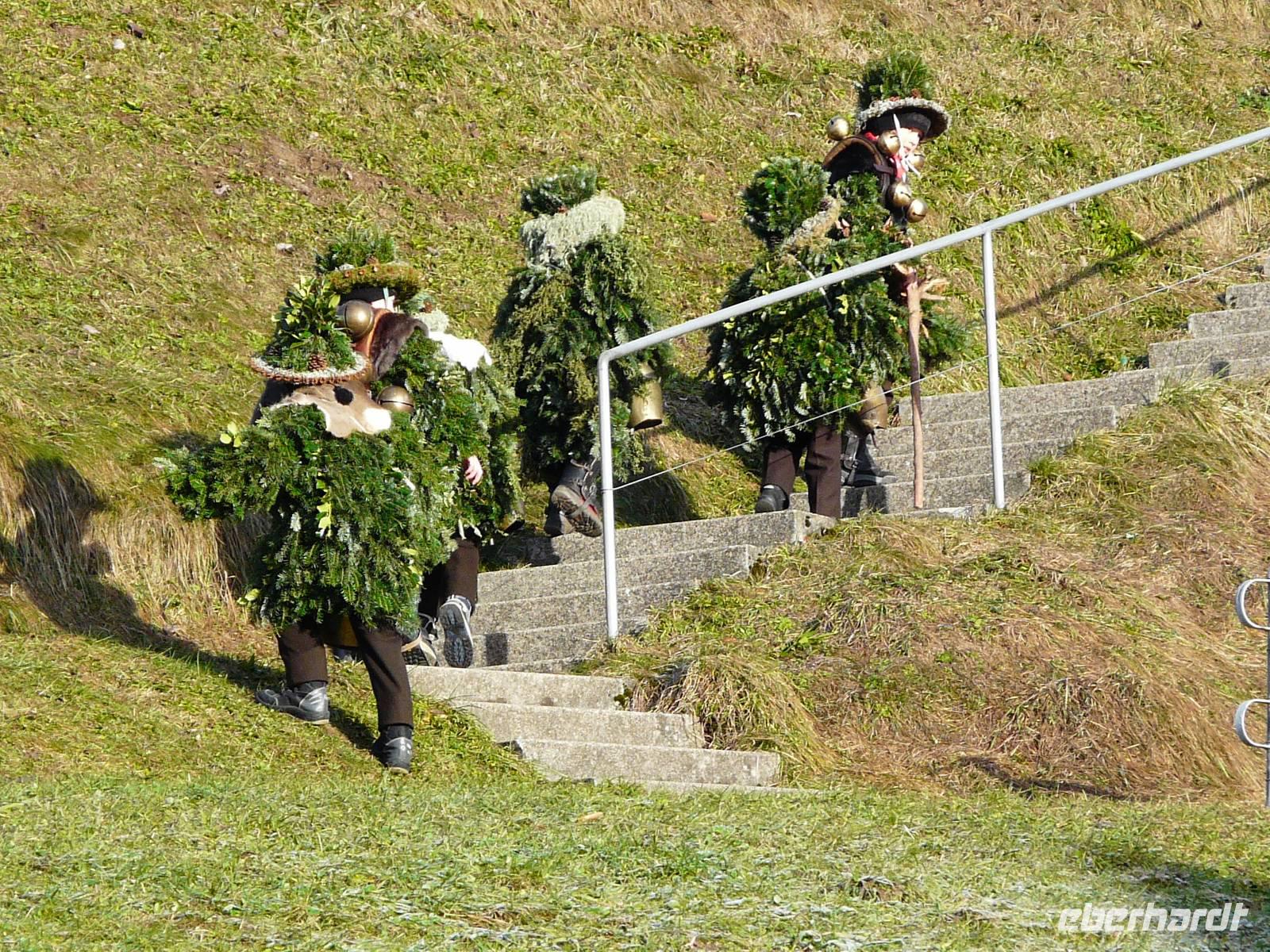 Dieser „Knaller" war ein uralter Silvesterbrauch, der hier gepflegt wird und viele Touristen anlockt: am Silvestertag, schon frühmorgens beginnend, organisieren sich die jungen Männer der Gegend (Frauen und Mädchen sind erst seit kurzem und nur beim Nachwuchs zugelassen) in Gruppen, die kostümiert durch die Straßen ziehen, an vielen Häusern verhalten und auf traditionelle Weise Anwohnern und Gästen einen guten Jahreswechsel und Glück im beginnenden Jahr wünschen. Das „Silvesterchlausen" geht auf uralte Traditionen und heidnische Bräuche zurück und war anfangs von der Kirche nicht gern gesehen. Nach den Religionsstreitigkeiten dieses Gebietes, vorwiegend im 16. und 17. Jahrhundert hat es sich in einigen Gegenden aber bis heute erhalten - so im protestantischen Appenzeller-Kanton Innerrhoden um den Halbkantonshauptort Herisau. In Urnäsch zu Füßen des Säntis ist der Auftritt der verschiedenen Chläuse eine jährlich ausgeführte und von Touristen bereits sehnsüchtig erwartete Tradition. Ab etwa zehn Uhr konnten wir hier teilnehmen: unser Bus parkte auf einem kurz vor dem Ortskern extra eingerichteten Platz und wir suchten zu Fuß die Begegnung mit der Appenzeller Tradition. Schon bald konnten wir dem Schellenklang nachgehen und mehrere Prozessionen von Silvesterchläusen entdecken. Während der Nachwuchs - in Tannenzweig-Kostüme mit Wurzelnasen gehüllte Jungen von vielleicht zehn, elf Jahren - zunächst auf dem Weg zu den außerhalb vom Ortskern gelegenen Häusern war, trafen wir im Ortskern zunächst auf die „schönen" Chläuse. Der Überlieferung nach unterteilen sich die Silvesterchläuse, die übrigens immer als Gruppe - „Schuppel" genannt - auftreten, in drei Kategorien. Die Kostüme und Masken der „wüeschten" sind grob, furchterregend und aus Naturmaterialien gefertigt, die „Wüescht-Schönen" tragen zu Tannenzweig-outfit Masken und große „Hüte" mit kunstvollen Aufbauten und die „Schönen „ sind als Frauen mit bunten Kleidern und schönem Kopfputz kostümiert. Und wir hatten in Urnäsch fast eineinhalb Stunden Zeit für einen ausführlichen Ortsrundgang bei wundervollem Wetter. Also los - denn überall entdeckten wir die vorher per Erzählung im Bus eingeführten und erklärten „Schuppel" der Silvesterchläuse mit ihrem uralten Brauchtum. Die Gäste waren total begeistert. Immer wieder ertönte das „Zäuerli" - eine zu den „Alpenjodlern" gehörende Art von Gesang. Das Appenzeller Jodeln hat lange Tradition und gehört zu der Form von Musik, in der einst durch lautes Singen bestimmter Tonsilbenfolgen ohne Worte und mit großem Tonumfang in bergigen Gegenden über große Entfernungen hinweg Nachrichten übermittelt und Lebenszeichen gegeben wurden. Auf diese melodische Weise wünschen hier die verschieden kostümierten Silvesterchläuse den Menschen einen guten Jahreswechsel mit Glück und Freude im anbrechenden Jahr. Nach unzähligen Fotos - auch unsere Fotogalerie kann nur eine kleine Auswahl der Schnappschüsse zeigen - fanden wir uns wieder am Bus zusammen.